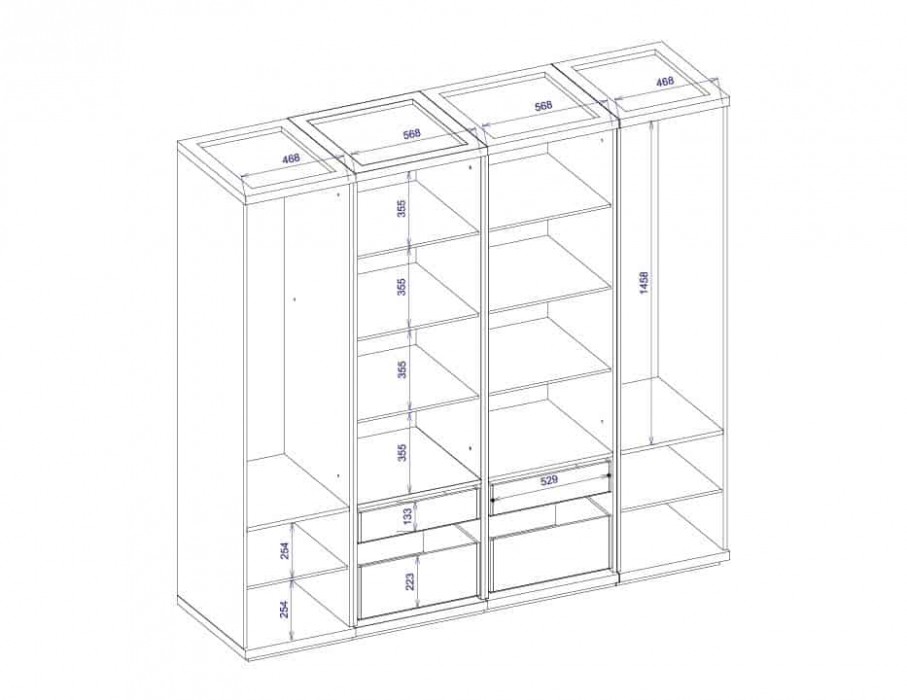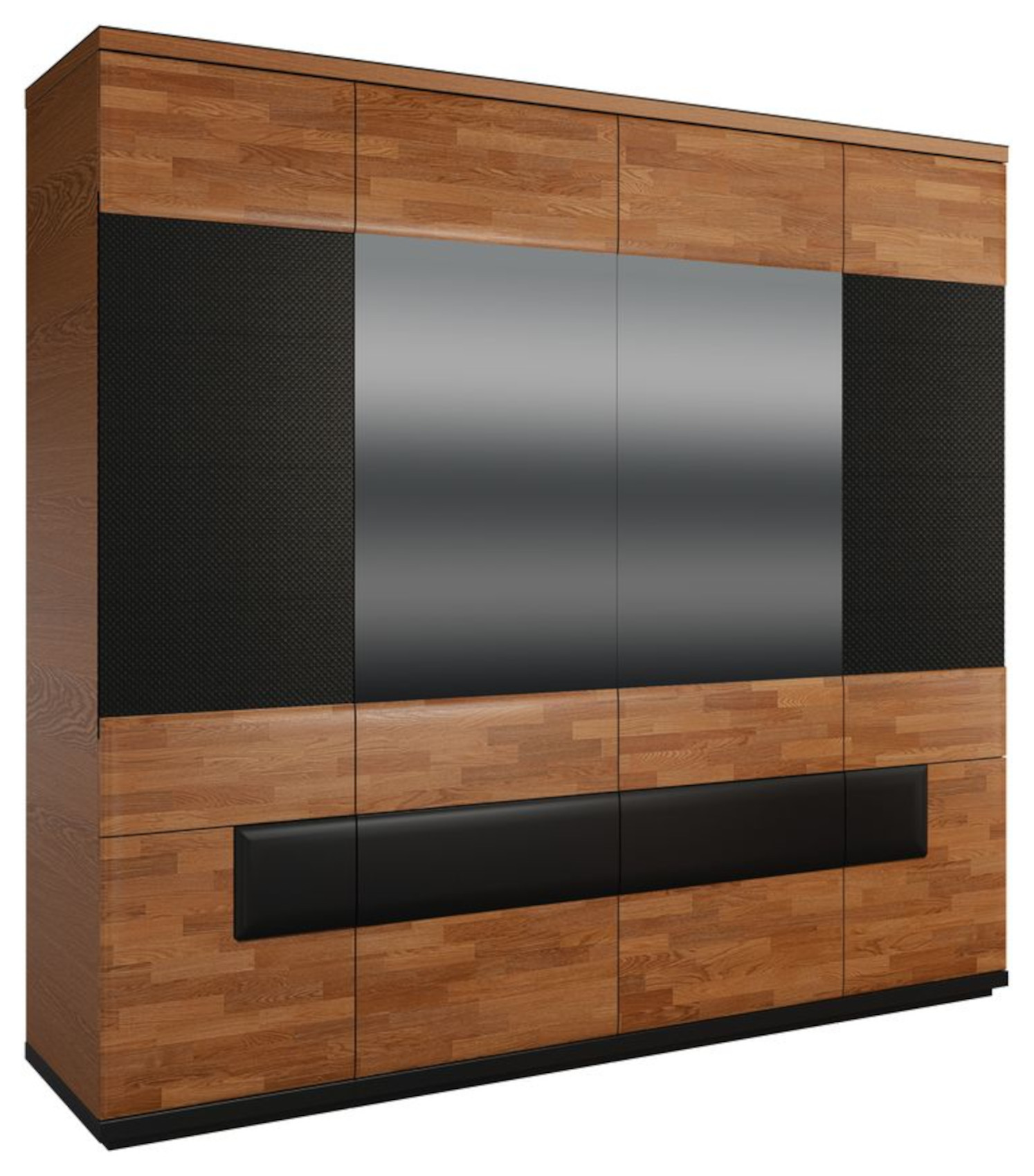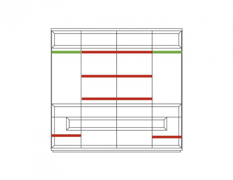 Šatní skříň je rozdělena do 4 částí. Za krajními dveřmi, které jsou částečně čalouněné, jsou 2 šatní tyče. Uprostřed jsou zrcadla a do vnitřního prostoru je vloženo 6 lakovaných polic. Ve spodní části skříně jsou 2 krajní plná dvířka se 2 policemi a 4 zásuvky na kovových pojezdech.