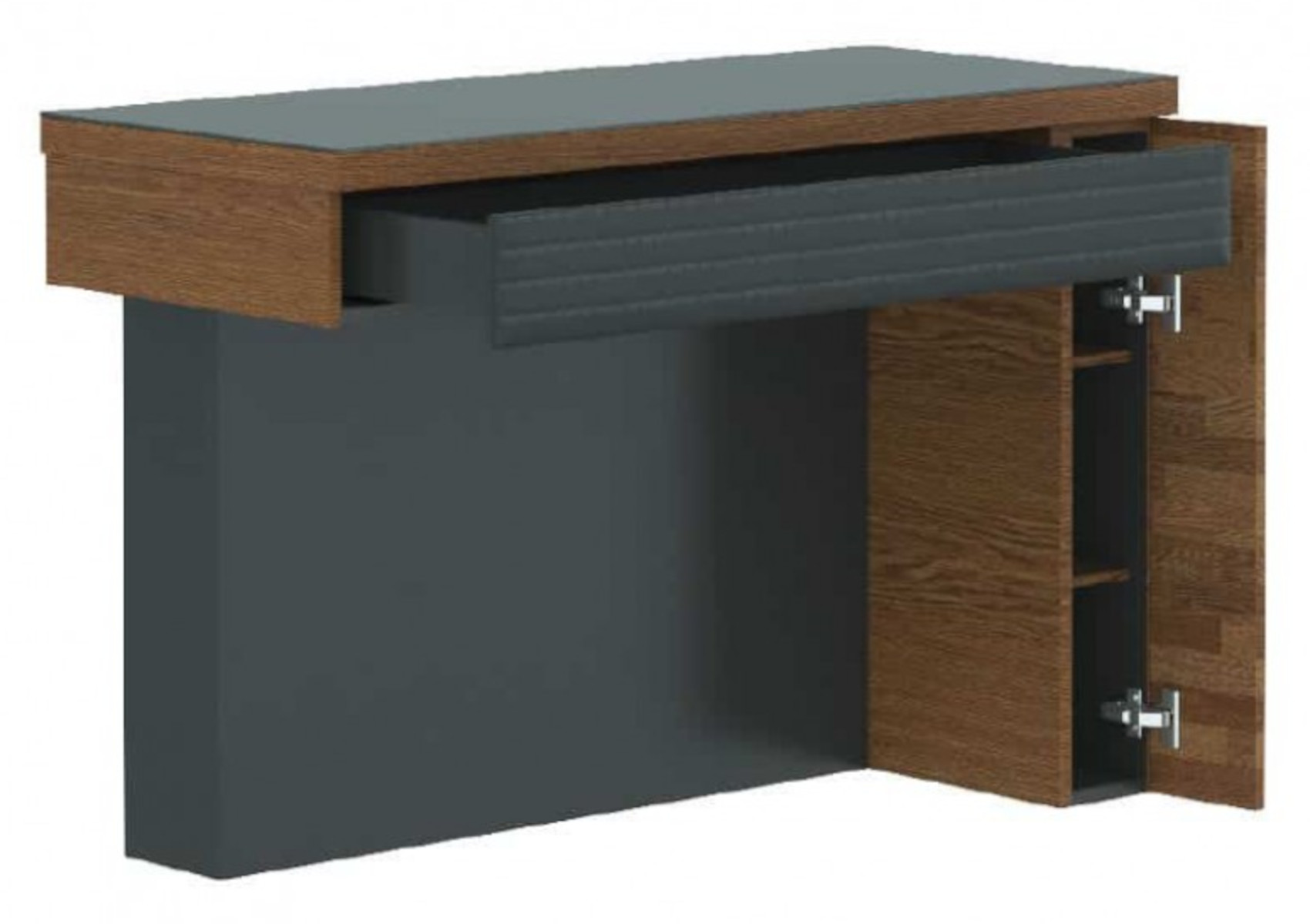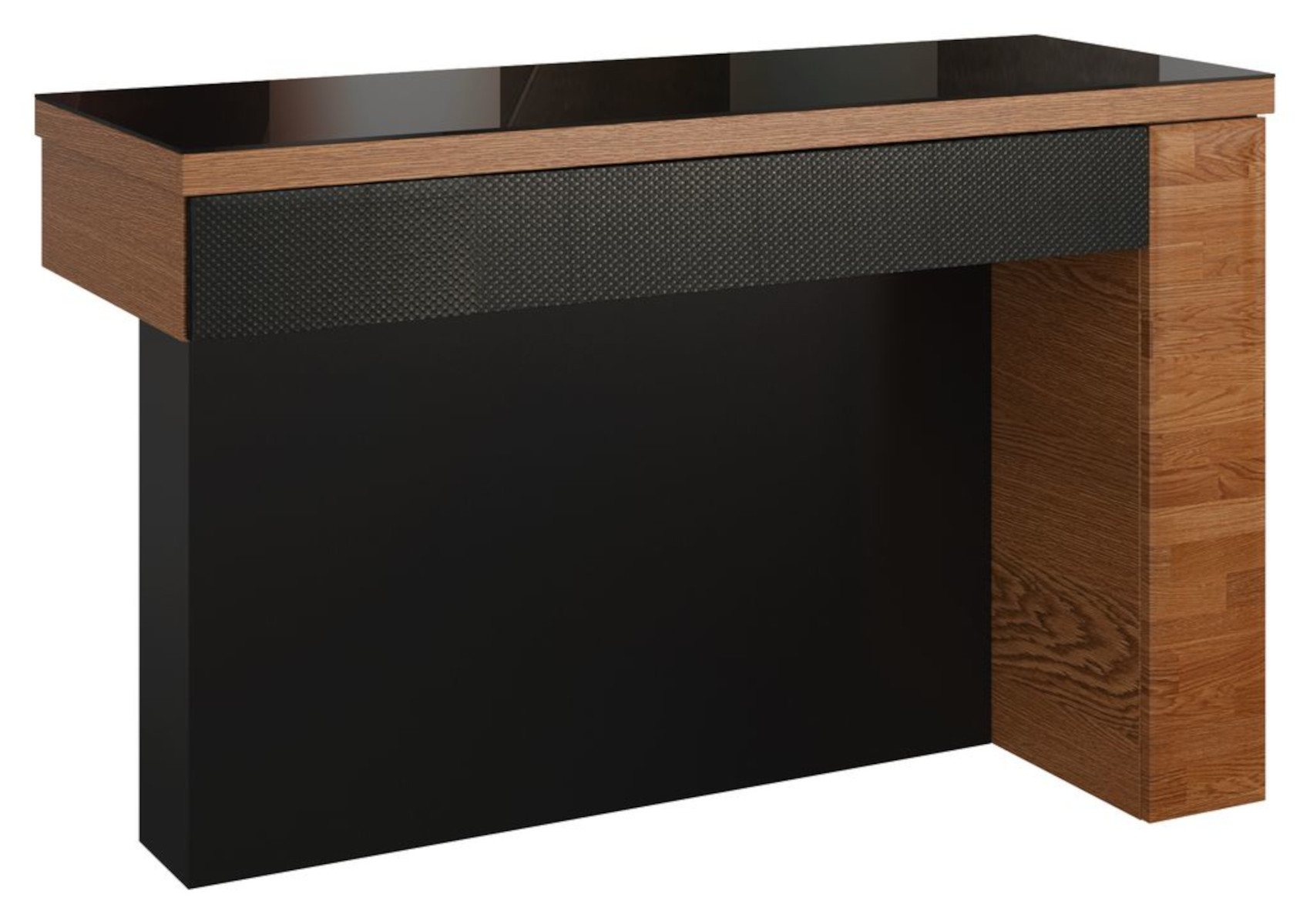 Luxusní toaletní stolek Verano je vyroben z masivního dubového dřeva a přírodní dubové dýhy s černými lakovanými prvky. Čtyřvrstvá technologie povrchového moření a lakování dává nábytku jedinečný design s výraznou strukturou lét masivního přírodního dřeva. Součástí stolku je sklo Lacobel, které je možné volně položit na jeho horní desku.