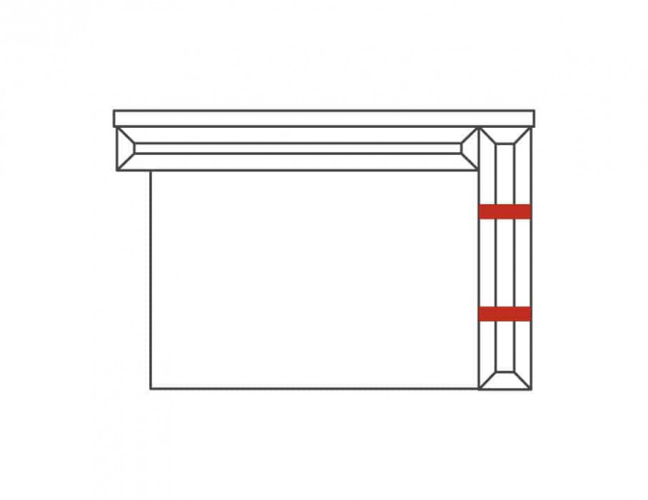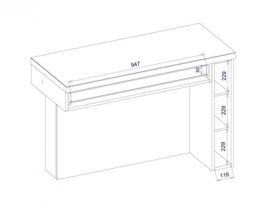 Toaletní stolek má krajní úzkou skříňku s plnými dvířky, za kterými jsou 2 lakované police. Pod horní deskou je očalouněná zásuvka na kovových pojezdech.