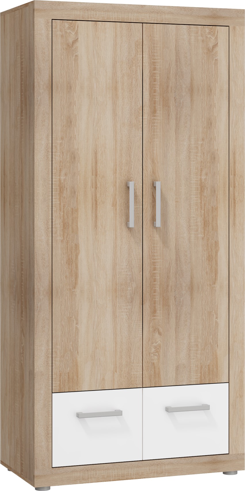 Součástí jsou 4 plná dvířka, za kterými jsou vloženy 2 dlouhé lakované police a 1 šatní tyč.