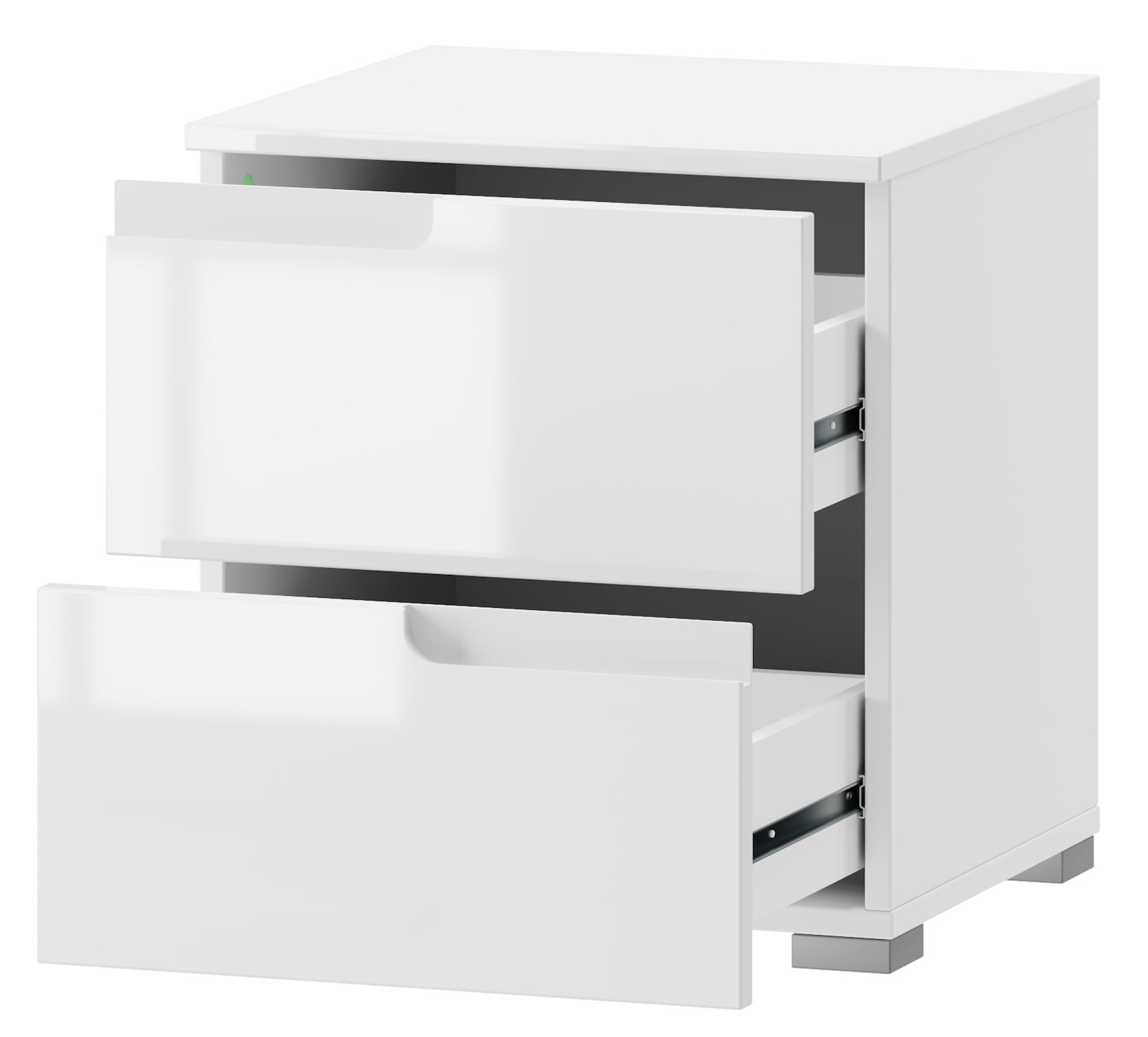 Moderní noční stolek Selene 32 vás zaujme svým luxusním designem. Je vyroben z MDF dřevotřísky s tenkou vrstvou masivního dřeva v kombinaci s kvalitním laminem potaženého bílou fólií. Přední část je v lesku a korpus je matný. Stolek stojí na nízkých plastových nožkách ve stříbrném odstínu.