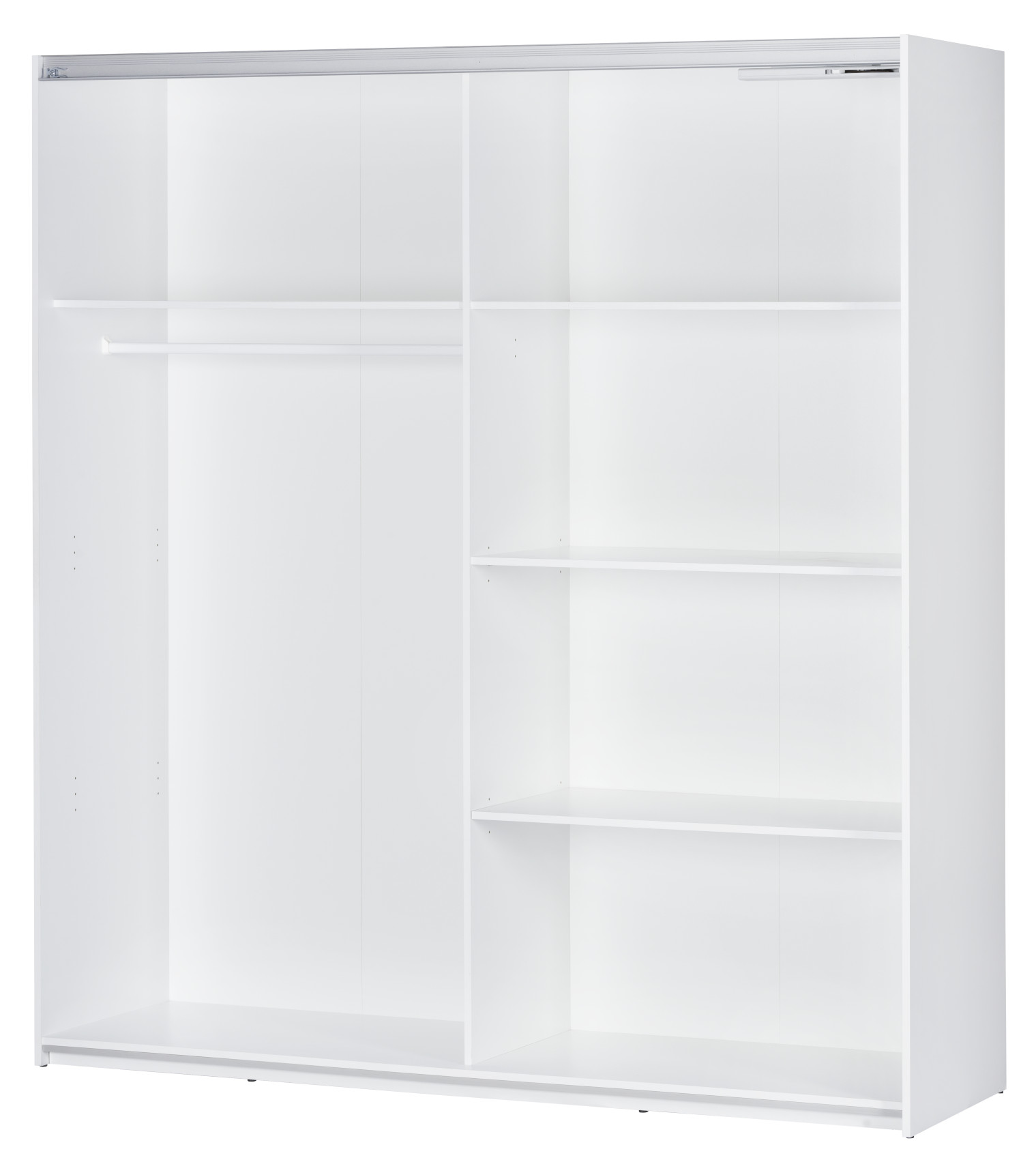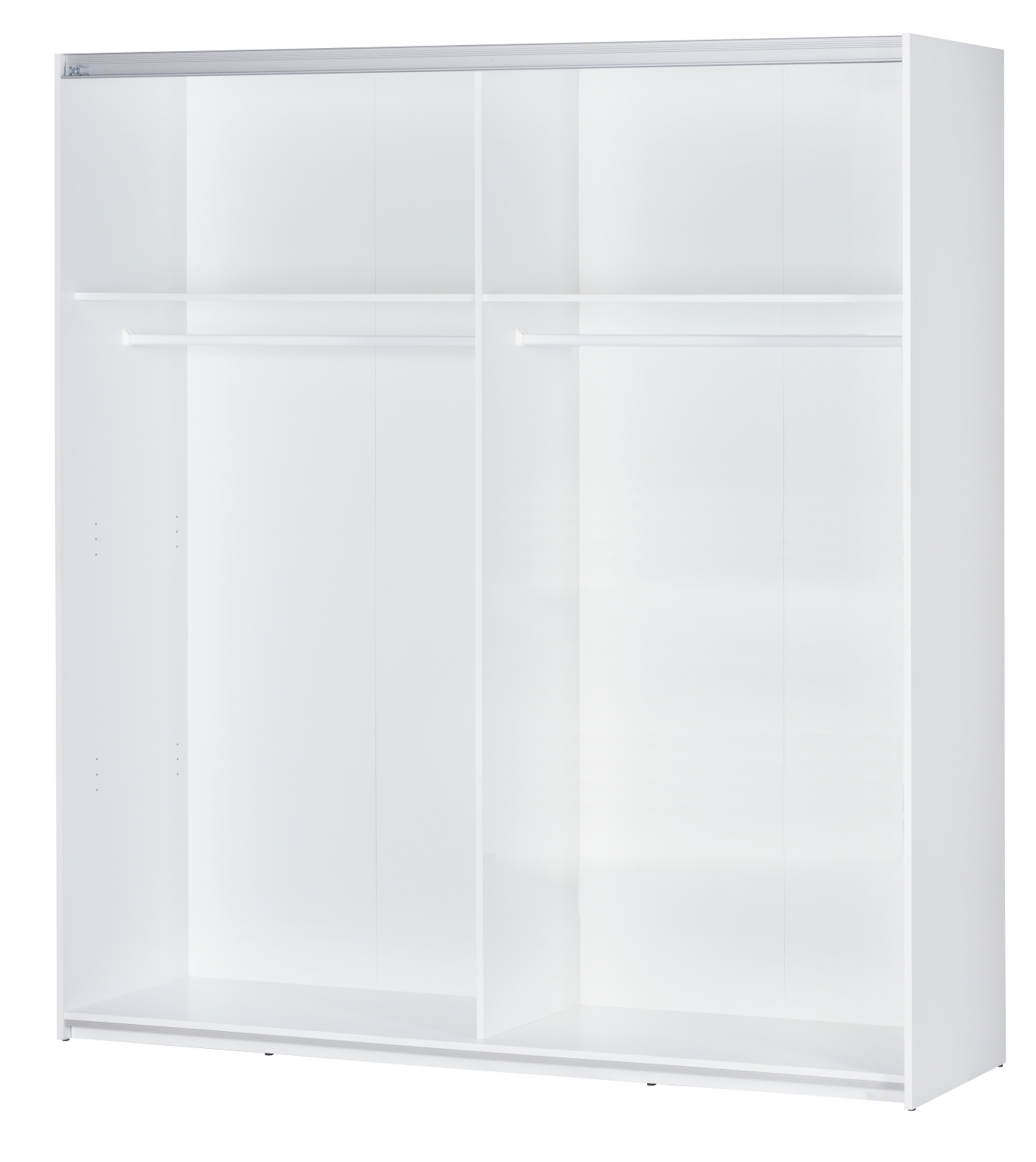 Součástí skříně jsou 2 pojízdné dveře, za kterými jsou vloženy 2 šatní tyče a 2 police. Za příplatek si můžete dokoupit další 2 police (kontaktujte nás a my vám zašleme přecenění).