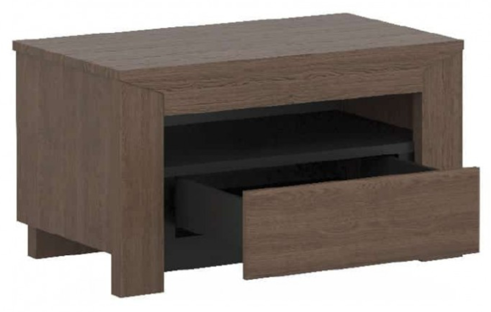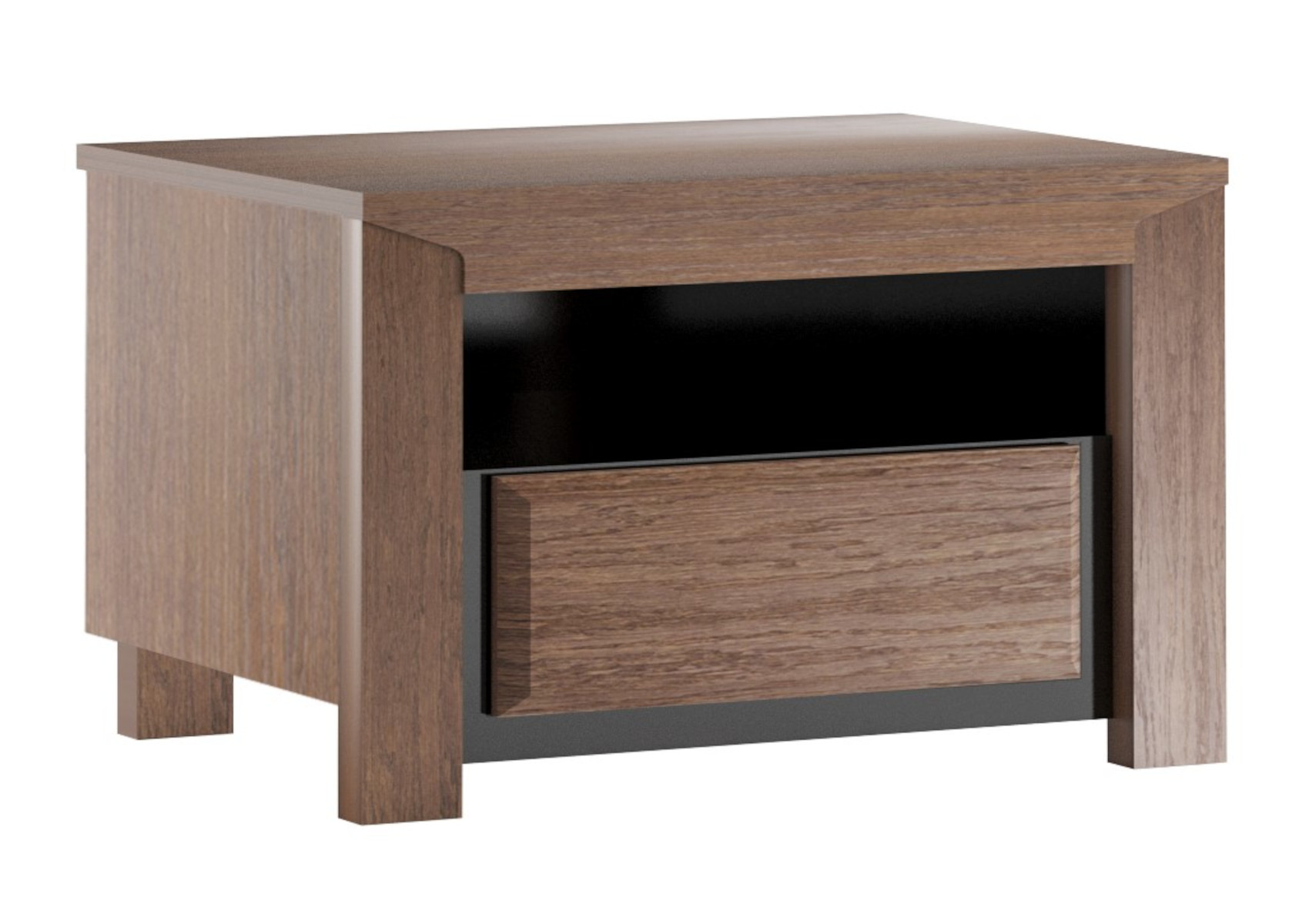 Stolek má jednu zásuvku na kovových pojezdech s jednoduchým dotykovým systémem otevírání Push to open. Nad zásuvkou je otevřená nika pro uložení časopisů nebo knih.