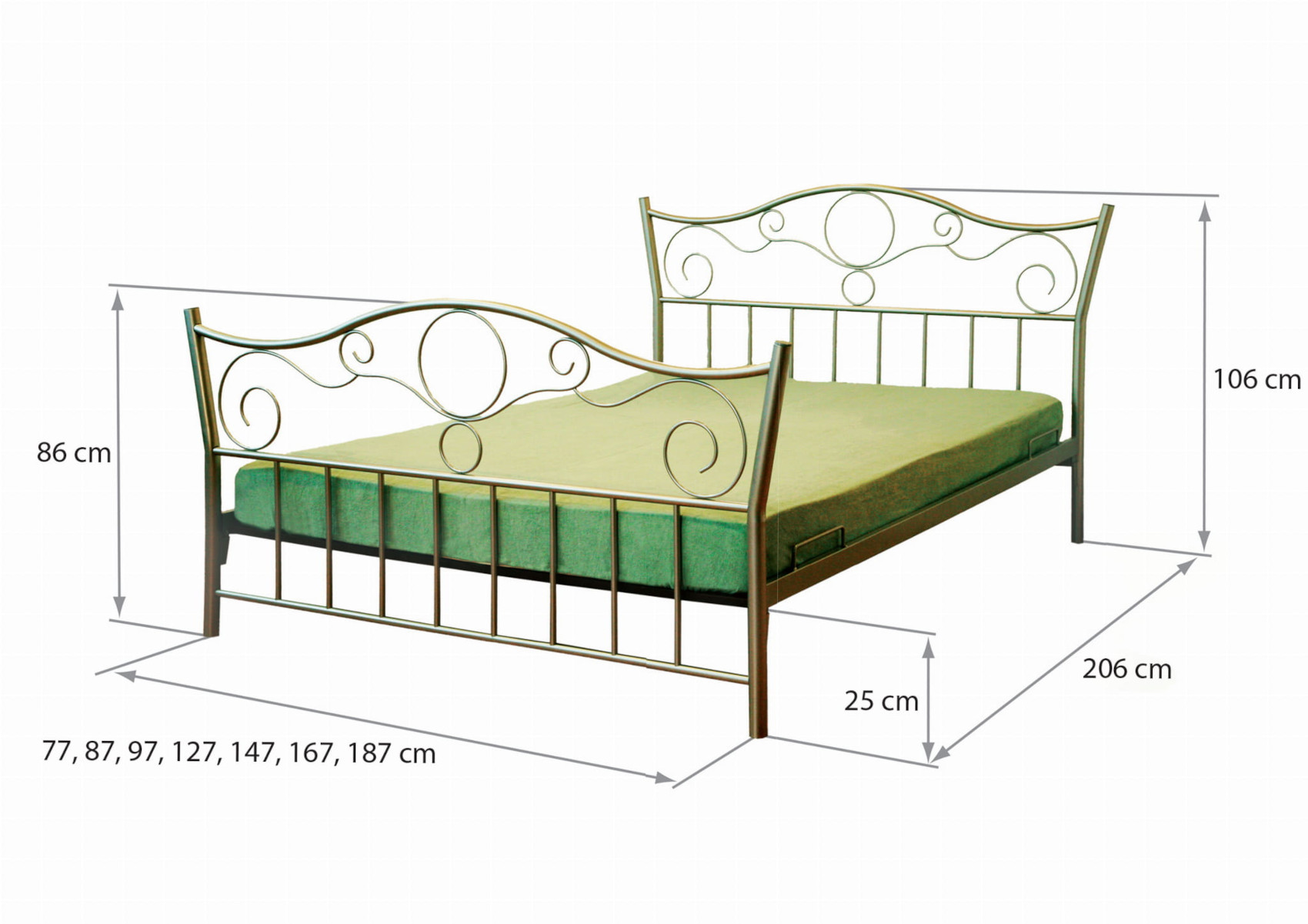 Postel Mirada vás zaujme svým jednoduchým luxusním designem. Je vyrobena z kvalitního lakovaného kovu, který vám zaručí odolnost a stabilitu postele. Jedinečným prvkem je zdobené hlavové a nožní čelo, které dodá nábytku nádech elegance a francouzského stylu. Máte možnost si vybrat z několika variant rozměrů a vybavit si tak studentský pokoj nebo ložnici. Nabízíme vám 6 barevných variant a sladit tak postel s ostatním nábytkem.