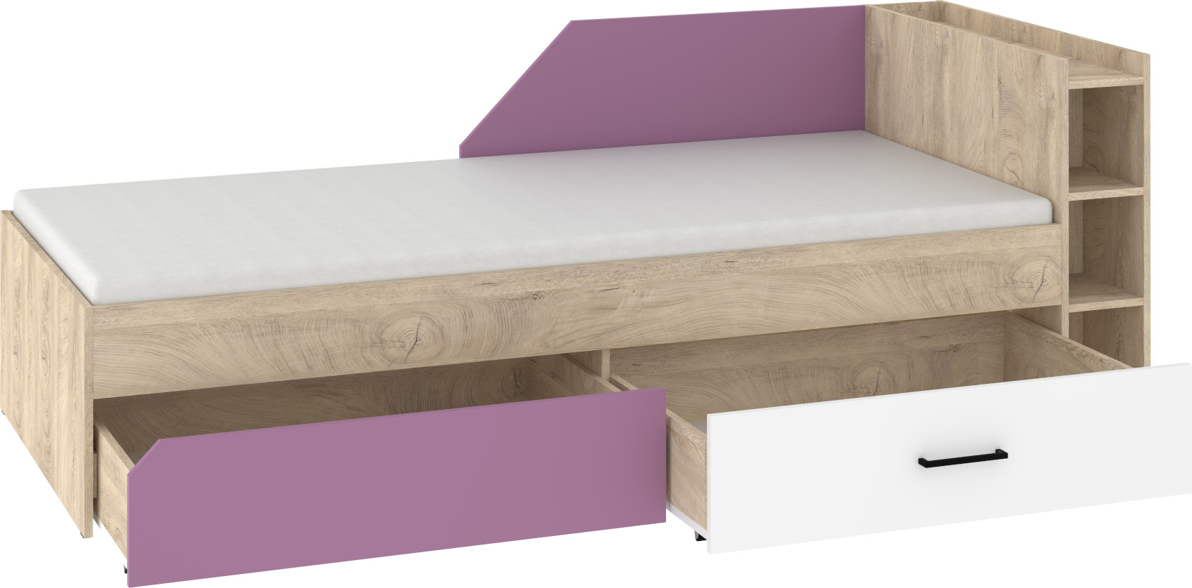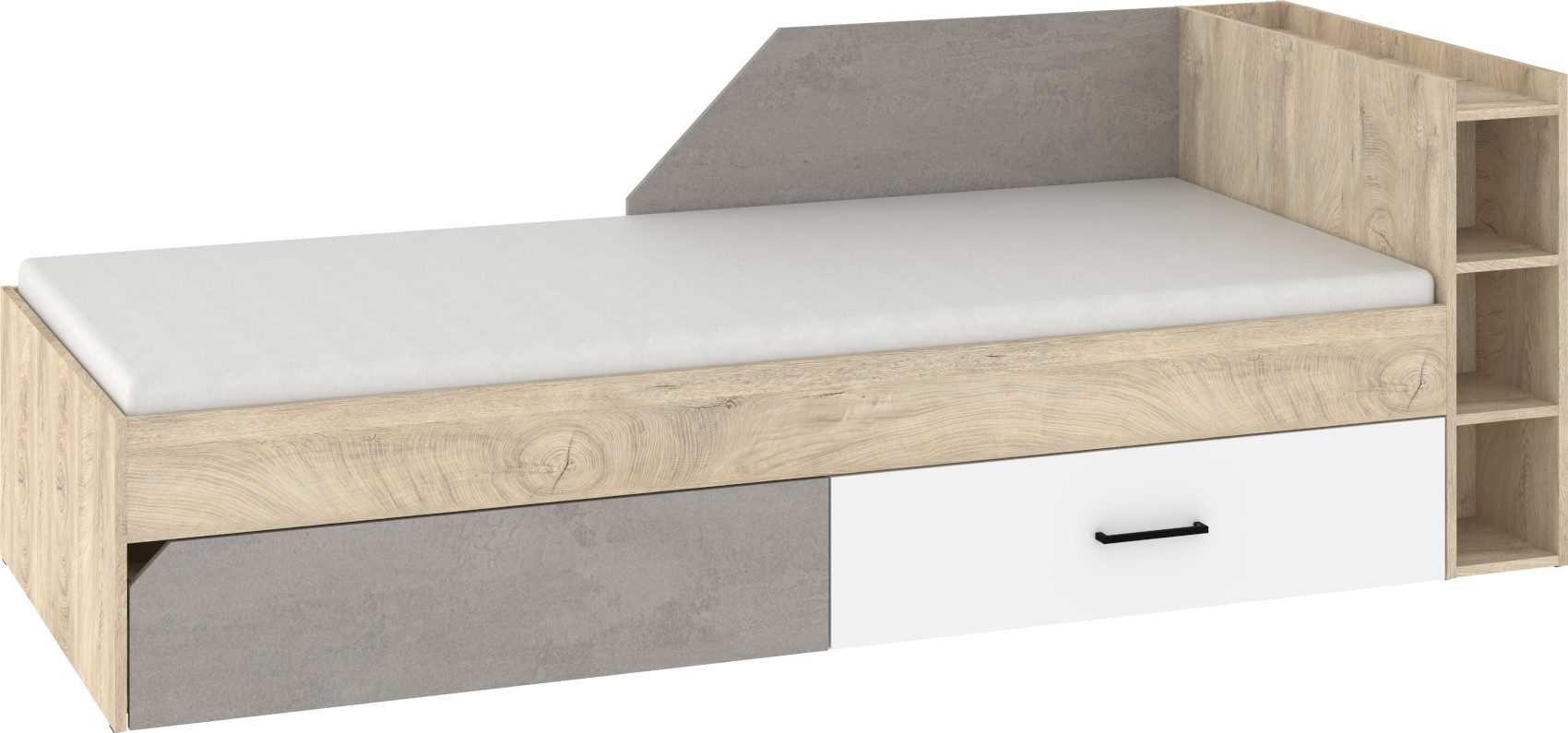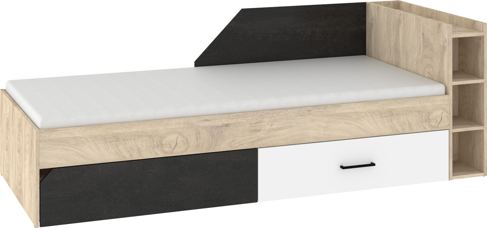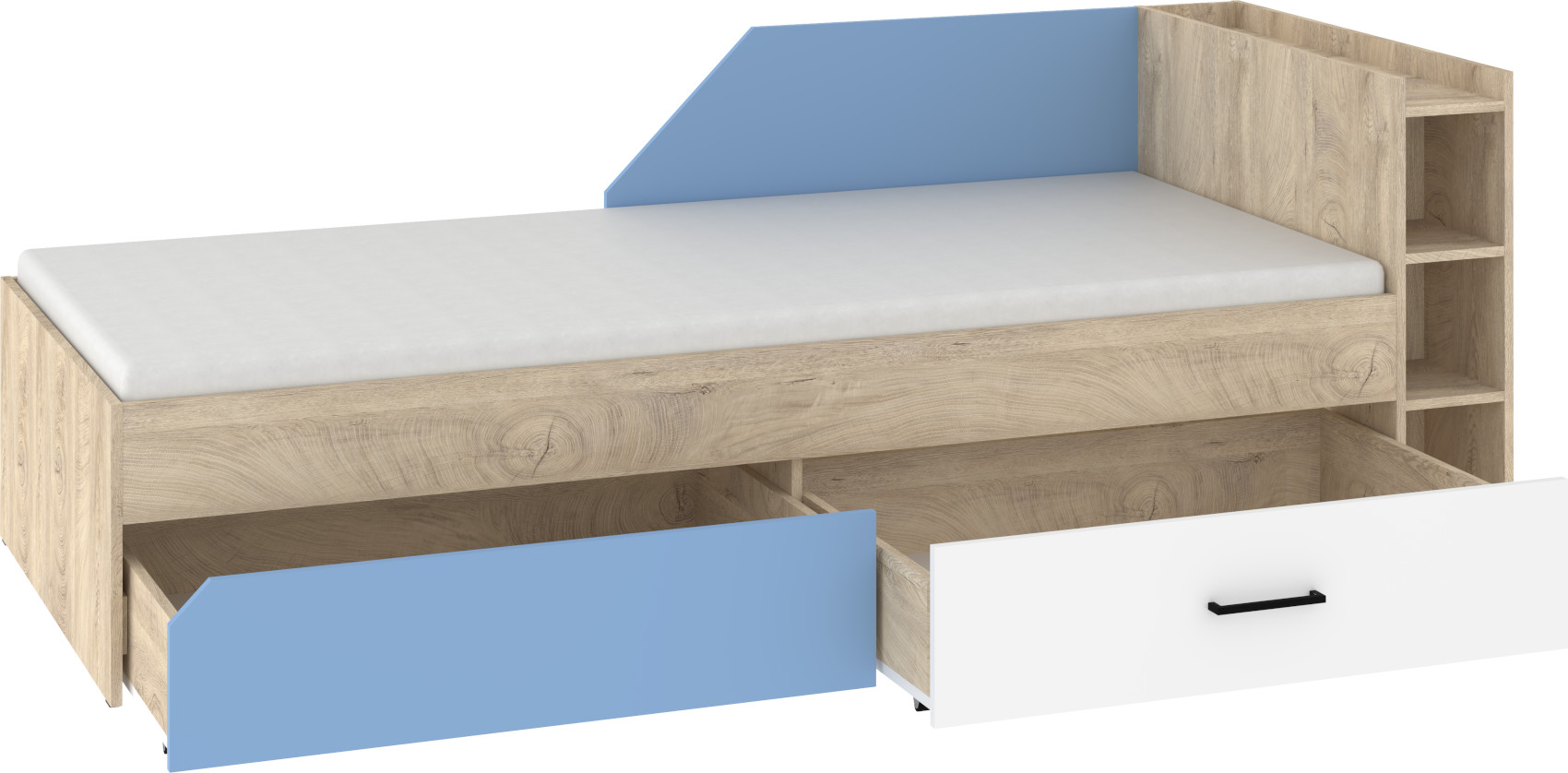 Součástí postele je laťový rošt a 2 zásuvky na kovových pojezdech. Vedle postele jsou 3 otevřené niky k vystavení vašich oblíbených knih, dekorací či fotografií.
