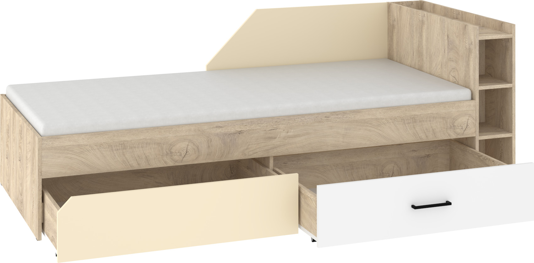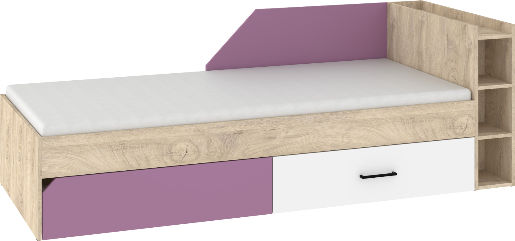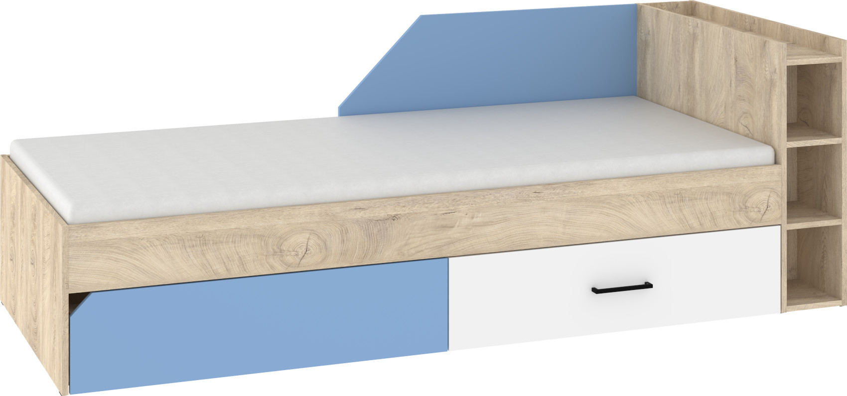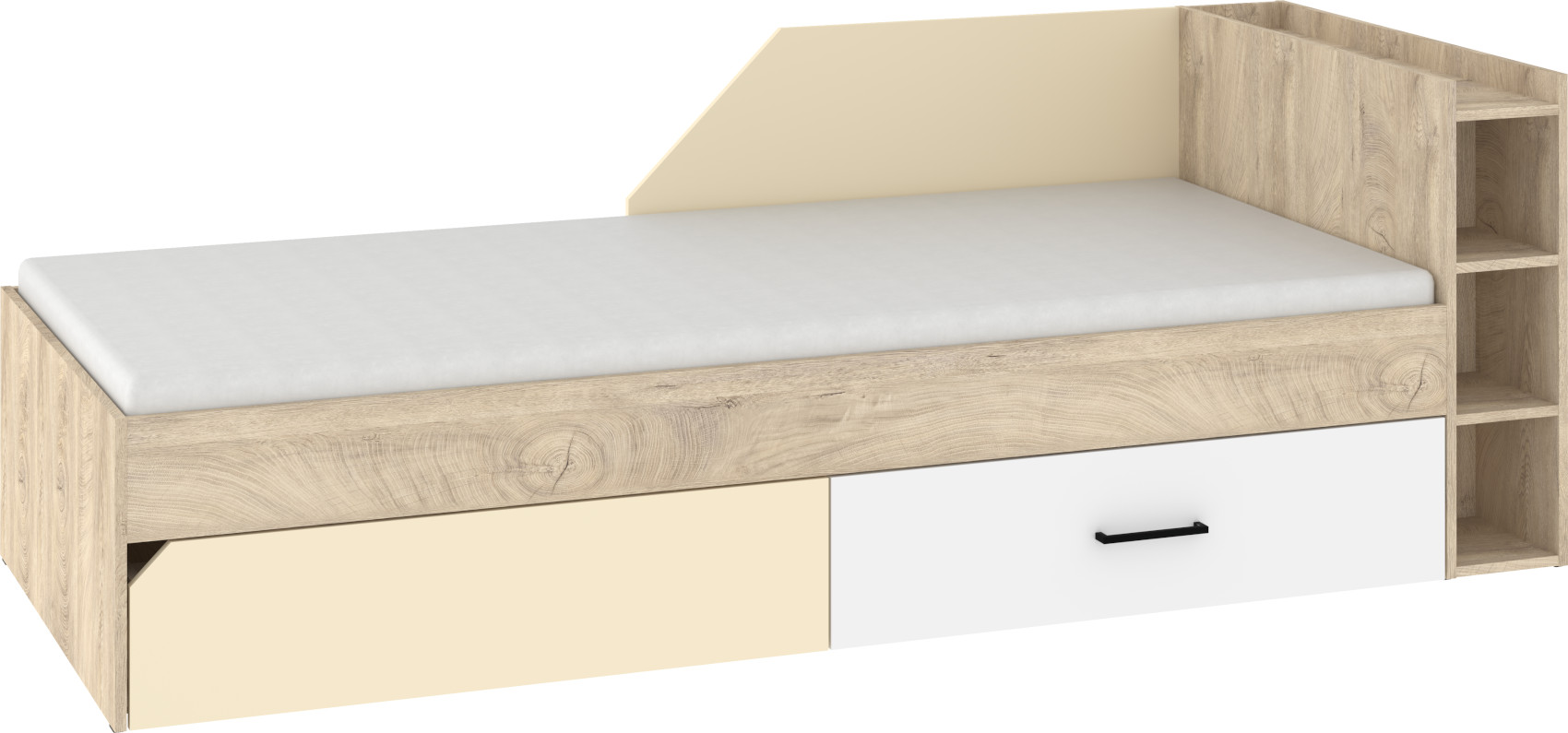 Součástí postele je laťový rošt a 2 zásuvky na kovových pojezdech. Vedle postele jsou 3 otevřené niky k vystavení vašich oblíbených knih, dekorací či fotografií.