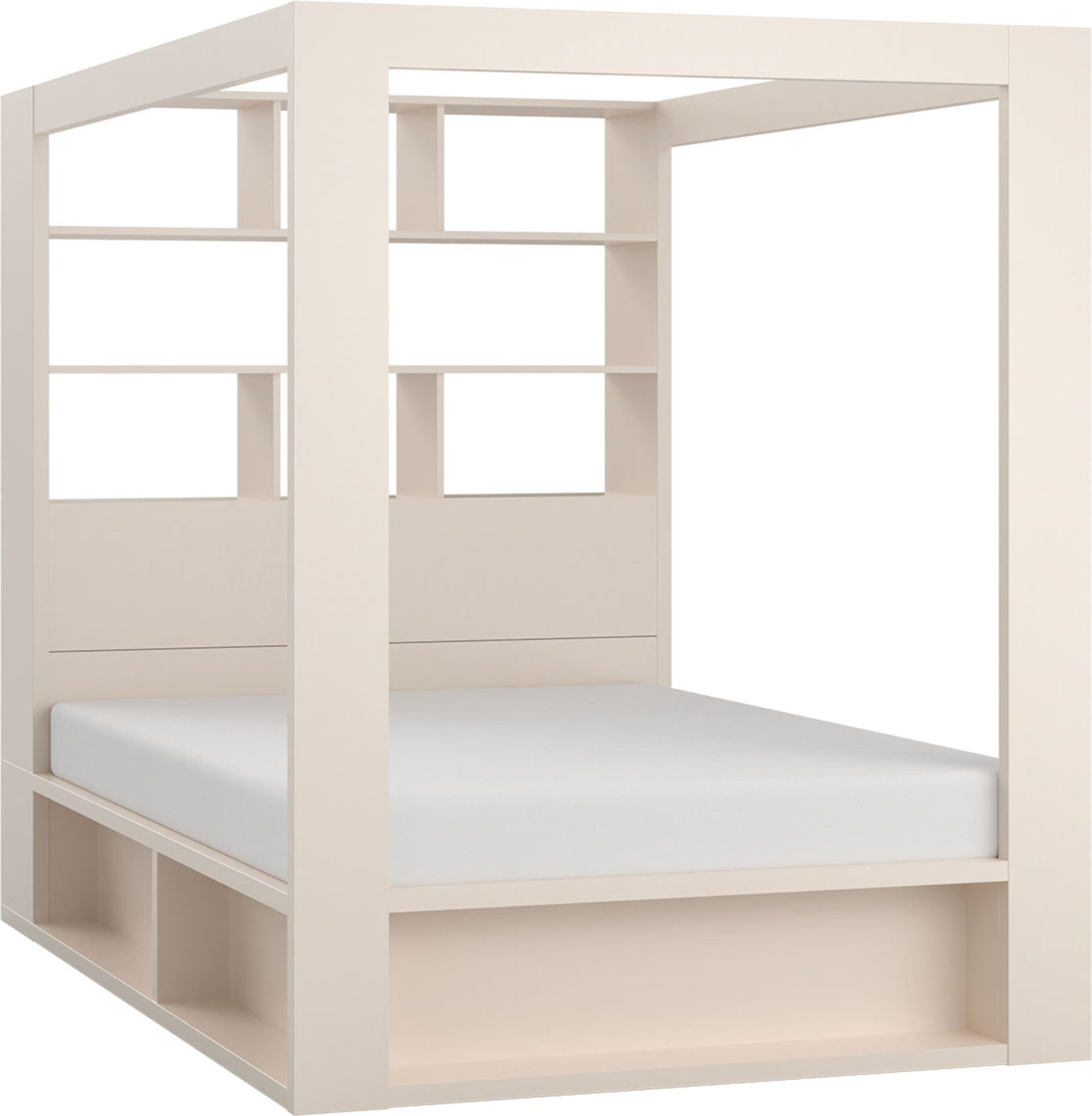 Postel s baldachýnem a regálem 4You vás zaujme svým moderní designem v jasném odstínu. Je vyrobena z kvalitního lamina, které je odolné vůči poškrábání a nečistotám. Můžete si vybrat ze 2 odstínů - bílá nebo pískově béžová.