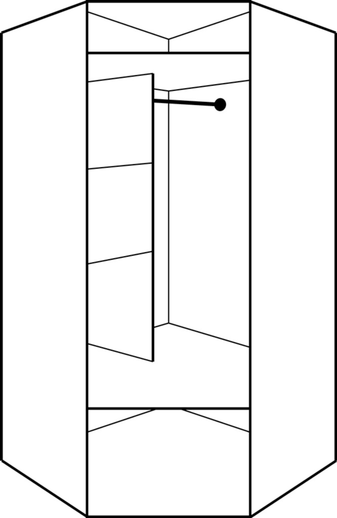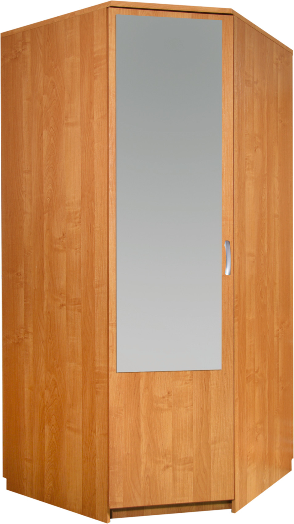 Prostorná rohová šatní skříň se zrcadlem je vhodná i do menších prostorů. V levé části jsou police, v pravé části šatní tyč. Ve spodní části je jedna velká police. Je vyrobena z lamina o síle 16 mm, na výběr z několika barevných variant.