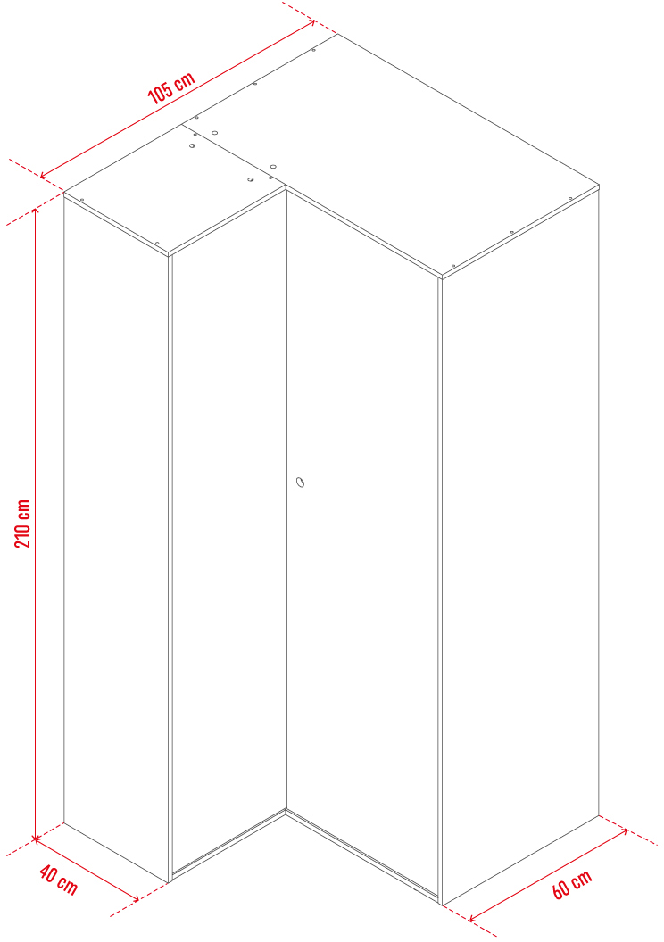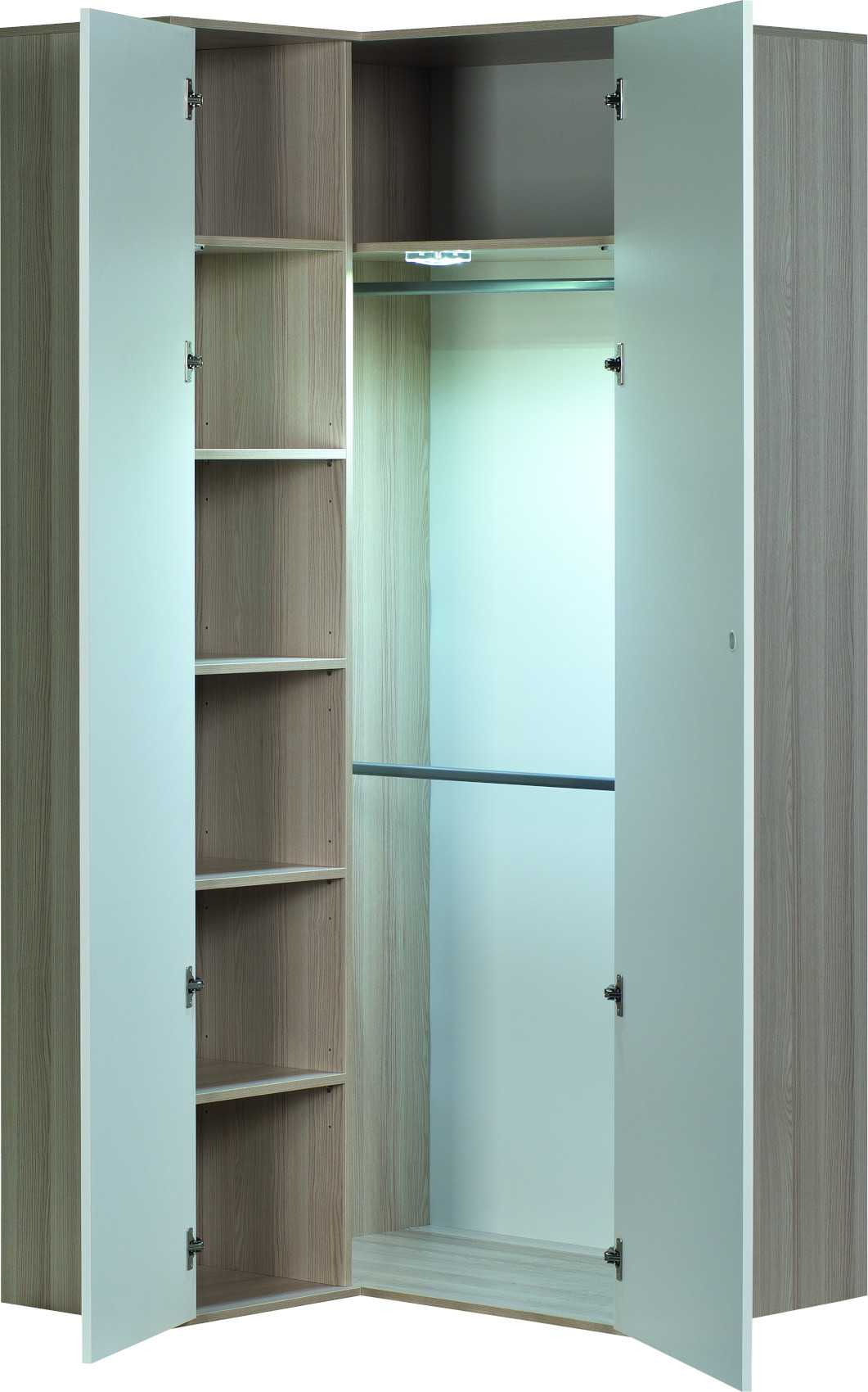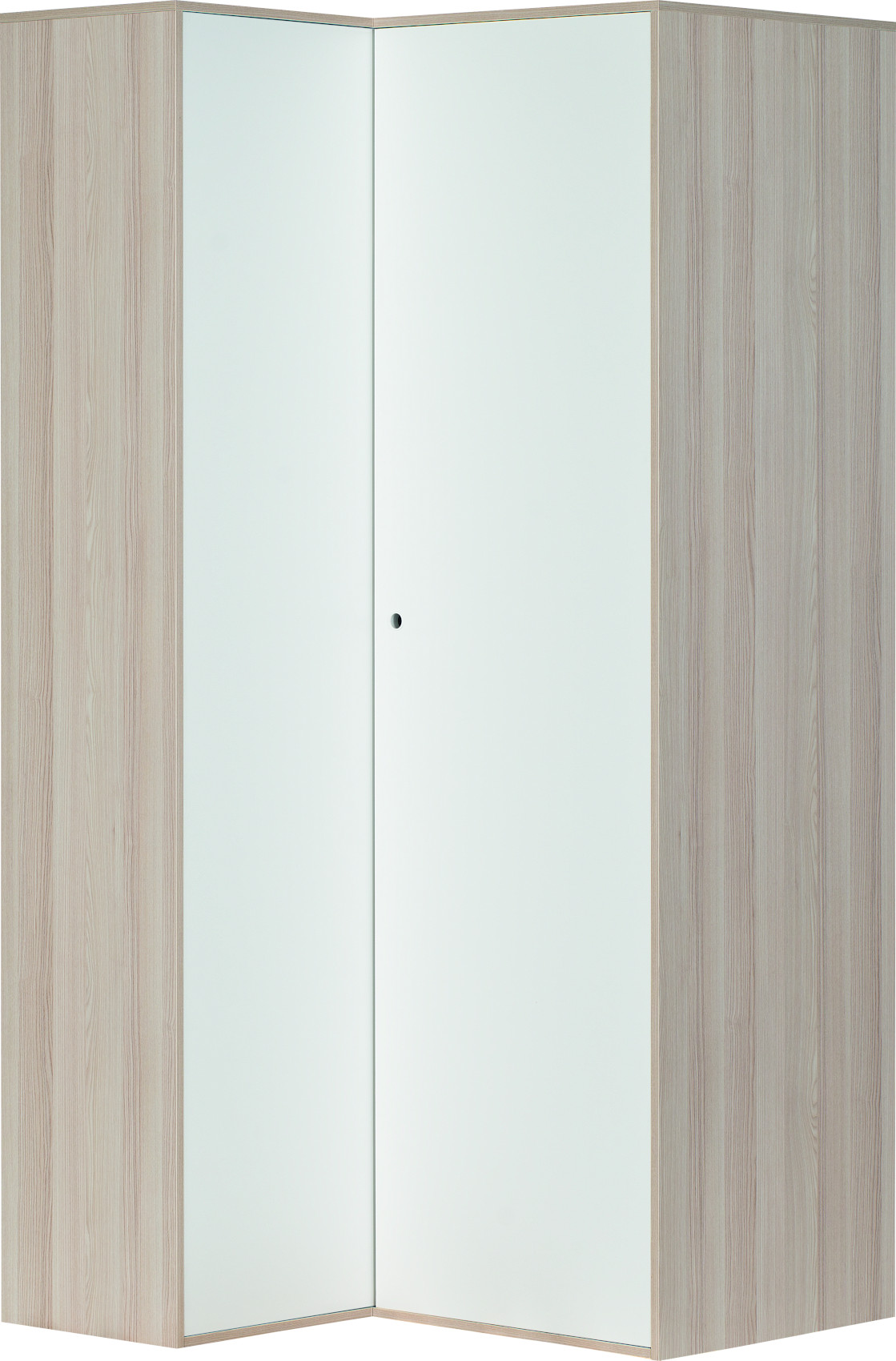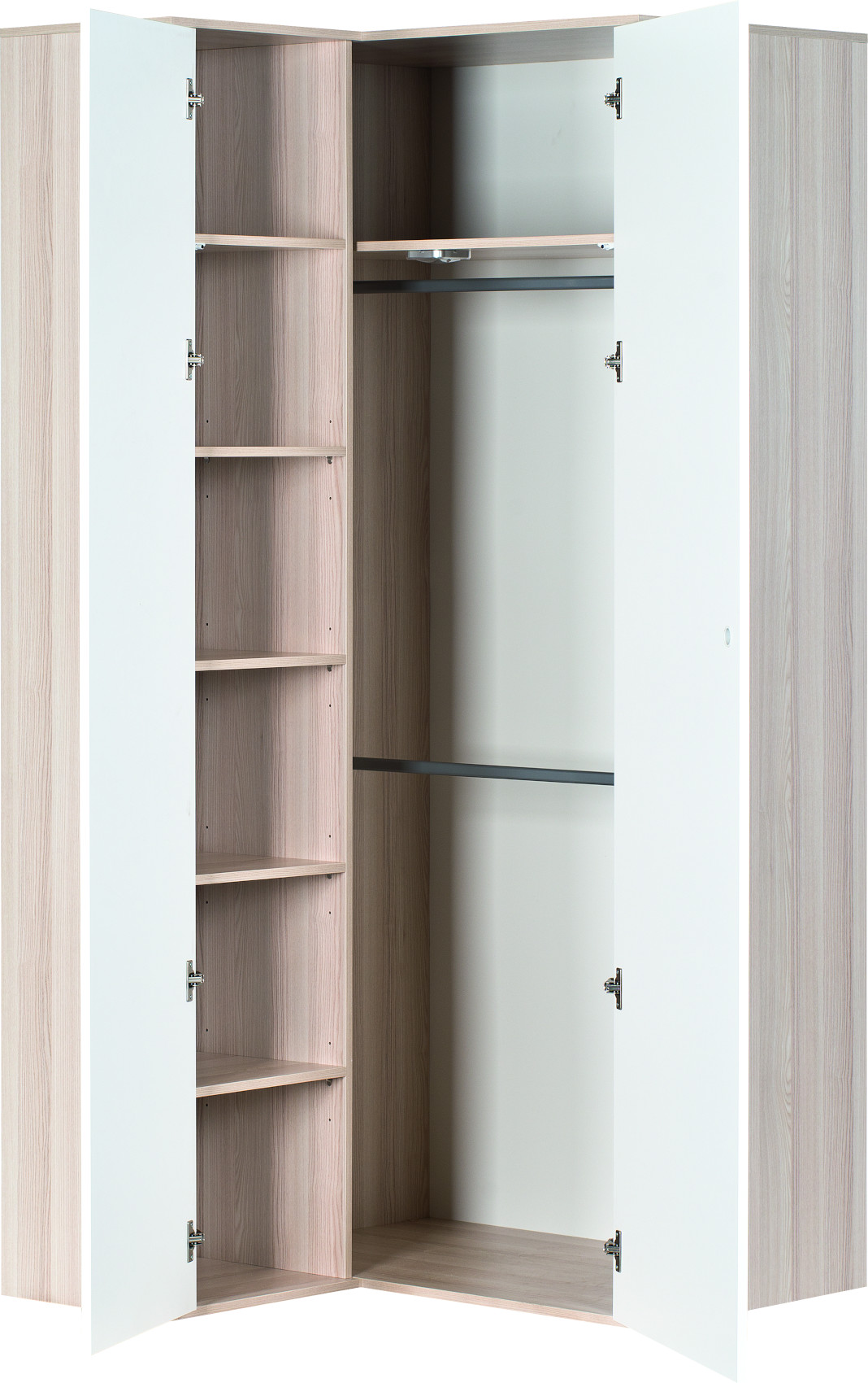 Rohová šatní skříň Spot vás zaujme svým prostým designem v odstínu akátového dřeva v kombinaci s bílým lakem. Je vyrobena z kvalitního lamina o síle 16 mm a 22 mm odolného vůči nečistotám a poškrábání.