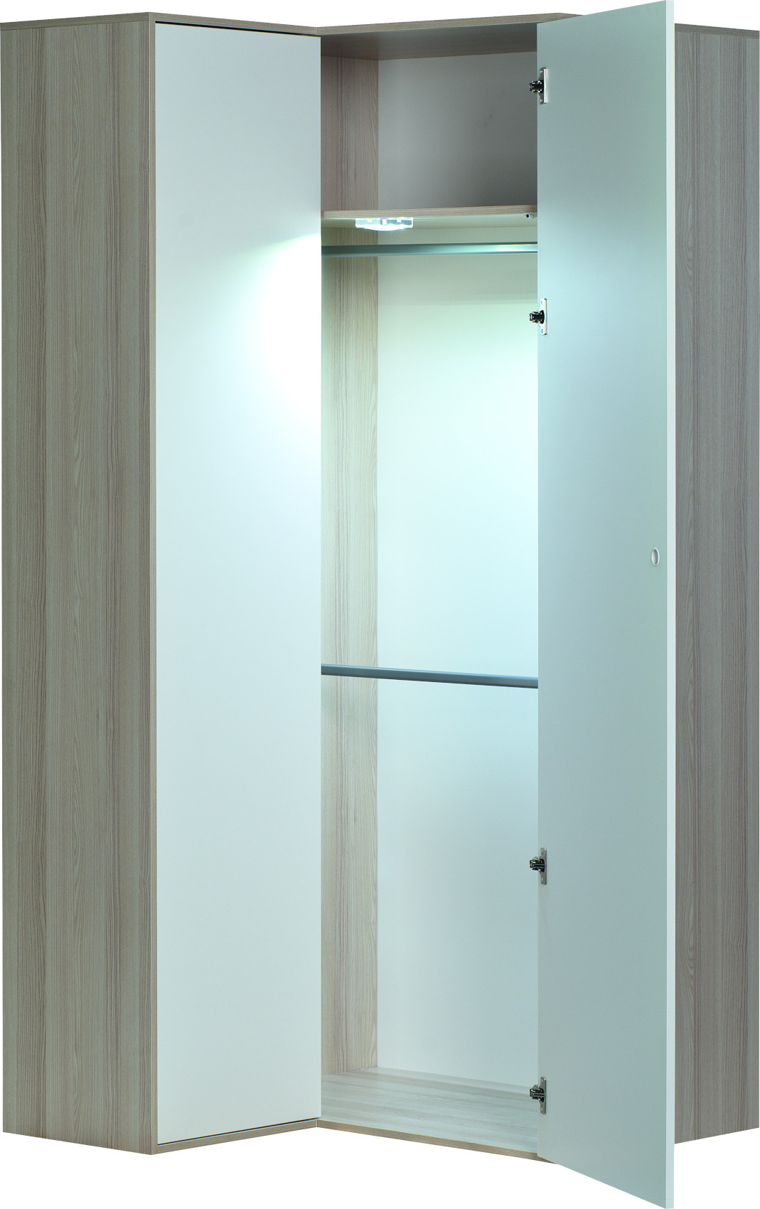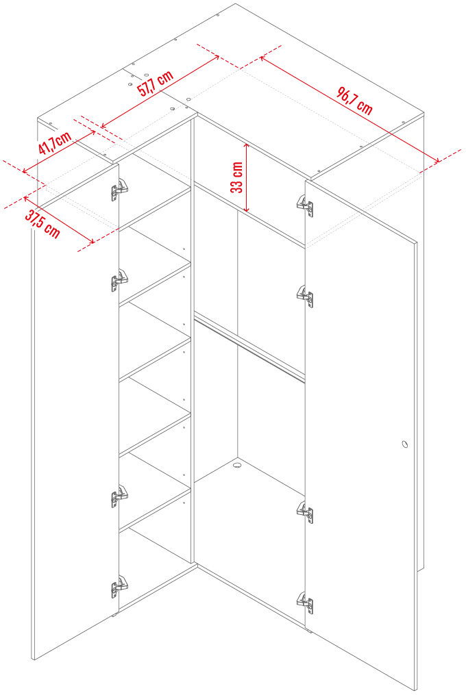 Skříň má 2 dvířka za kterými jsou vloženy 2 šatní tyče s širokou policí Nad tyčemi je instalováno LED osvětlení. V další části je 5 lakovaných polic, z nichž 4 mají libovolně nastavitelnou výšku.
