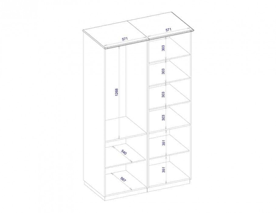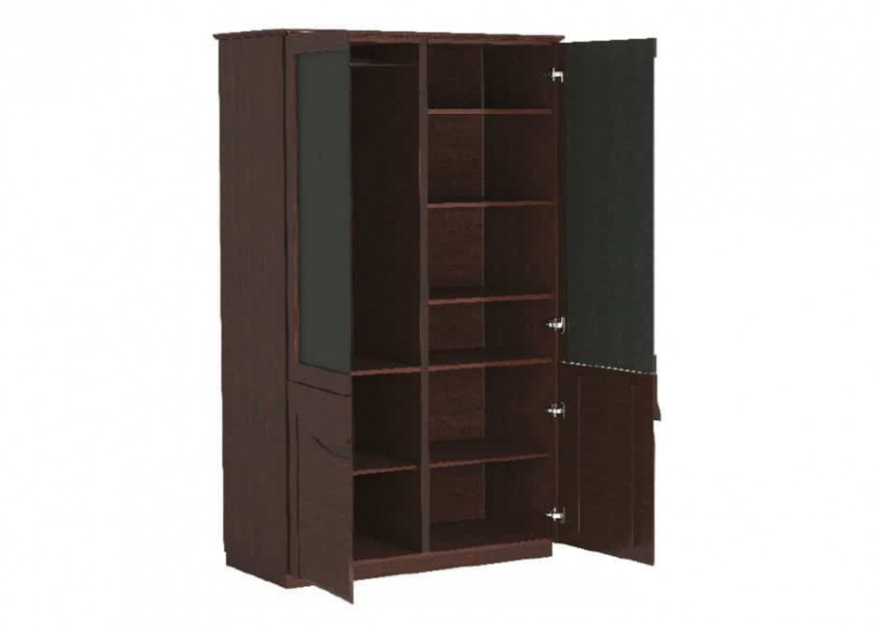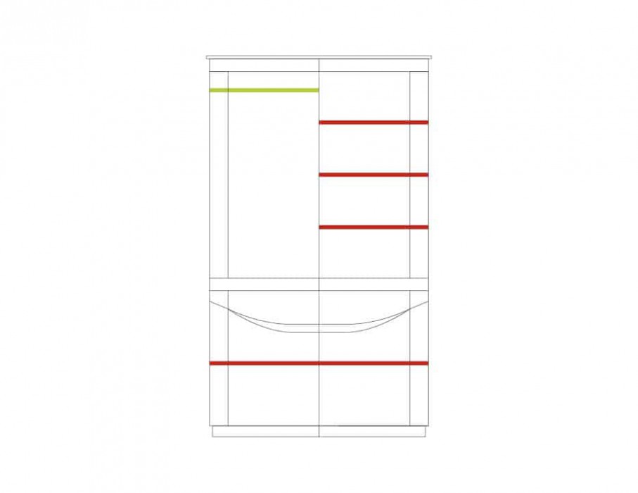 Skříň má 2 očalouněné dveře potahovou látkou. Součástí vnitřního prostoru je 1 šatní tyč a 5 lakovaných polic.