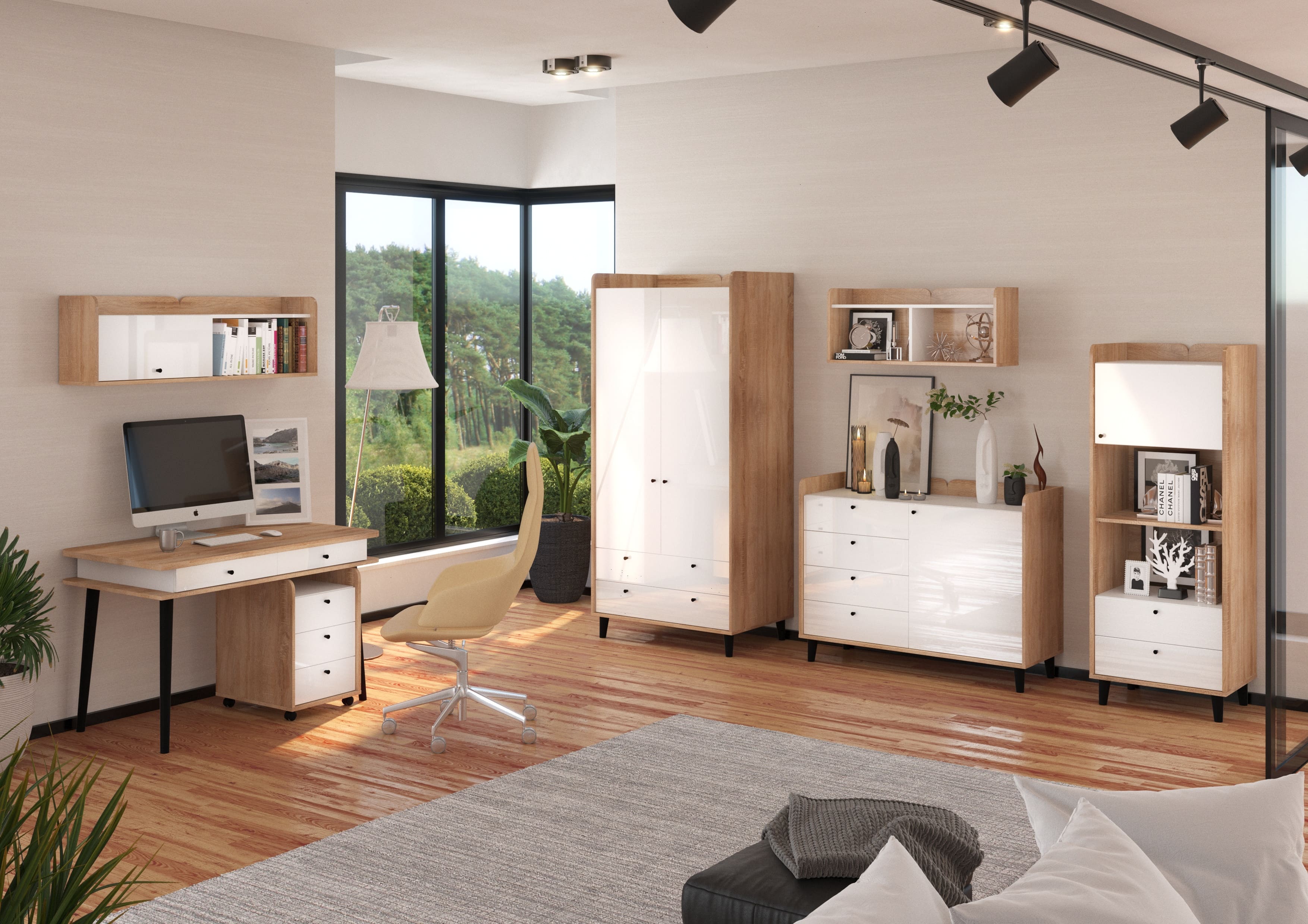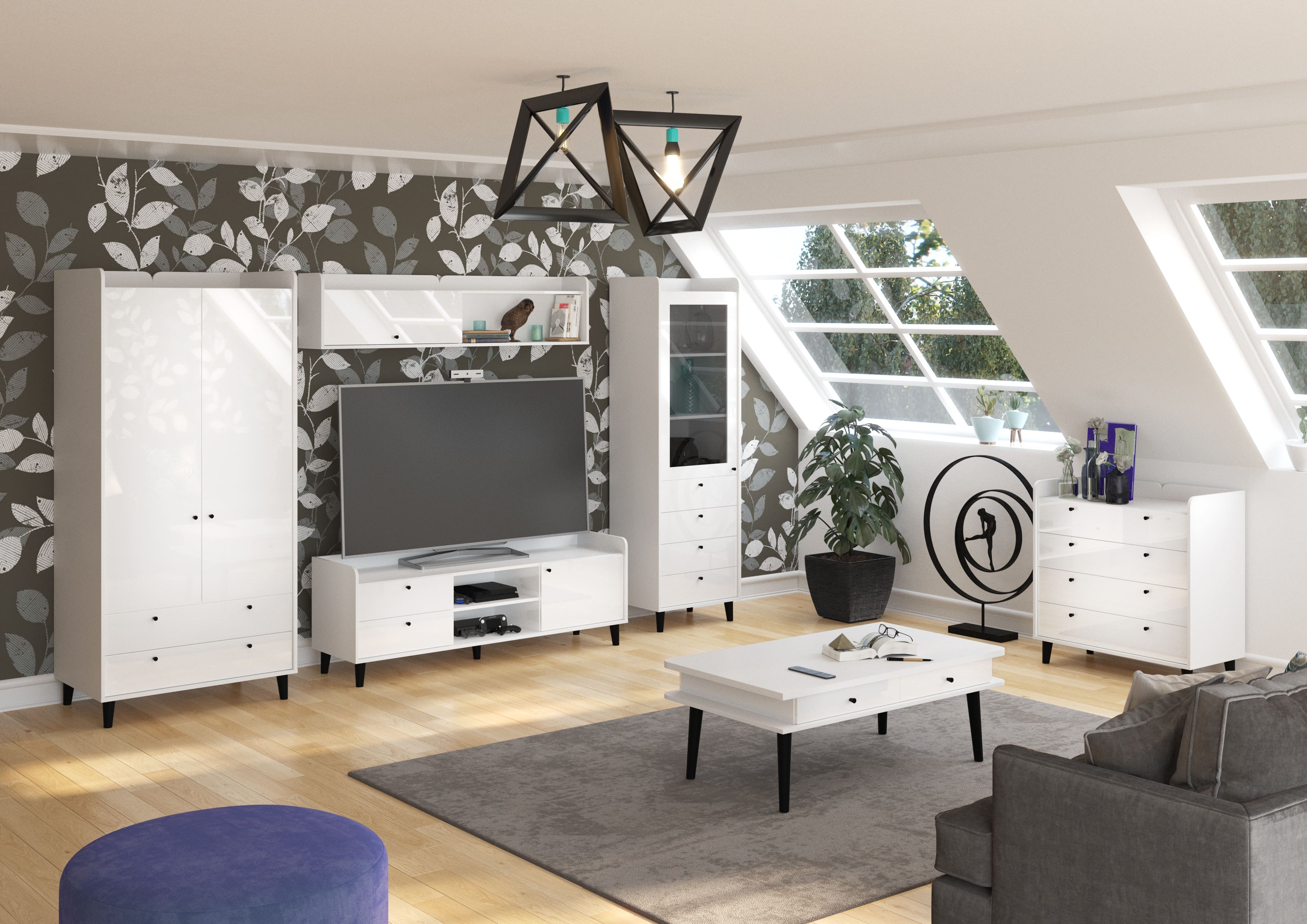 Výrazným prvkem jsou černé dřevěné nožky různých výšek, které dodají celé kolekci originální vzhled. A nejen to, vyšší nožky jsou také praktické při uklízení. Vitríny jsou vybavené kouřovými skly, které ještě více zdůrazní originální vzhled systému. Černou barvu mají i úchyty a spolu s bílým leskem na předních plochách skvěle doplňují dřevodekory reflektující moderní trendy v bydlení. S kolekcí Dolce nemůžete šlápnout vedle.