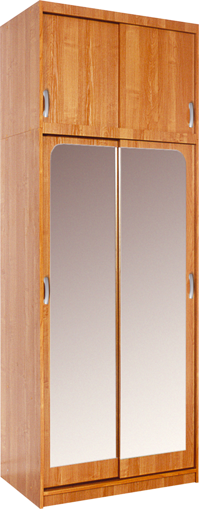 Šatní skříň Irena se zrcadly a s posuvnými dveřmi je vyrobena z lamina 16 mm, má moderní design a je vhodná do každého interiéru. V horní části skříně je vestavěná nástavba. Na výběr z několika barevných variant. Vnitřní vybavení skříně viz obrázek. Skříň má praktické, výškově nastavitelné police.