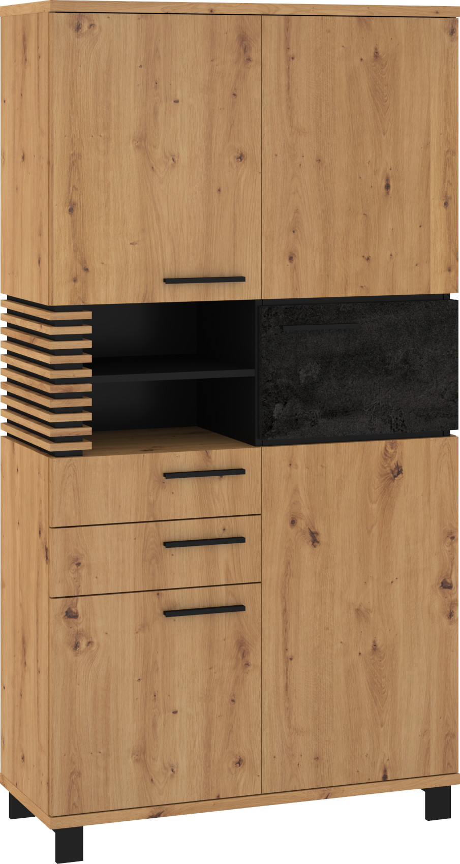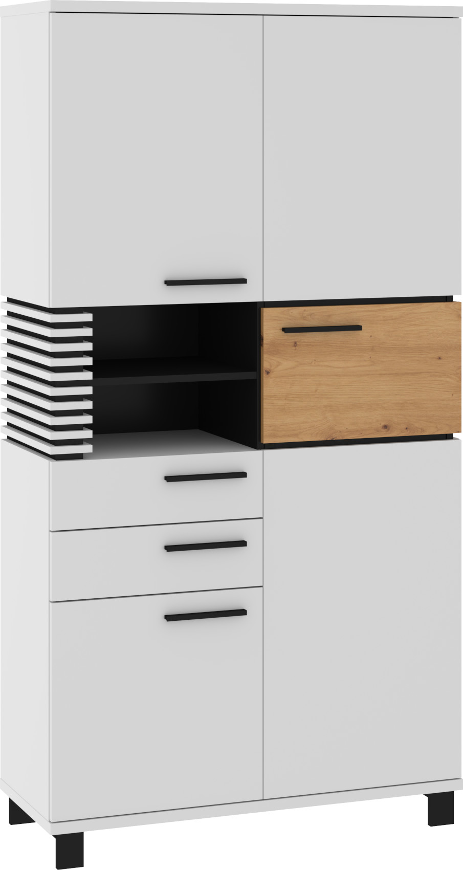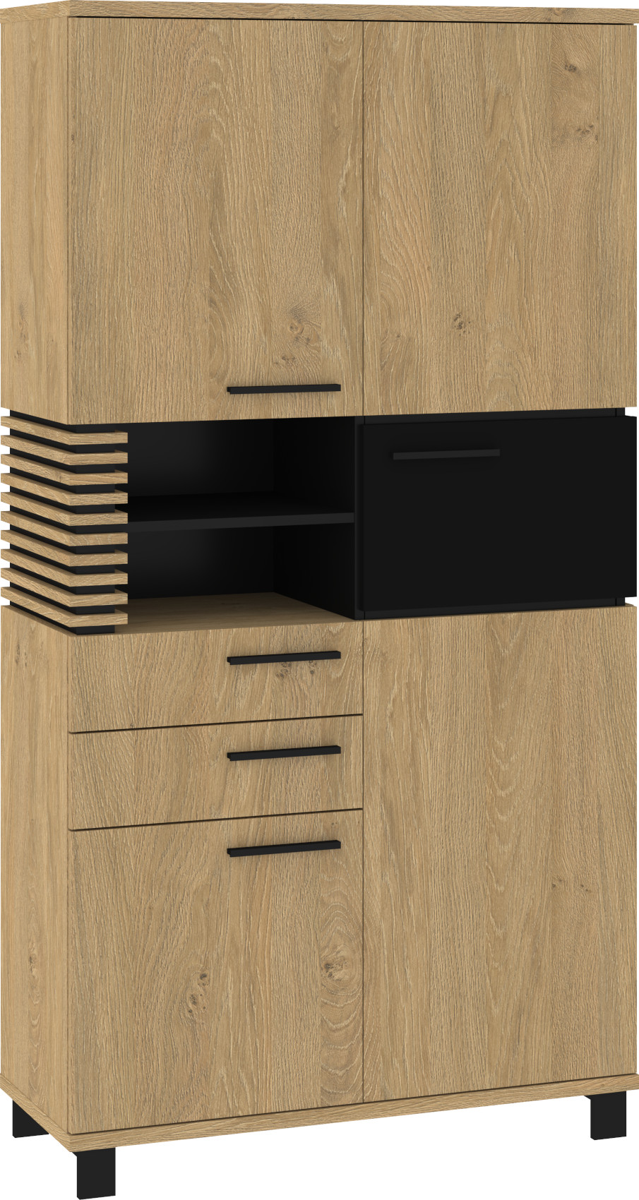 Součástí skříně jsou 3 dvířka, za kterými je vloženo 5 lakovaných polic a 1 šatní tyč. Nad levými spodními dvířky jsou 2 zásuvky na kovových pojezdech a 2 otevřené niky.