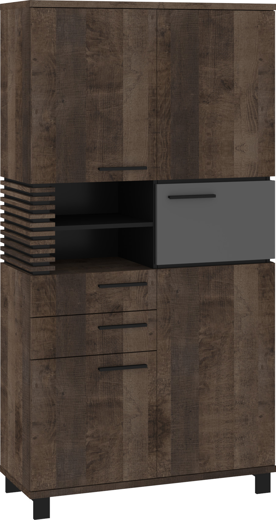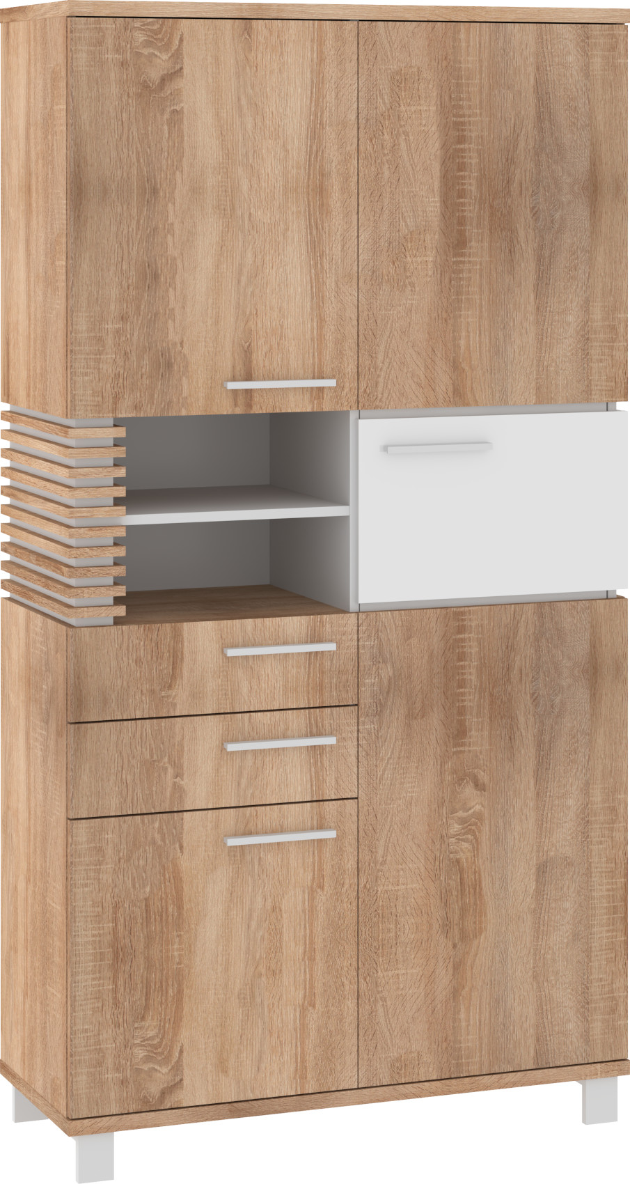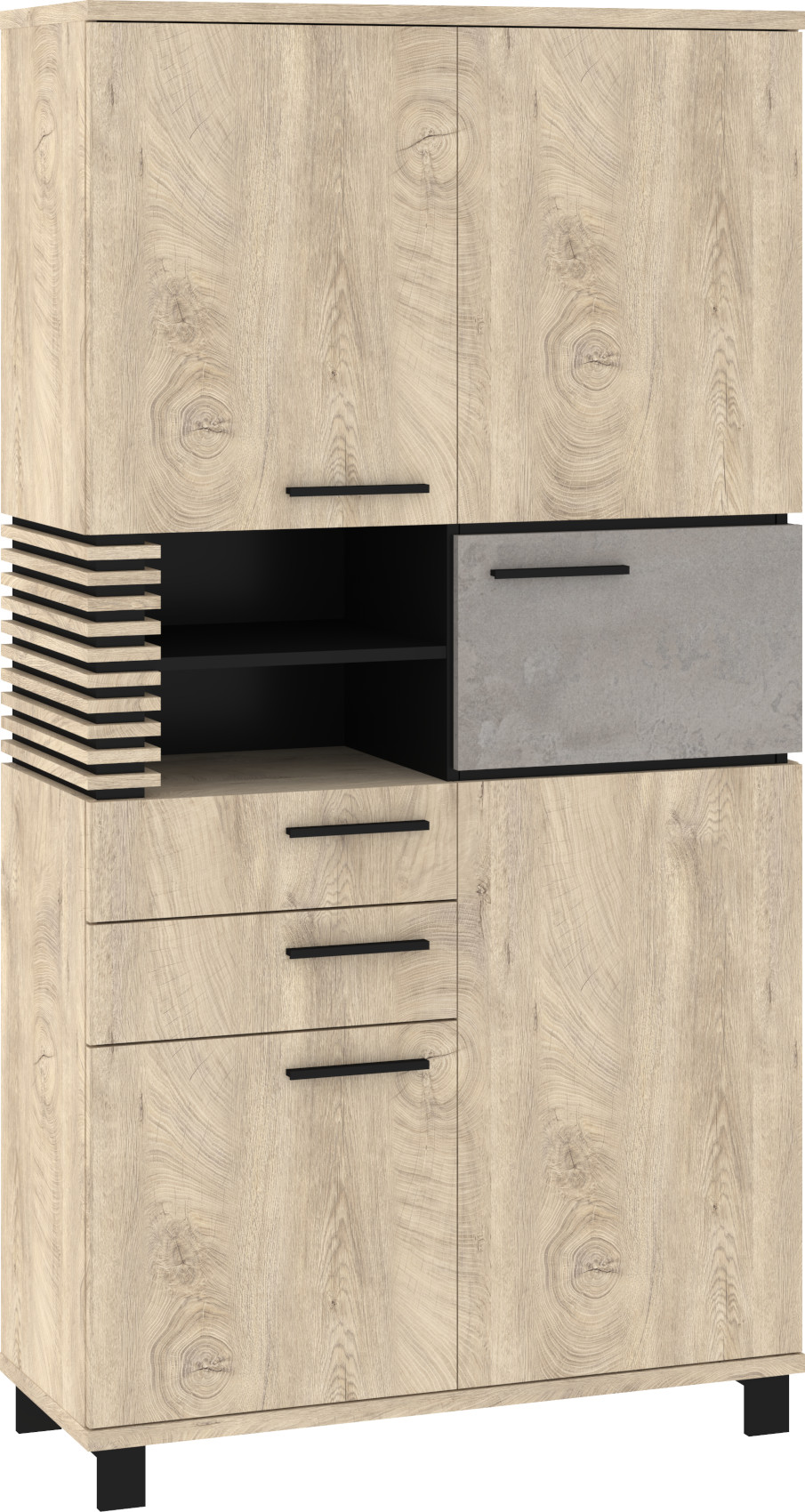 Součástí skříně jsou 3 dvířka, za kterými je vloženo 5 lakovaných polic a 1 šatní tyč. Nad levými spodními dvířky jsou 2 zásuvky na kovových pojezdech a 2 otevřené niky.
