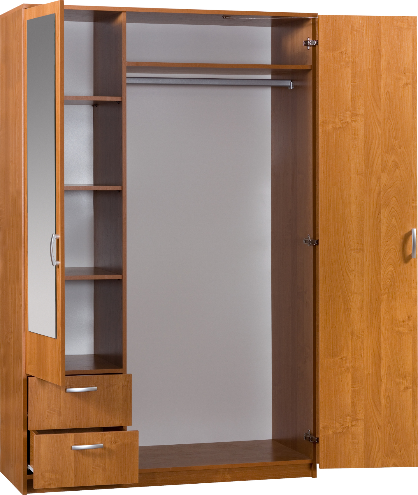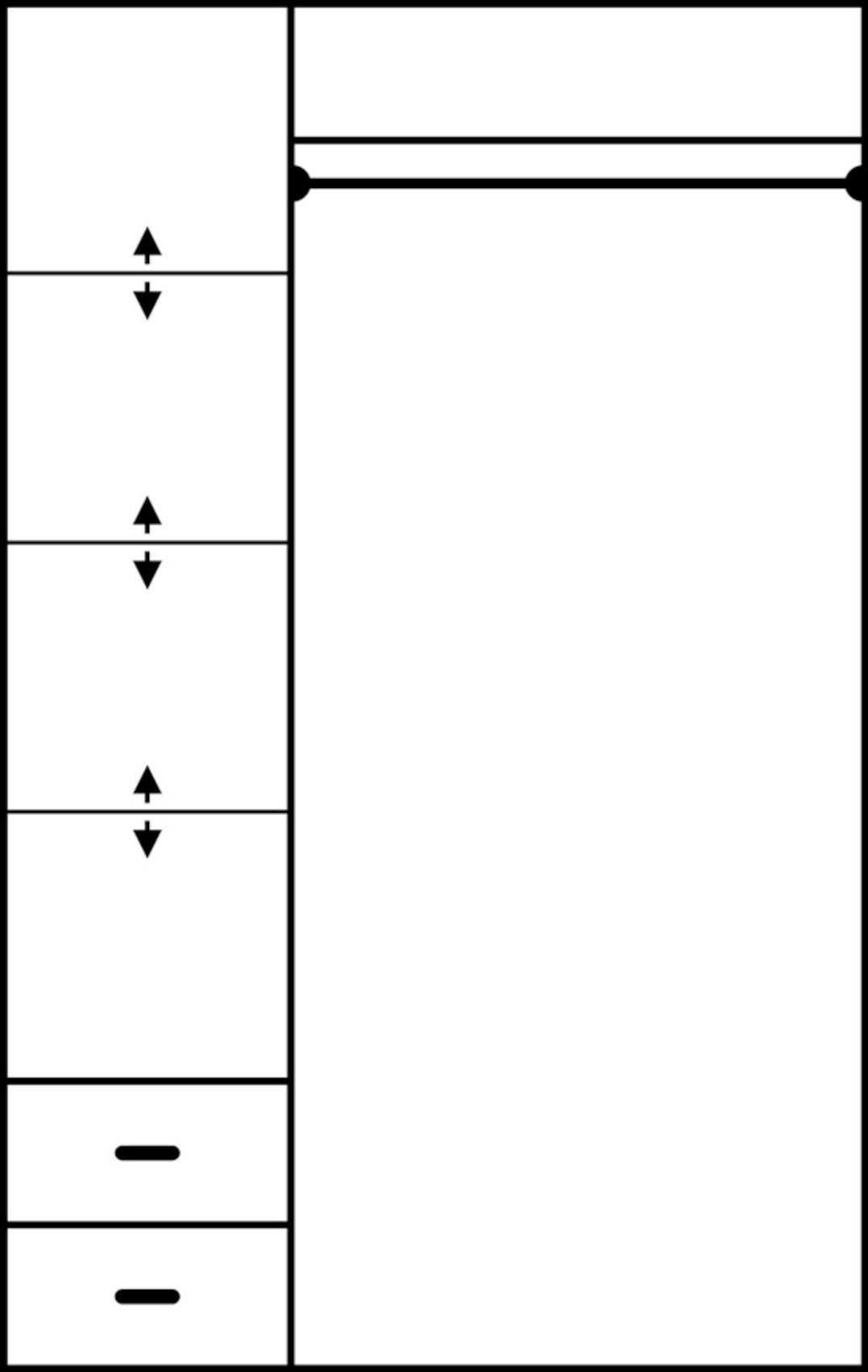 Praktická šatní skříň Venezia 1 bez zrcadla disponuje velkým úložným prostorem. V levé části jsou tři výškově nastavitelné police, ve spodní části jsou dvě zásuvky. Na pravé straně je police a šatní tyč (viz obrázek). Možnost libovolně namontovat zalamovací dveře na levou nebo pravou stranu. Materiál 16 mm lamino, na výběr z několika barevných variant.