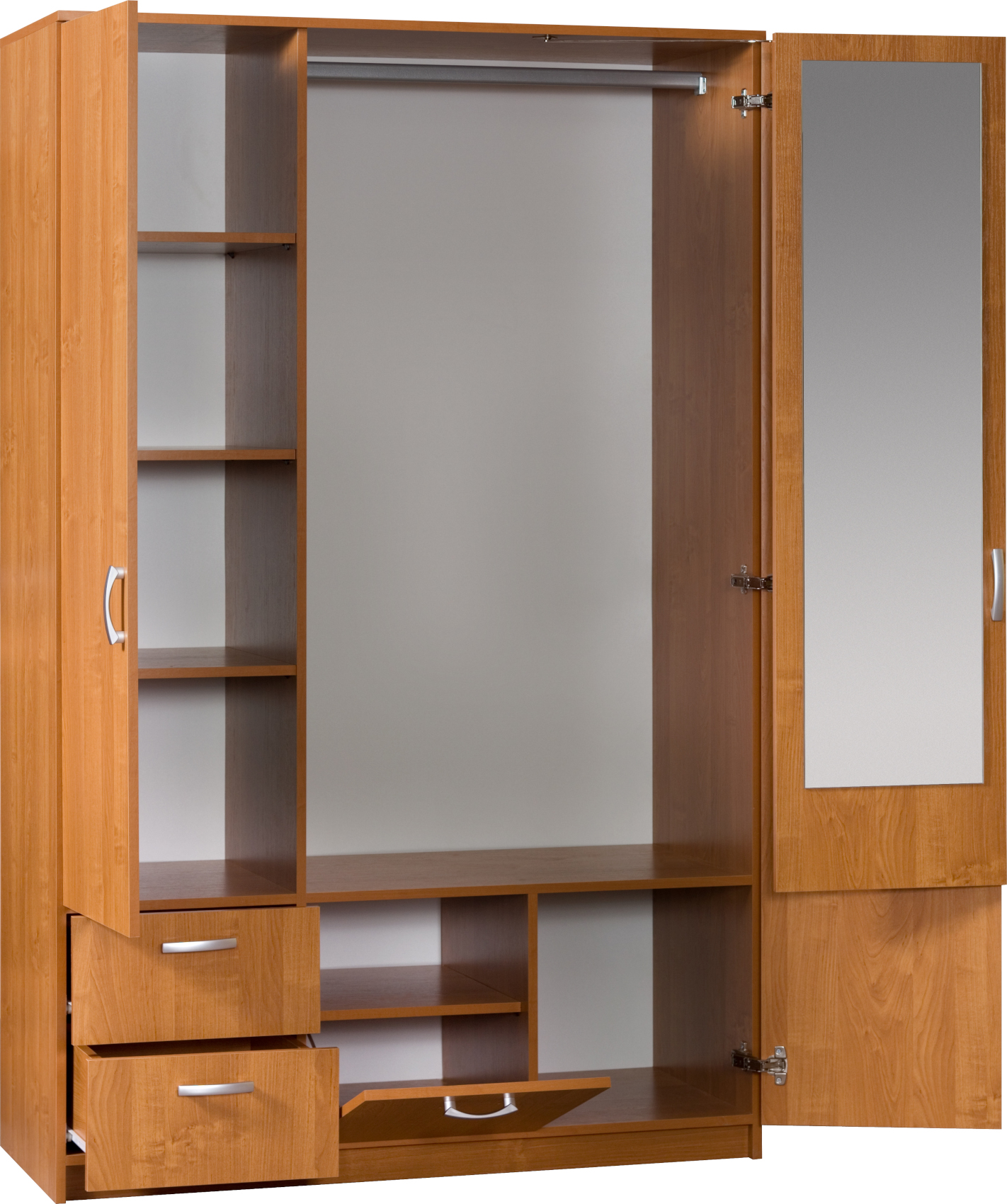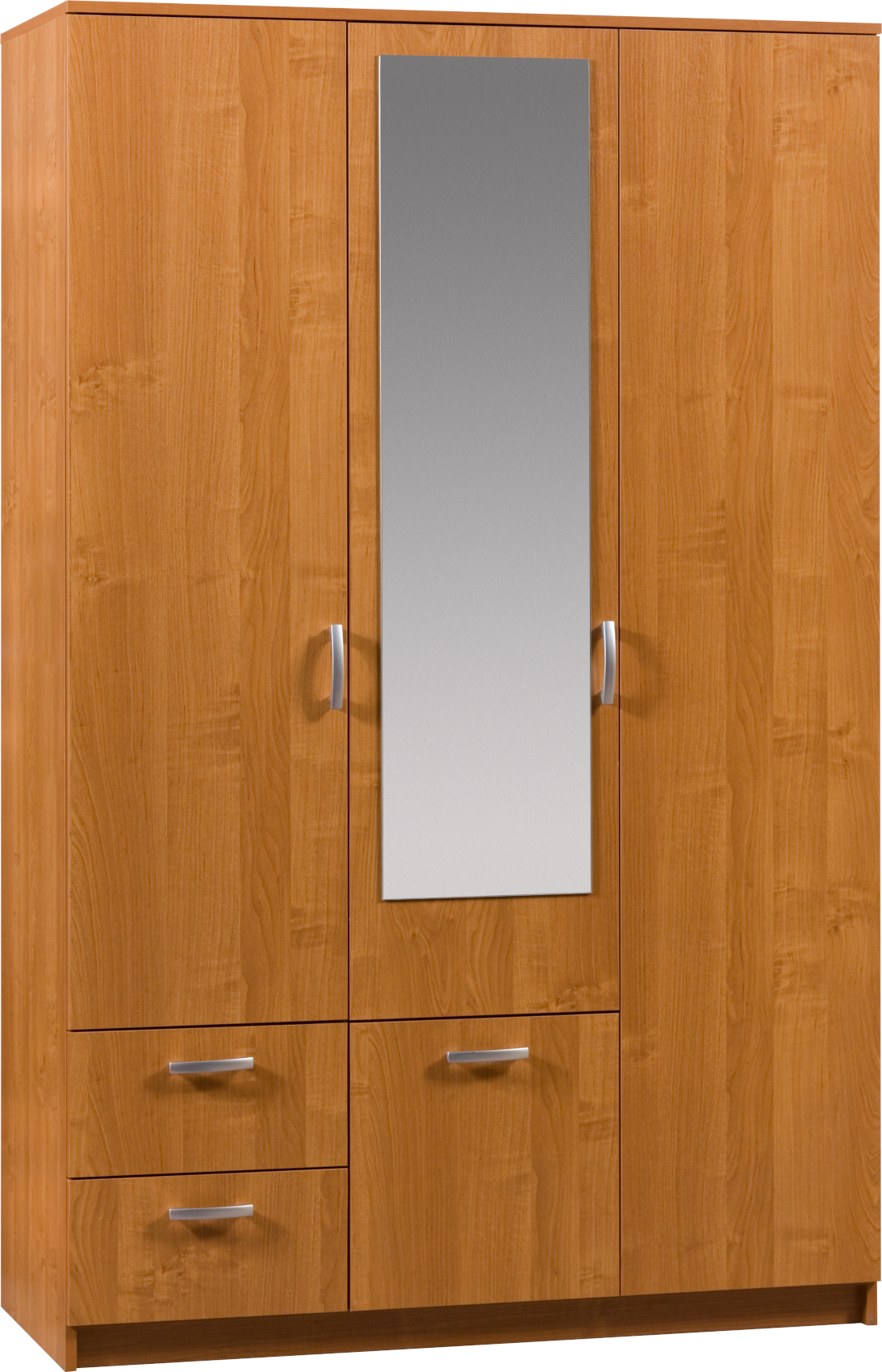 Praktická šatní skříň Venezia 2 se zrcadlem a zalamovacími dveřmi, disponuje velkým úložným prostorem. V levé části jsou tři výškově nastavitelné police, ve spodní části jsou dvě zásuvky. Na pravé straně je police a šatní tyč, v dolní části jsou výklopná dvířka (viz obrázek). Materiál 16 mm lamino, na výběr z několika barevných variant.