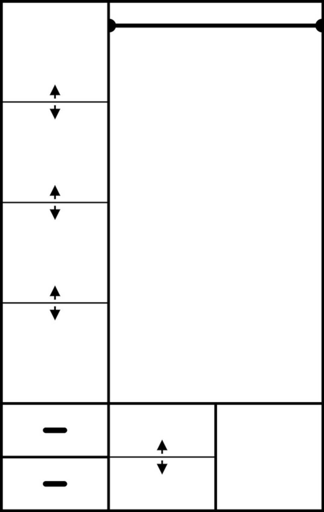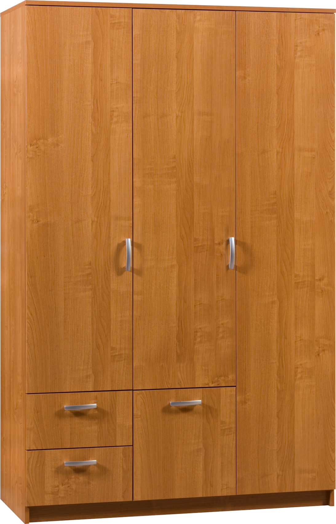 Praktická šatní skříň Venezia 2 bez zrcadla a se zalamovacími dveřmi, disponuje velkým úložným prostorem. V levé části jsou tři výškově nastavitelné police, ve spodní části jsou dvě zásuvky. Na pravé straně je police a šatní tyč, v dolní části jsou výklopná dvířka (viz obrázek). Materiál 16 mm lamino, na výběr z několika barevných variant.