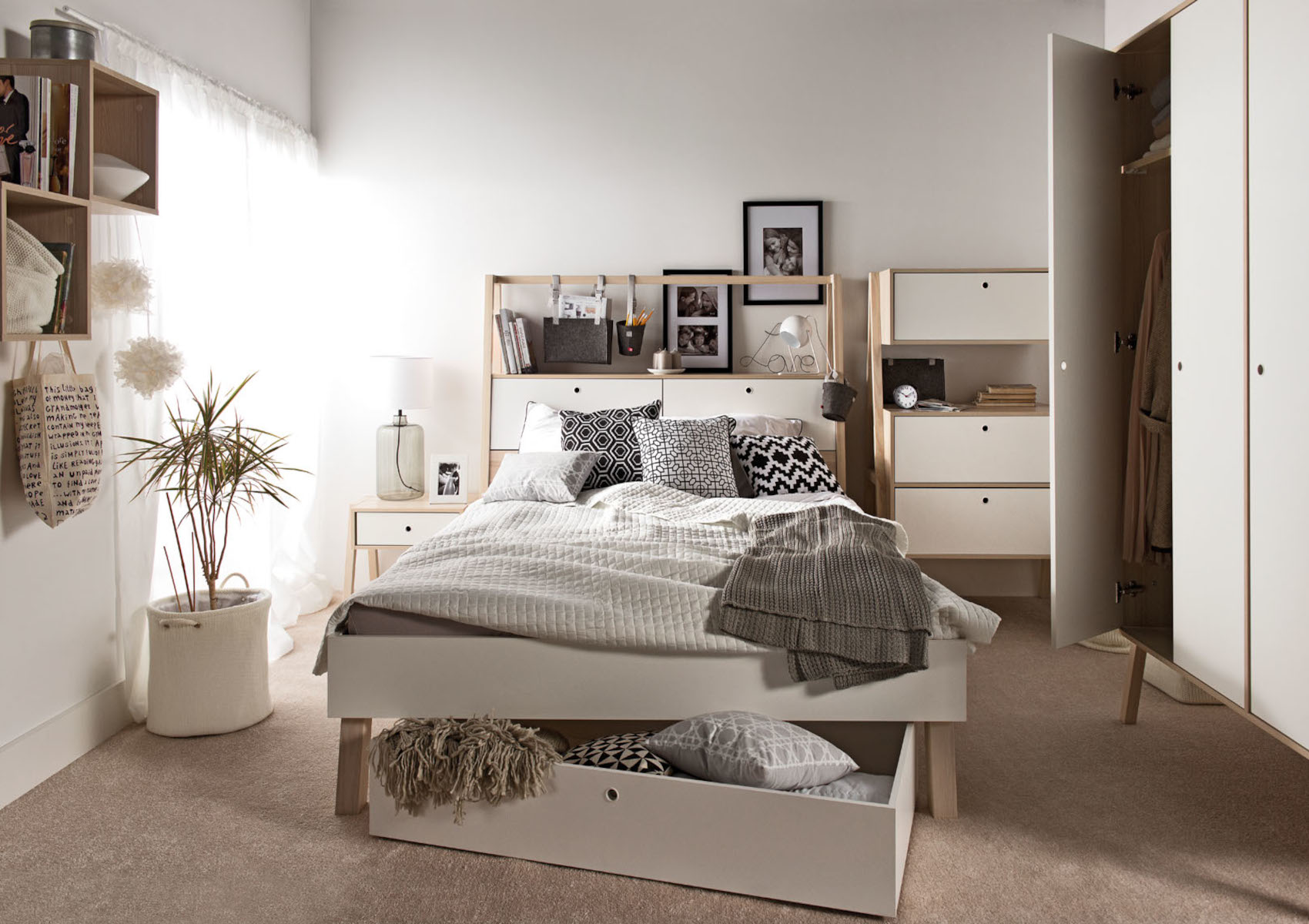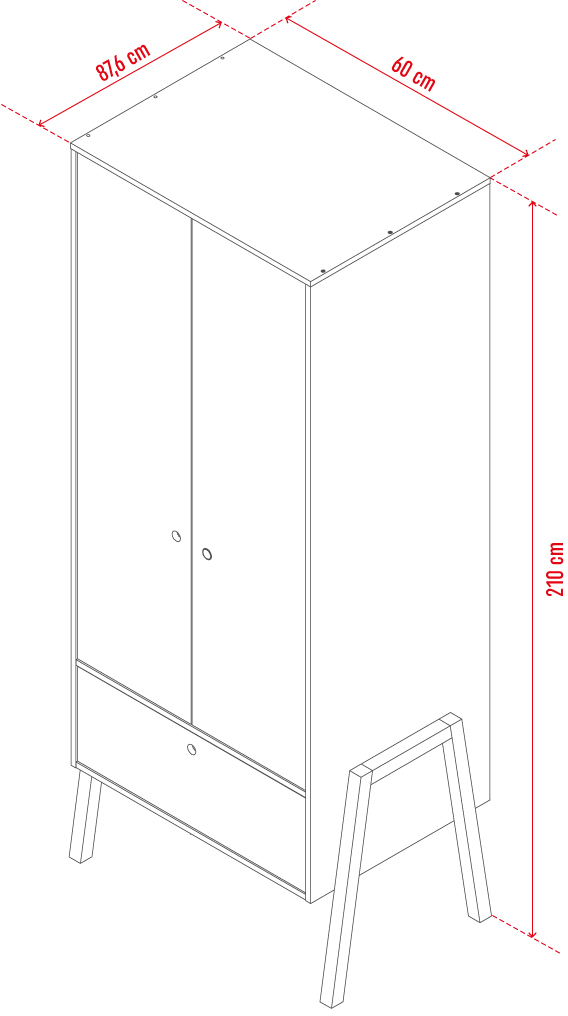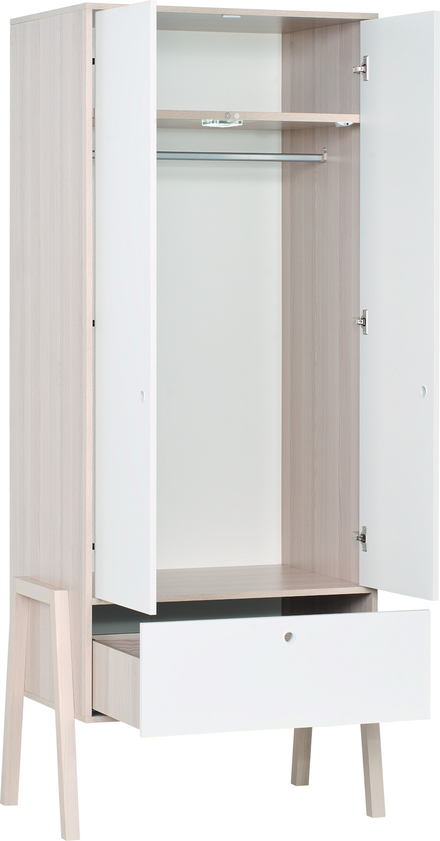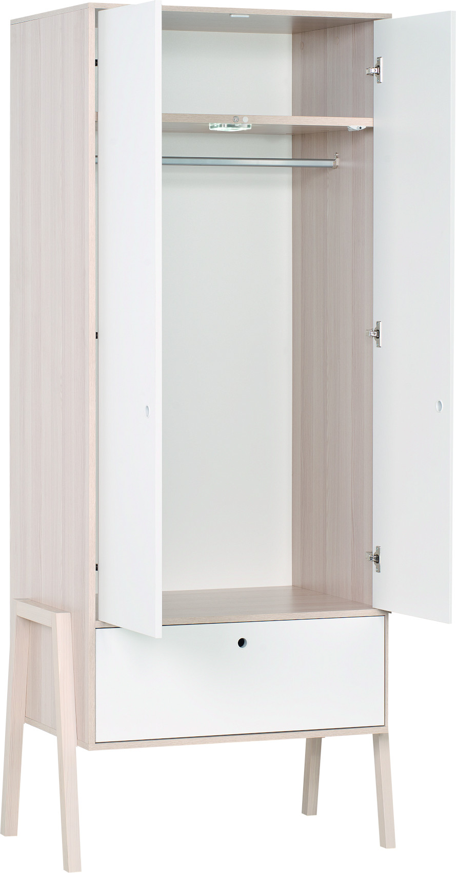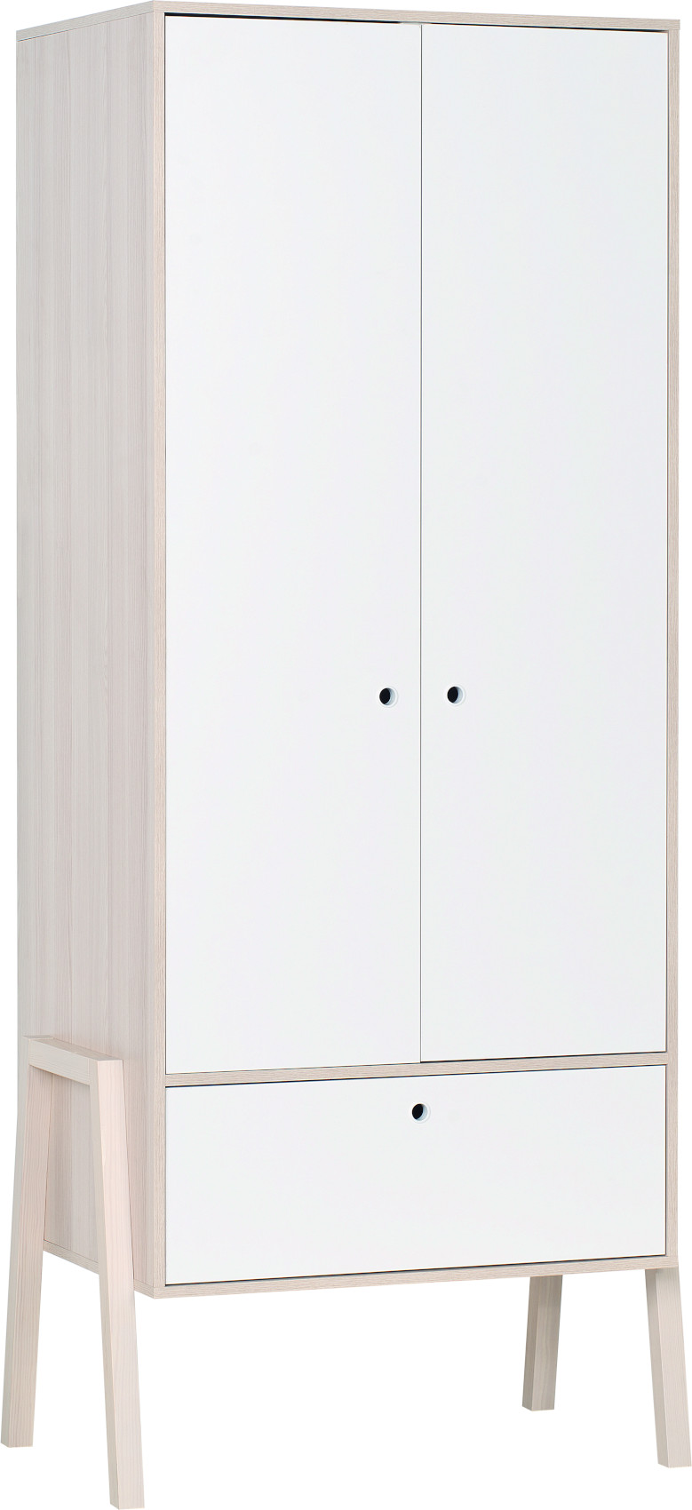 Dvoudveřová šatní skříň Spot vás zaujme svým prostým designem v odstínu akátového dřeva v kombinaci s bílým lakem. Je vyrobena z kvalitního lamina o síle 16 mm a 22 mm odolného vůči nečistotám a poškrábání. Úzké vysoké nožky, které dodají nábytku nádech elegance a provzdušní váš interiér, jsou z masivního borovicového dřeva chráněné speciálním lakováním. Zásuvka je vybavena systémem tichého dovírání.
