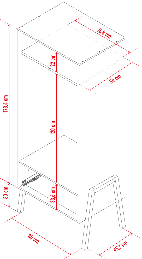 Součástí skříně je 1 šatní tyč, nad kterou je 1 velká police a po dní je nainstalováno LED osvětlení. Ve spodní části je 1 zásuvka na kovových pojezdech.
