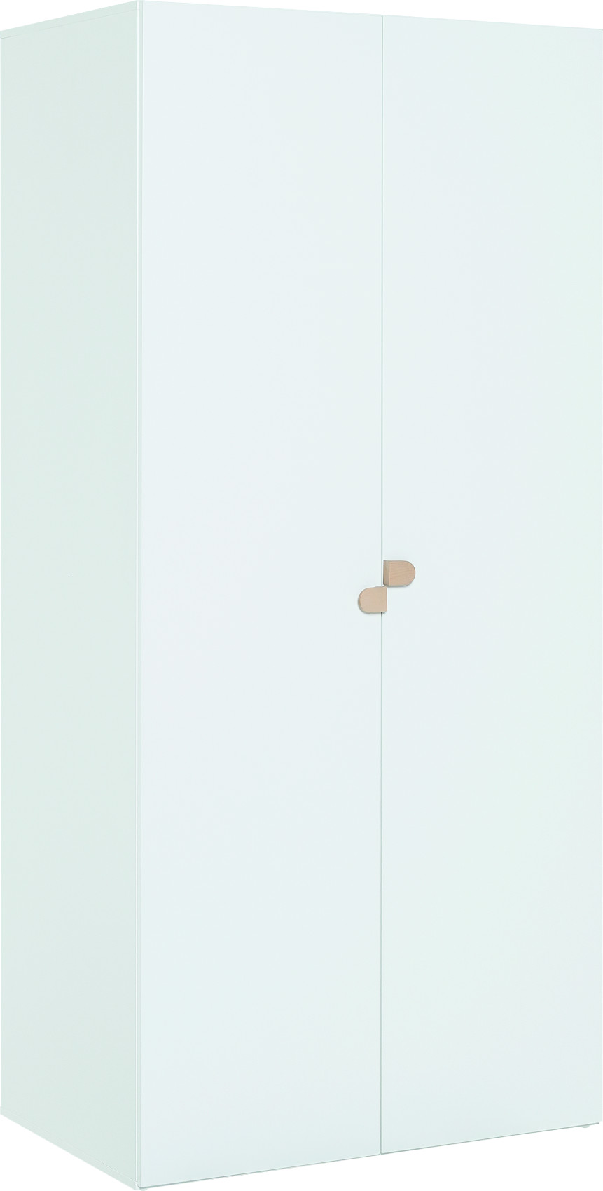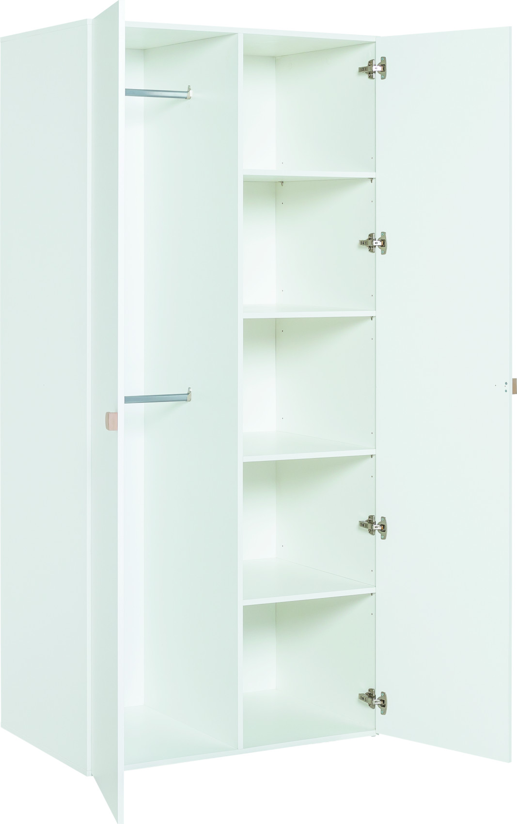 Moderní dvoudveřová šatní skříň Stige vás zaujme svým jednoduchým designem v bílém odstínu. Je vyrobena z kvalitního lamina o síle 16 mm, které je odolné vůči poškrábání a nečistotám. Zaoblené úchyty jsou z masivního bukového dřeva. Při nerovné podlaze můžete nízké nožky vyvýšit až o 0,5 cm.