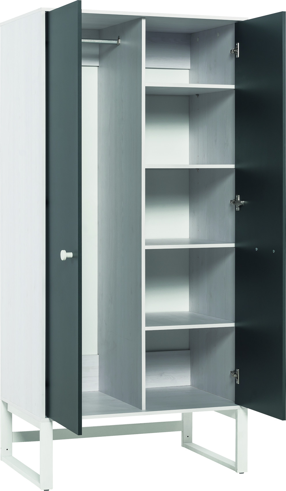 Za pravými dvířky jsou vloženy 4 police s libovolně nastavitelnou výškou a v levé části je šatní tyč.
