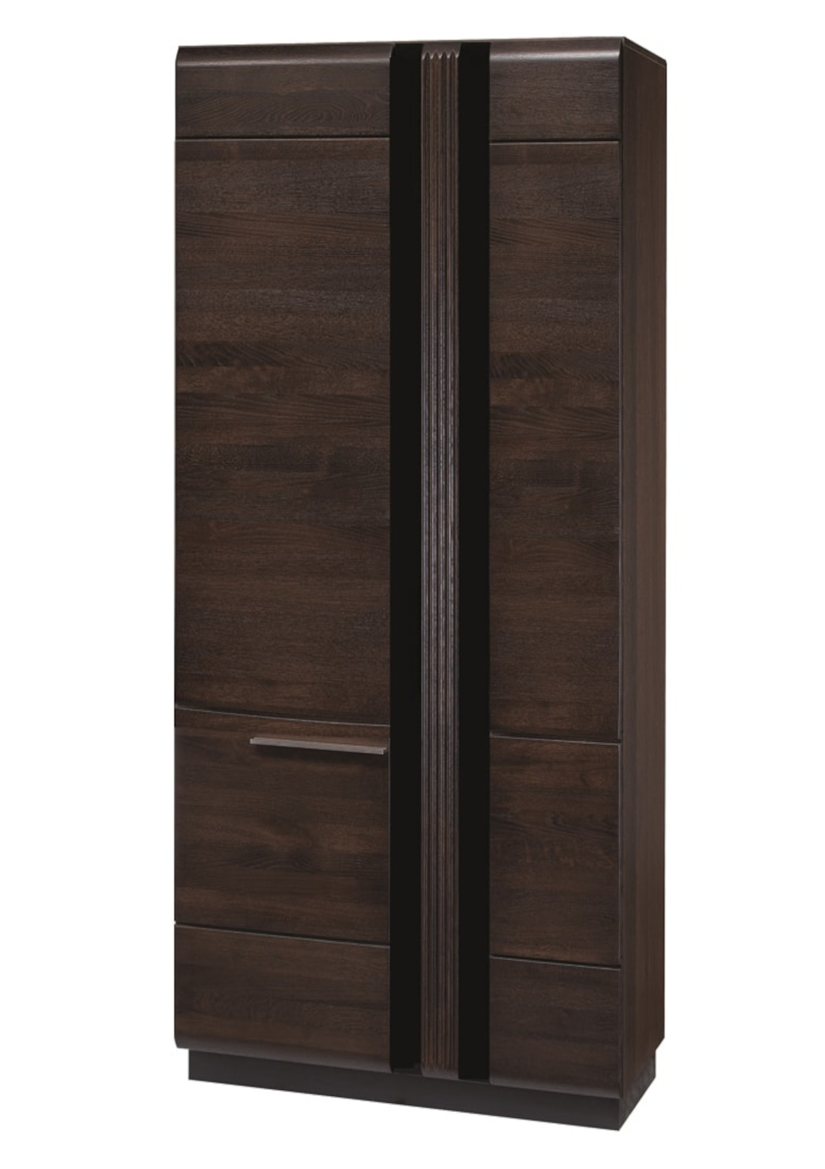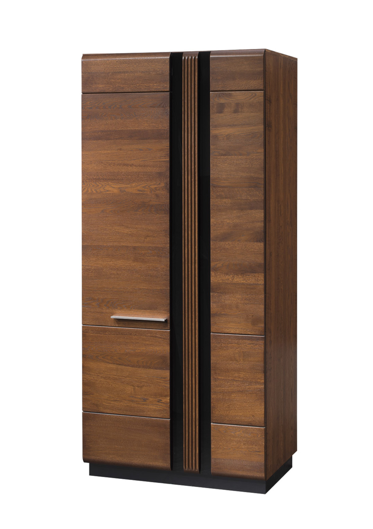 Moderní dvoudveřová skříň Porti 70 vás zaujme svým luxusním designem. Přední část je vyrobena z masivního dubového dřeva s černými skleněnými detaily a korpus je z přírodní dubové dýhy. Celý systém Porti má kovové úchytky. Máte na výběr ze 2 barevných variant.