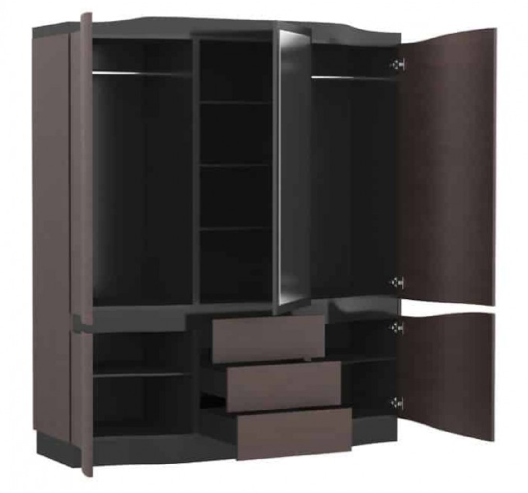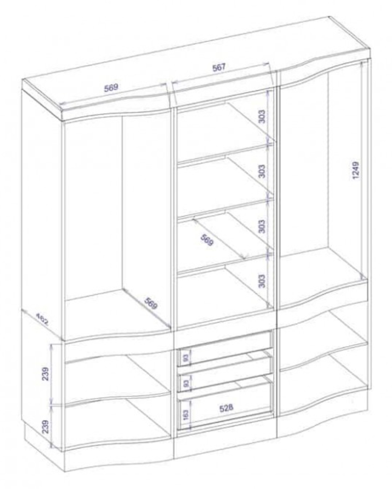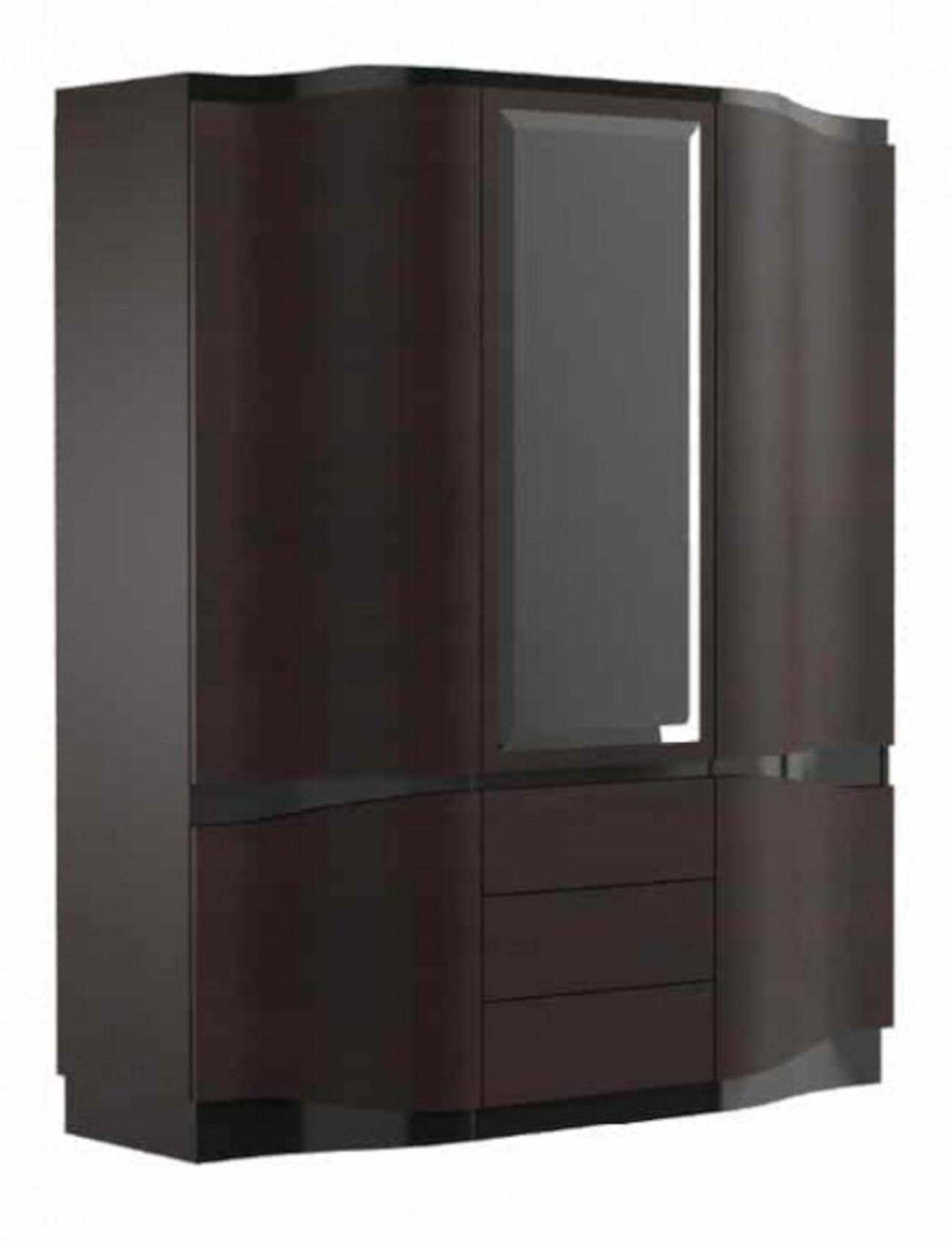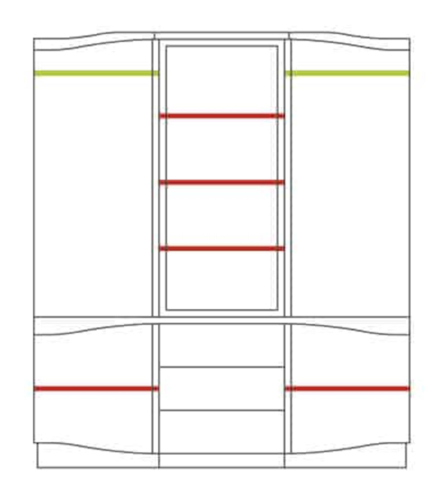 Skříň má 4 plná dvířka 1 dvířka se zrcadlem. V krajních částech jsou 2 šatní tyče se 2 spodními lakovanými policemi a uprostřed jsou vloženy 3 lakované police a pod nimi jsou 3 zásuvky na kovových pojezdech.