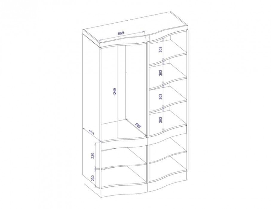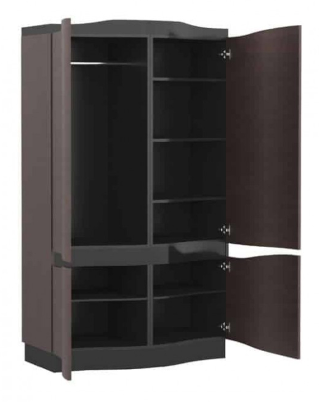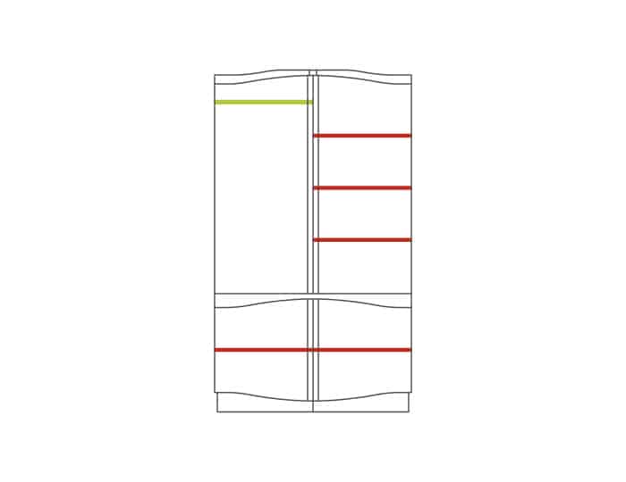 Skříň má 4 plná dvířka. V horní části je vložena 1 šatní tyč s 3 lakovanými policemi a ve spodní části jsou 2 lakované police.