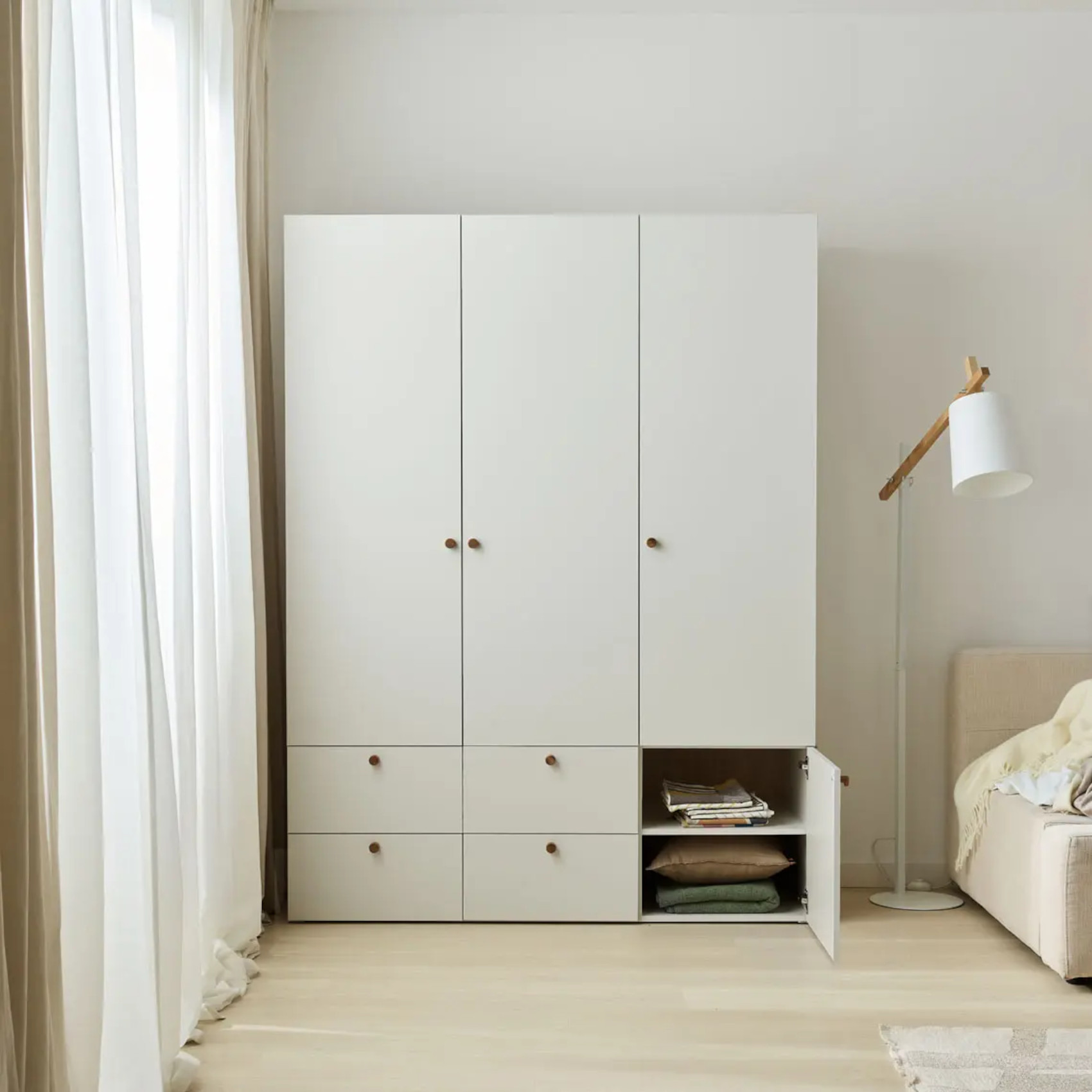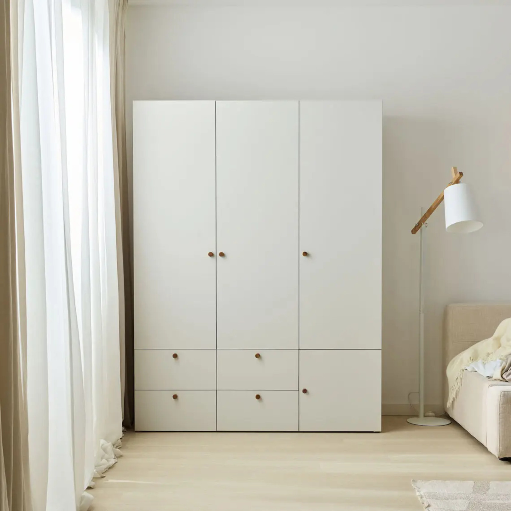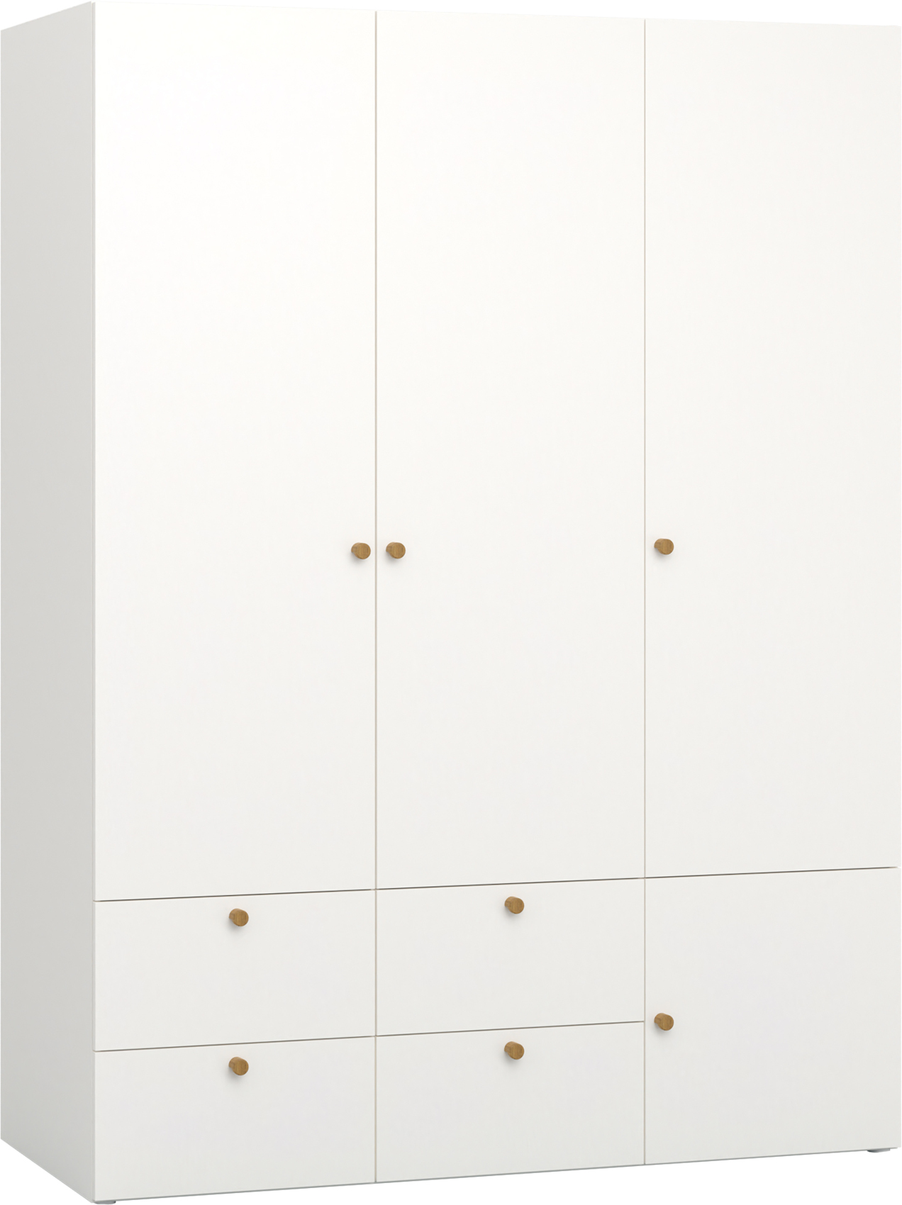 Třídveřová šatní skříň Reli vás zaujme svým jednoduchým designem s moderními prvky v alabastrově bílém odstínu. Je vyrobena z kvalitního lamina o síle 16 mm a 22 mm, která vám zaručí odolnost vůči poškození. Úchyty jsou z přírodního bukového dřeva. Zadní části skříně při otevření si můžete vybrat ze 3 odstínů - dub, indigo nebo šedá. Dvířka i zásuvky mají zabudovaný systém tichého dovíraní.