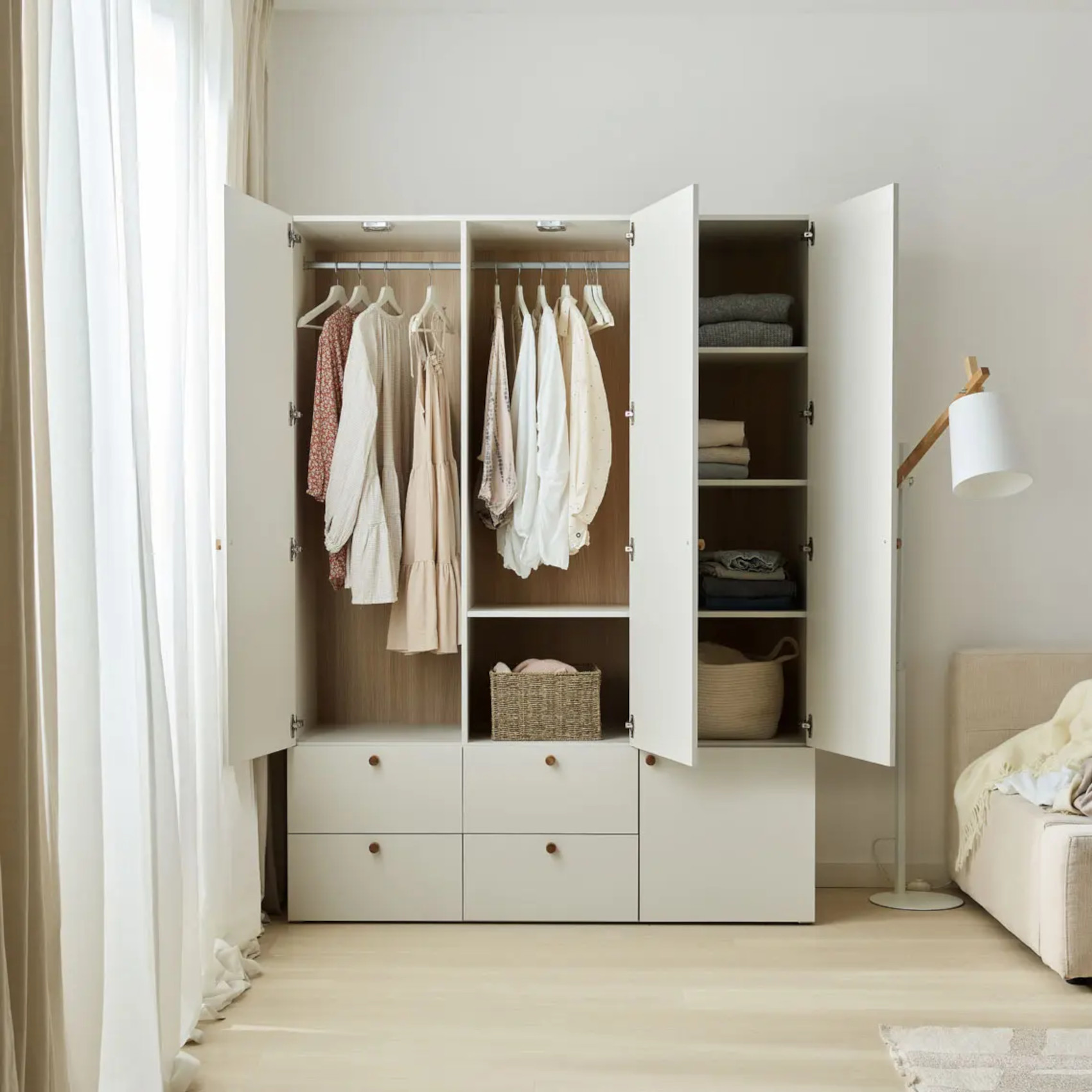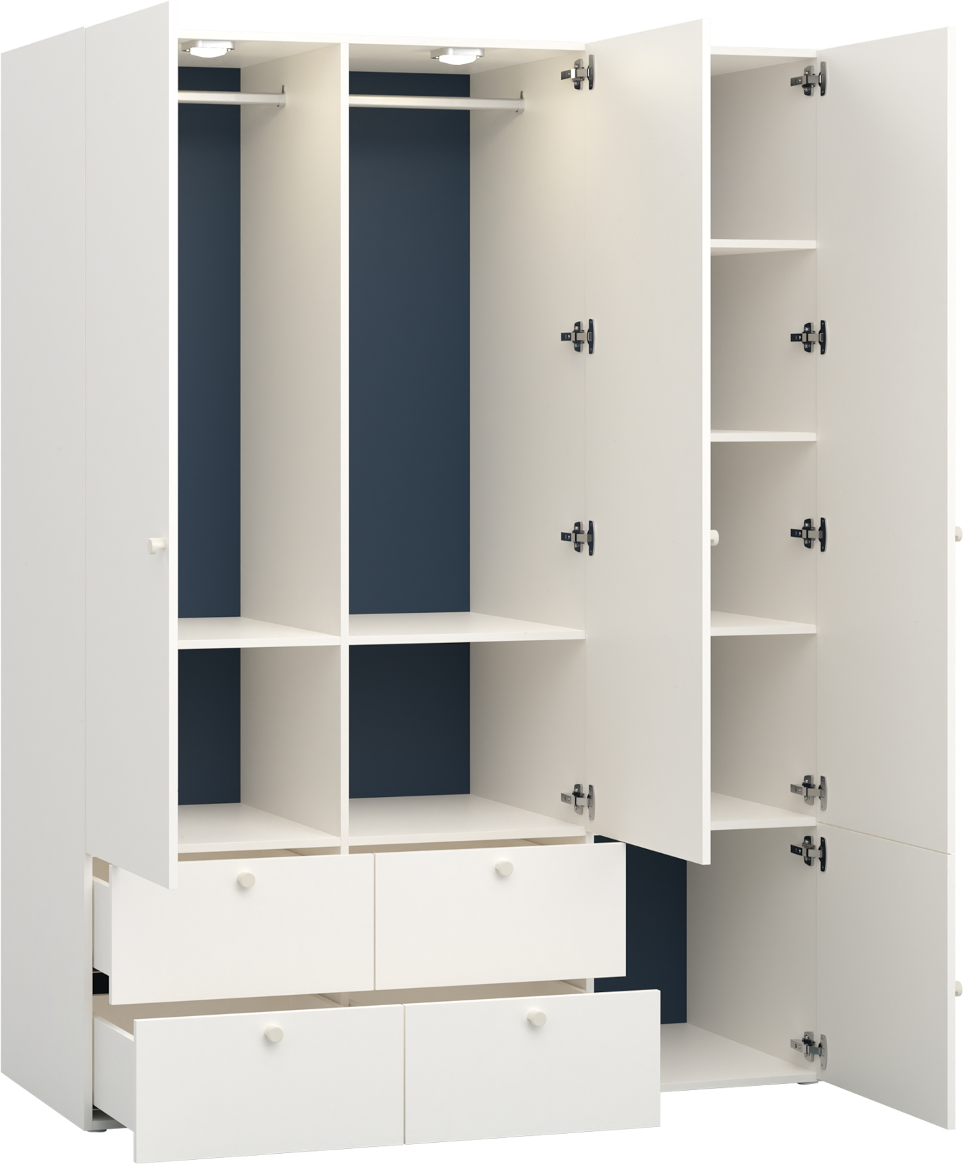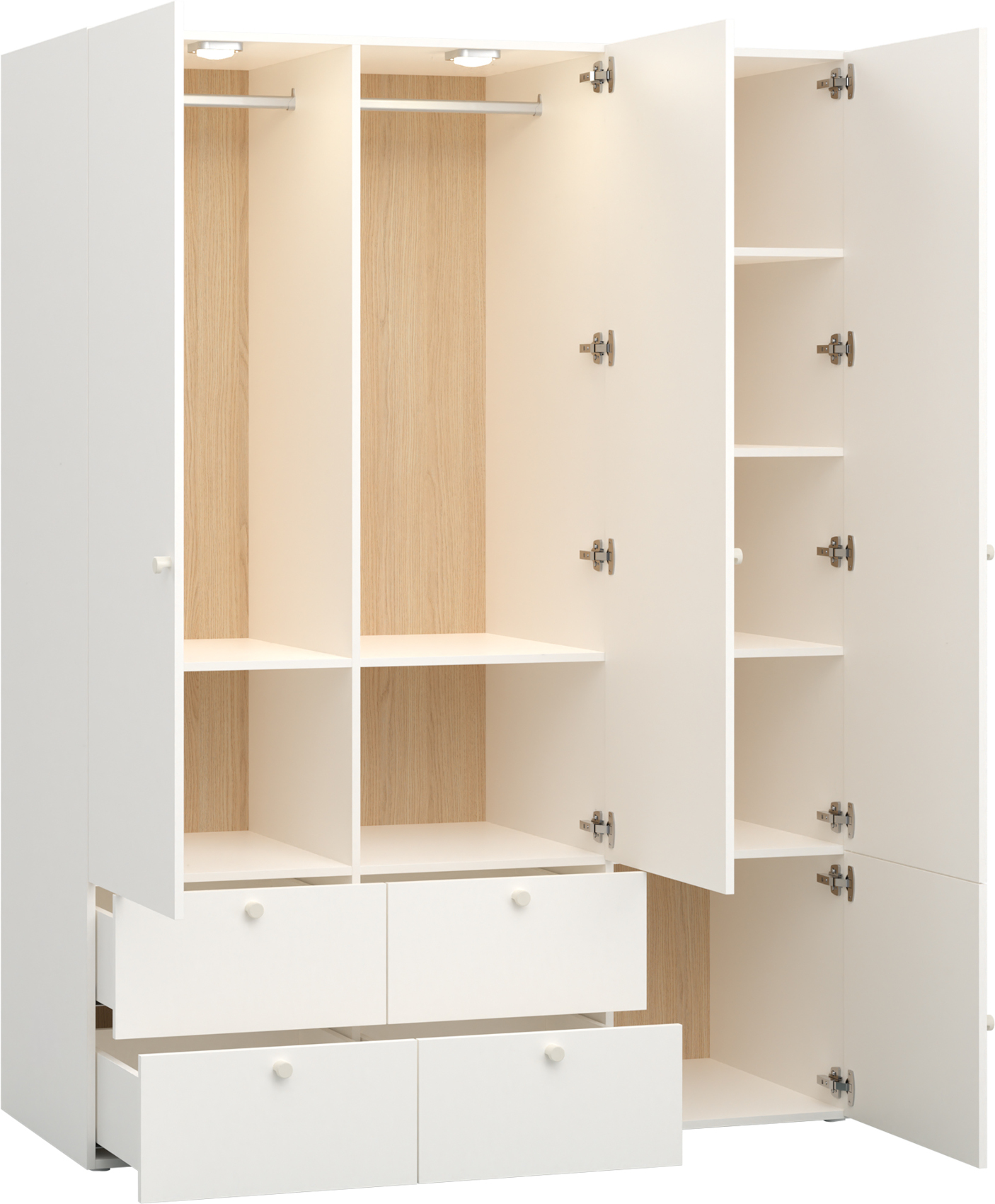 Součástí skříně jsou 3 dvířka, za kterými jsou vloženy 2 šatní tyče a 6 polic, z nichž 3 mají libovolně nastavitelnou výšku. V levé části jsou 2 dvojité prostorné zásuvky na kovových pojezdech. Skříň má zabudované LED osvětlení s pohybovým senzorem, které se rozsvítí při otevření.