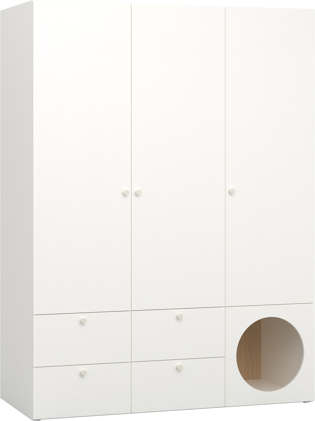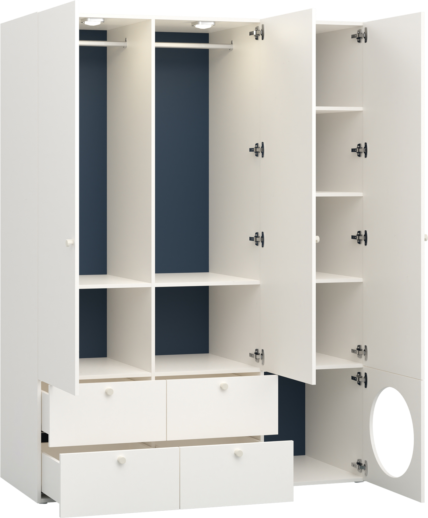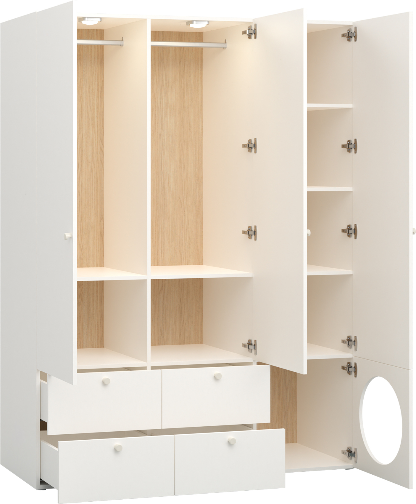 Součástí skříně jsou 3 dvířka, za kterými jsou vloženy 2 šatní tyče a 6 polic s libovolně nastavitelnou výškou. Ve spodní části jsou malá dvířka s otvorem, které můžete využít např. jako prostor pro domácí zvířátko. V levé části jsou 2 dvojité prostorné zásuvky na kovových pojezdech. Skříň má zabudované LED osvětlení s pohybovým senzorem, které se rozsvítí při otevření.