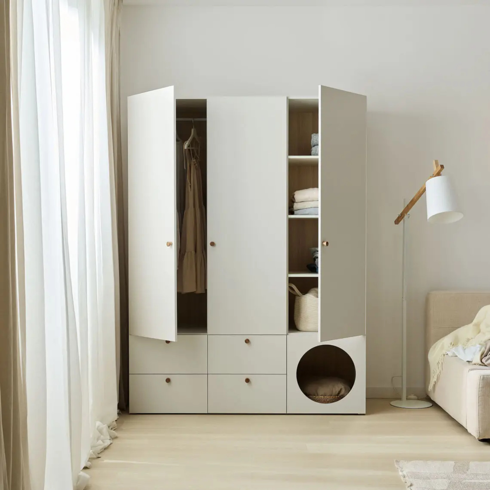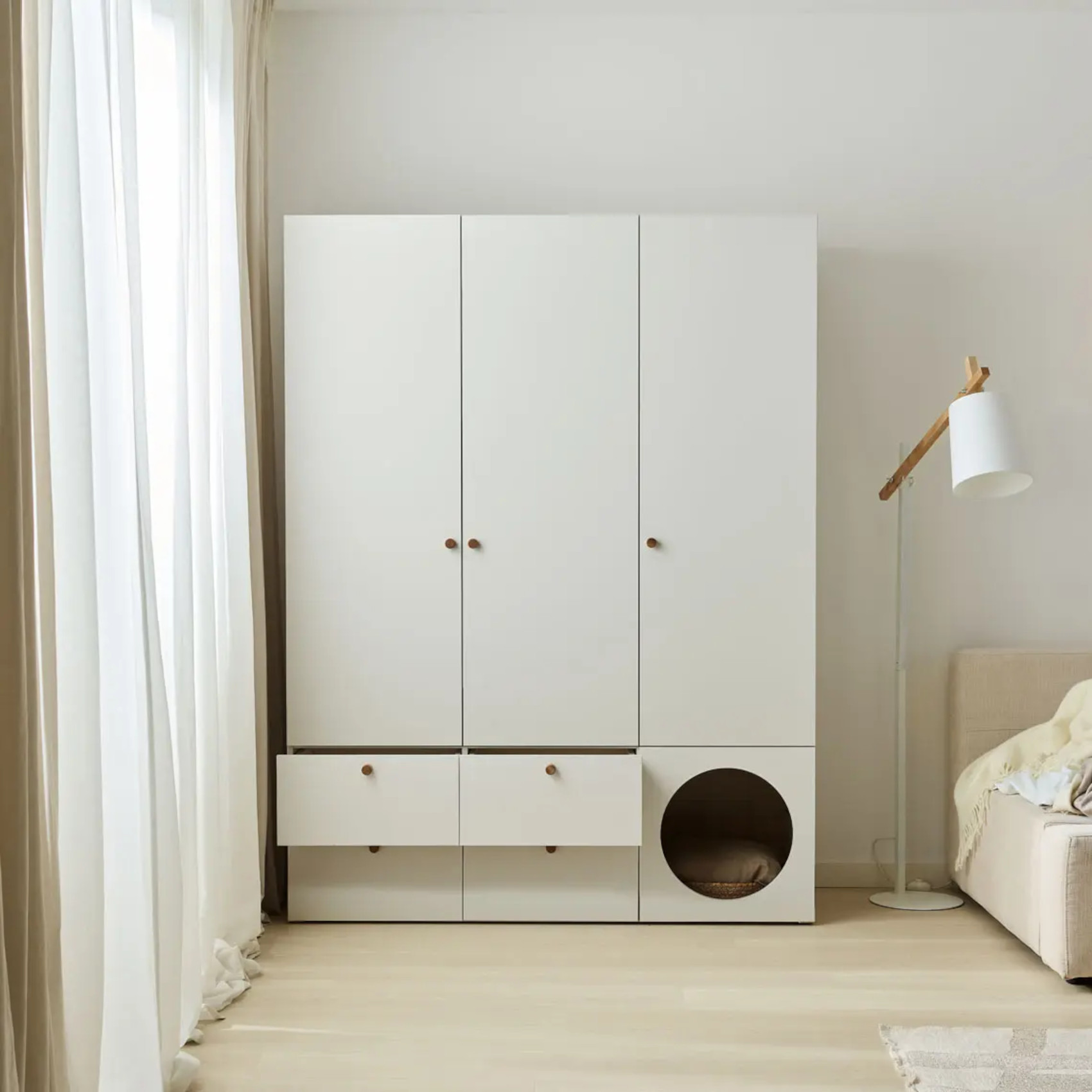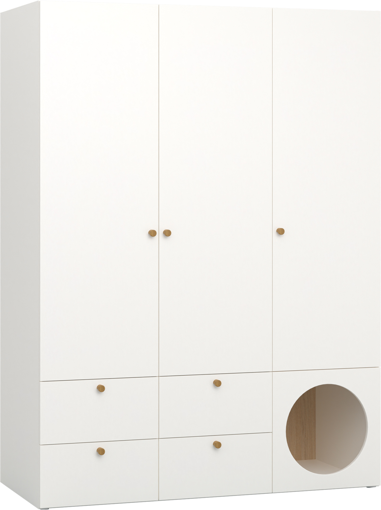 Součástí skříně jsou 3 dvířka, za kterými jsou vloženy 2 šatní tyče a 6 polic s libovolně nastavitelnou výškou. Ve spodní části jsou malá dvířka s otvorem, které můžete využít např. jako prostor pro domácí zvířátko. V levé části jsou 2 dvojité prostorné zásuvky na kovových pojezdech. Skříň má zabudované LED osvětlení s pohybovým senzorem, které se rozsvítí při otevření.
