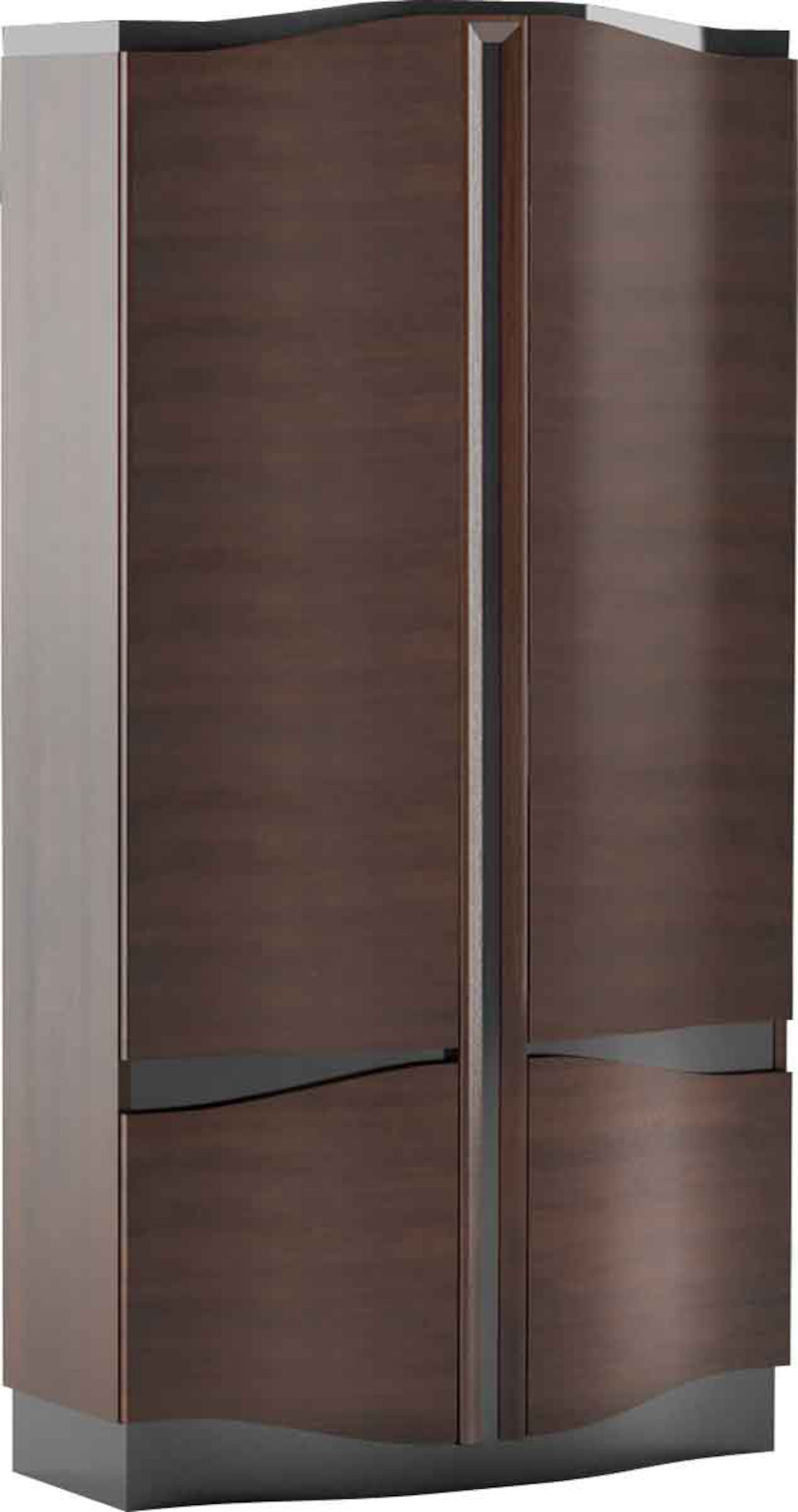 Šatní skříň Diuna II malá vás zaujme svým moderním a elegantním designem. Jedinečným prvkem jsou dvířka ve tvaru vlny. Skříň je vyrobena z masivu a masivní třešňové dýhy s černými lakovanými detaily. Kvalitní lakování a moření dodává nábytku přirozený vzhled a zvýrazňuje jeho strukturu lét. Systémový nábytek Diuna má jednouchý dotykový systém otevírání dvířek - Push to open.