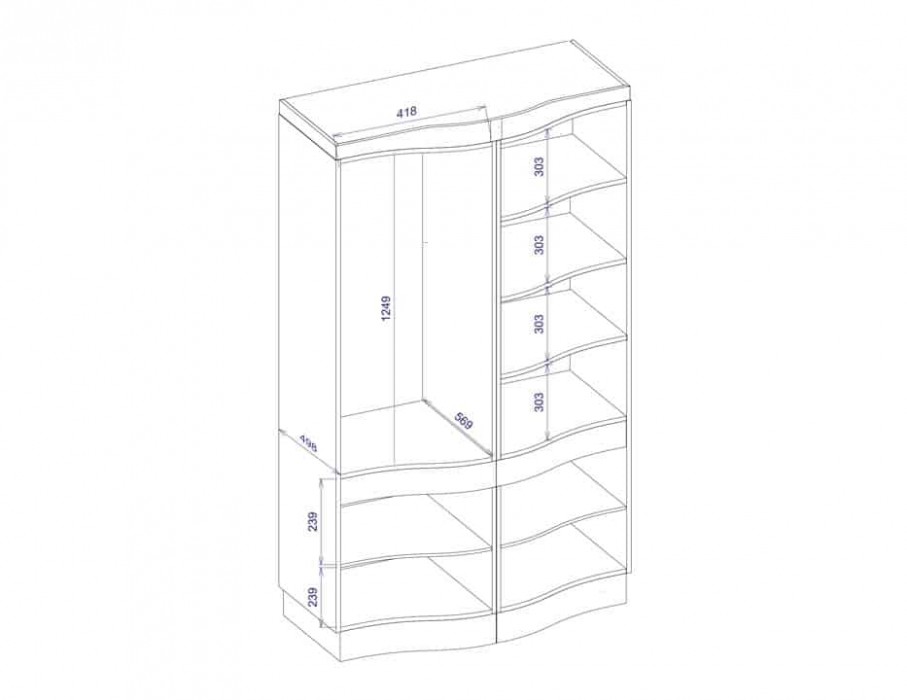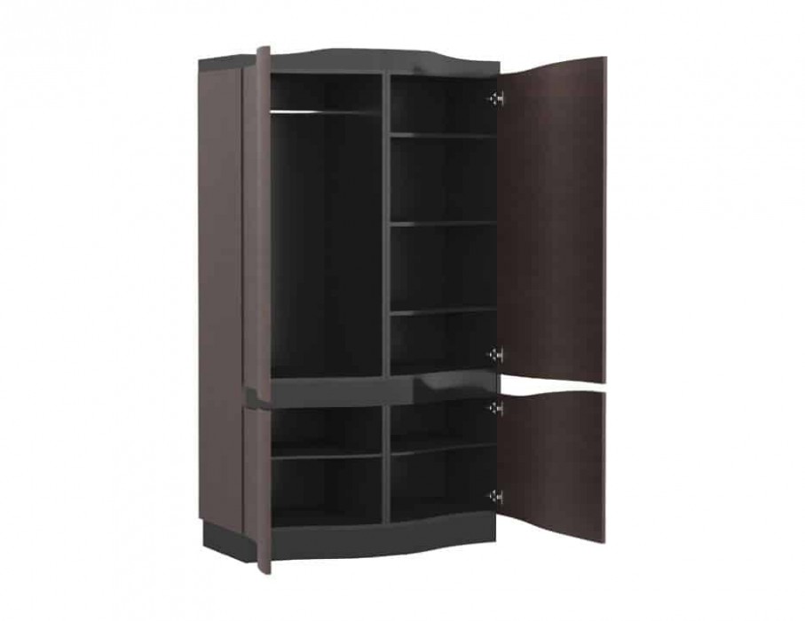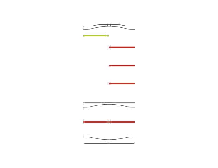 V horní části skříně, za plnými dvířky, je vložena 1 šatní tyč s 3 lakovanými policemi. Spodní část má 2 malé plná dvířka s 2 lakovanými policemi.