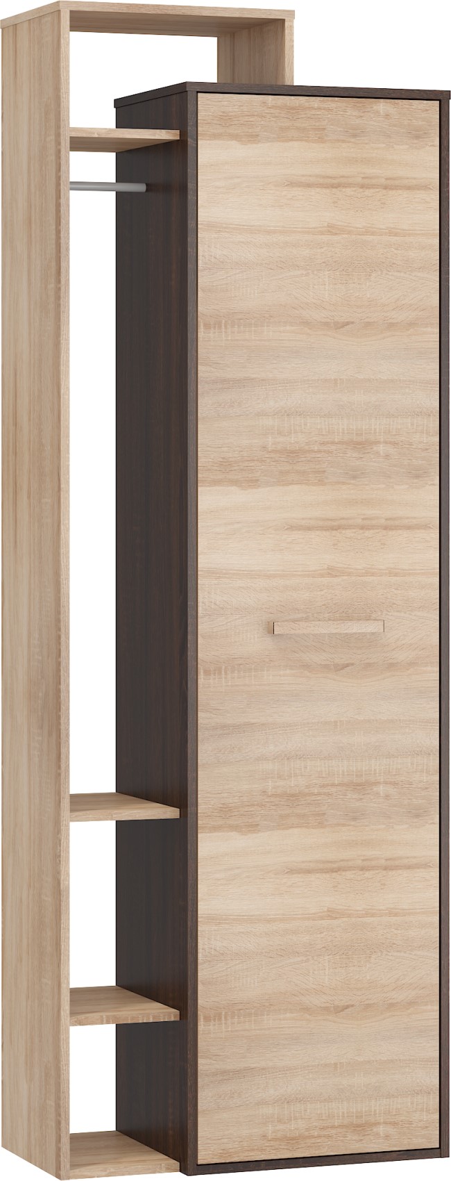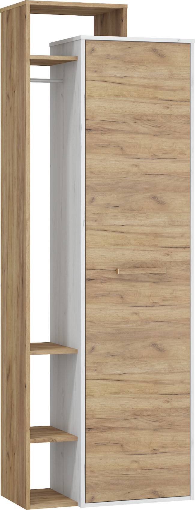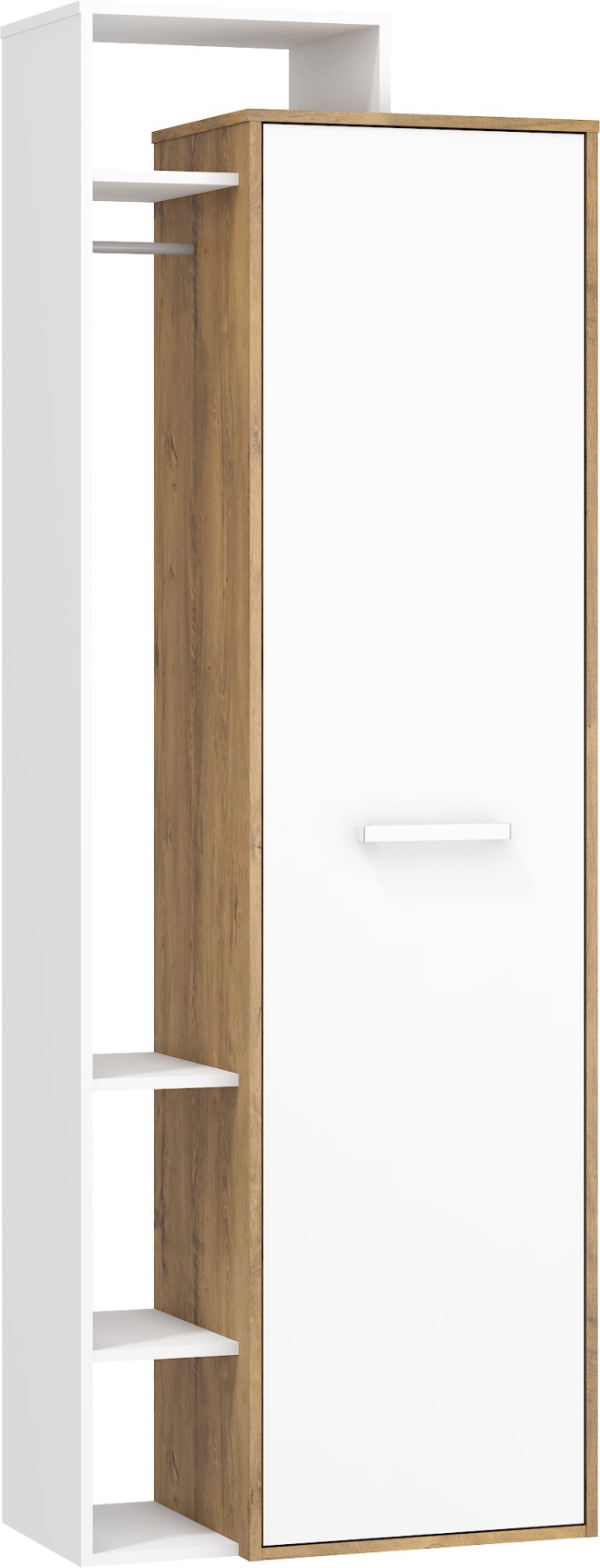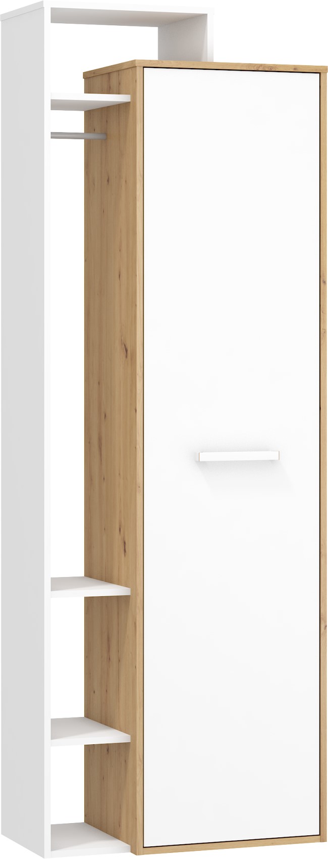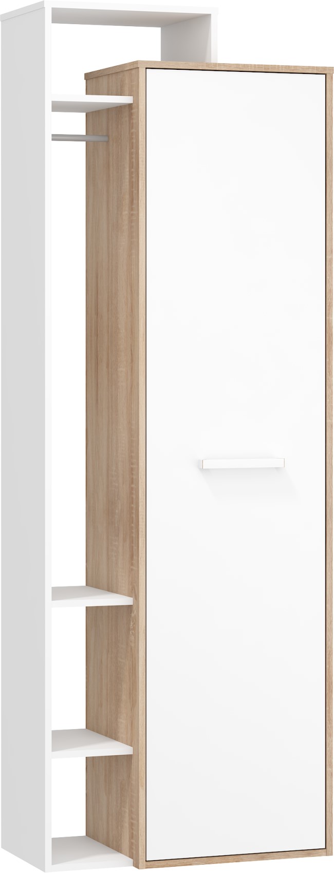 Součástí jsou dvířka, za kterými je vložena 1 šatní tyč a 2 lakované police.