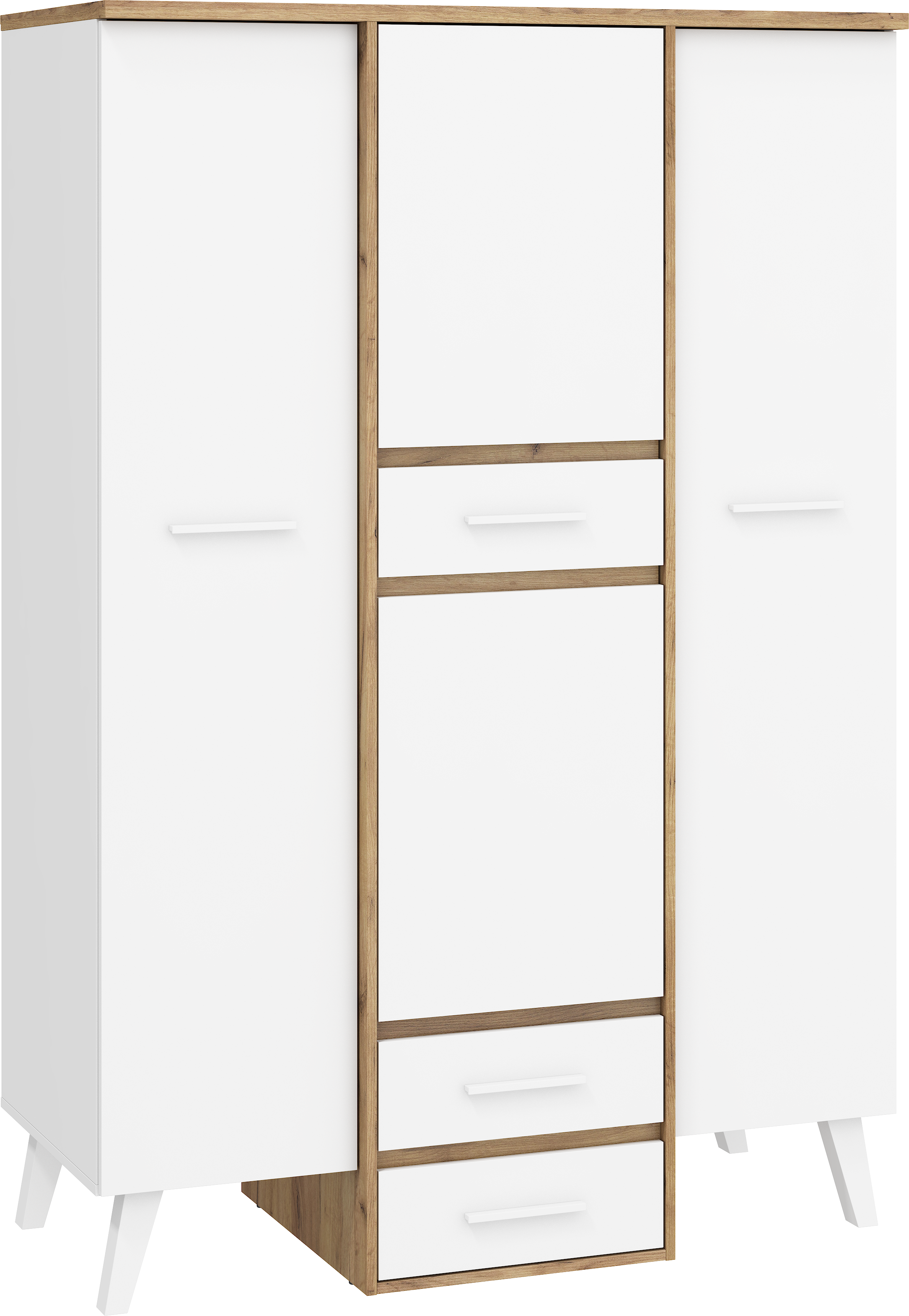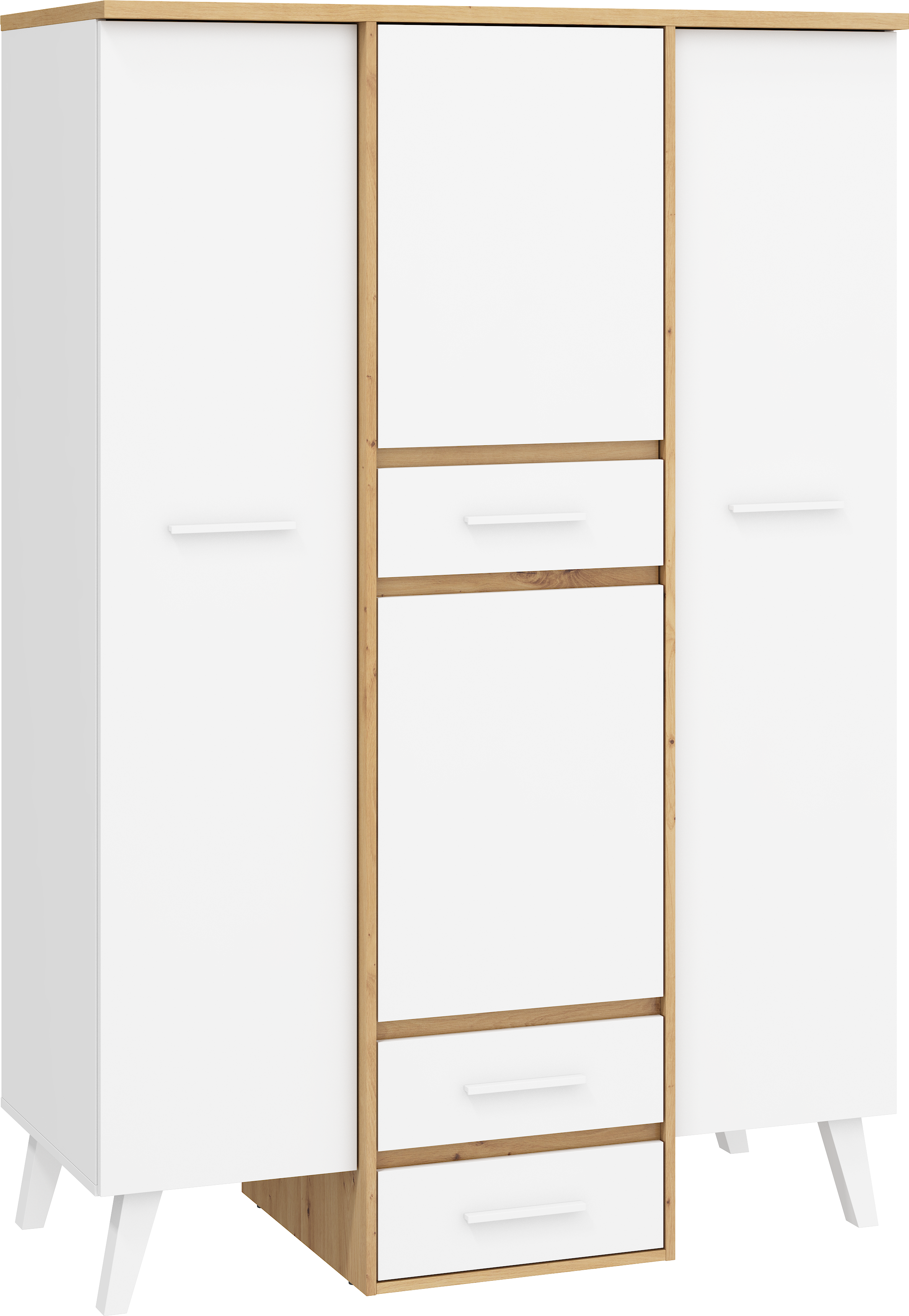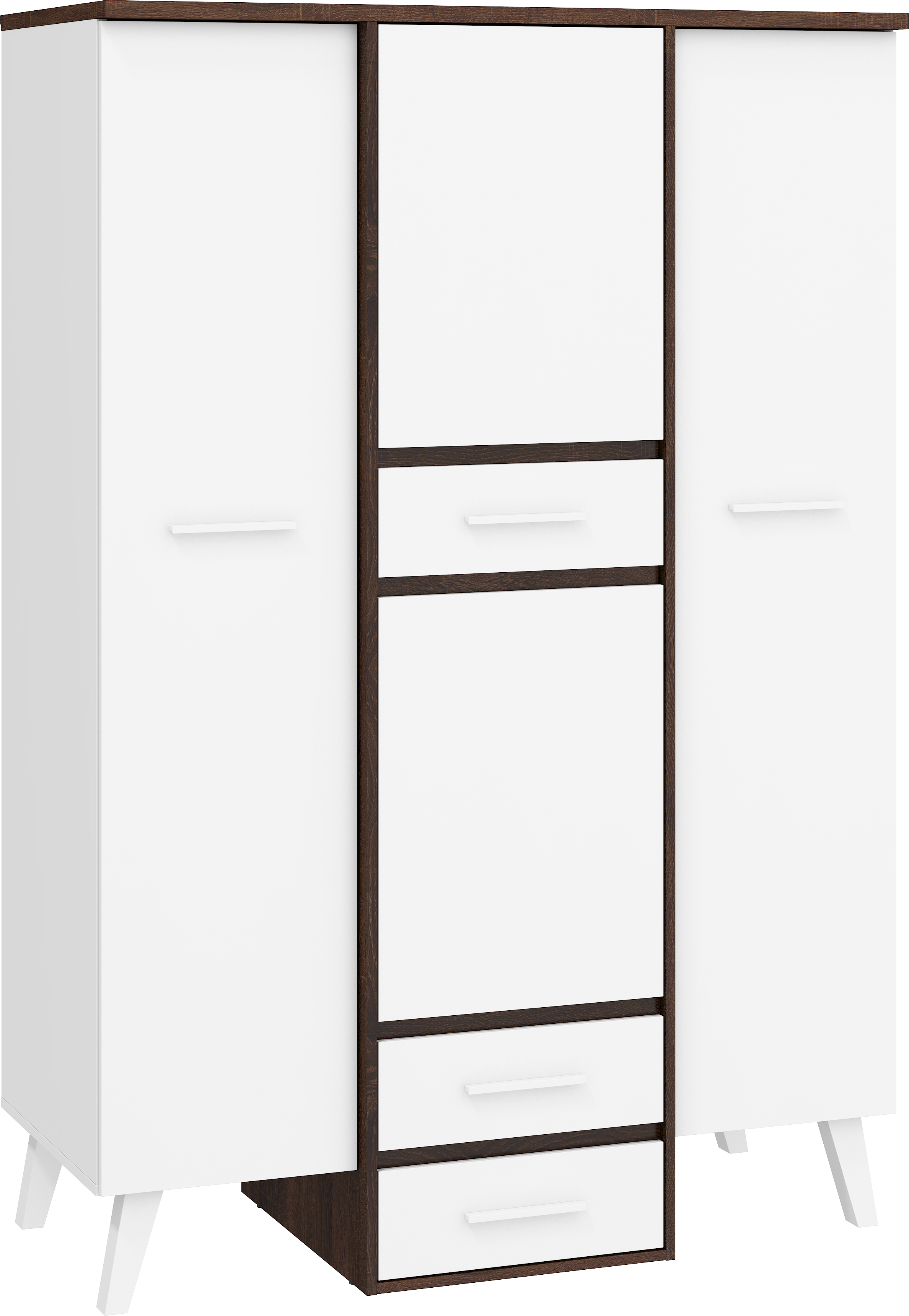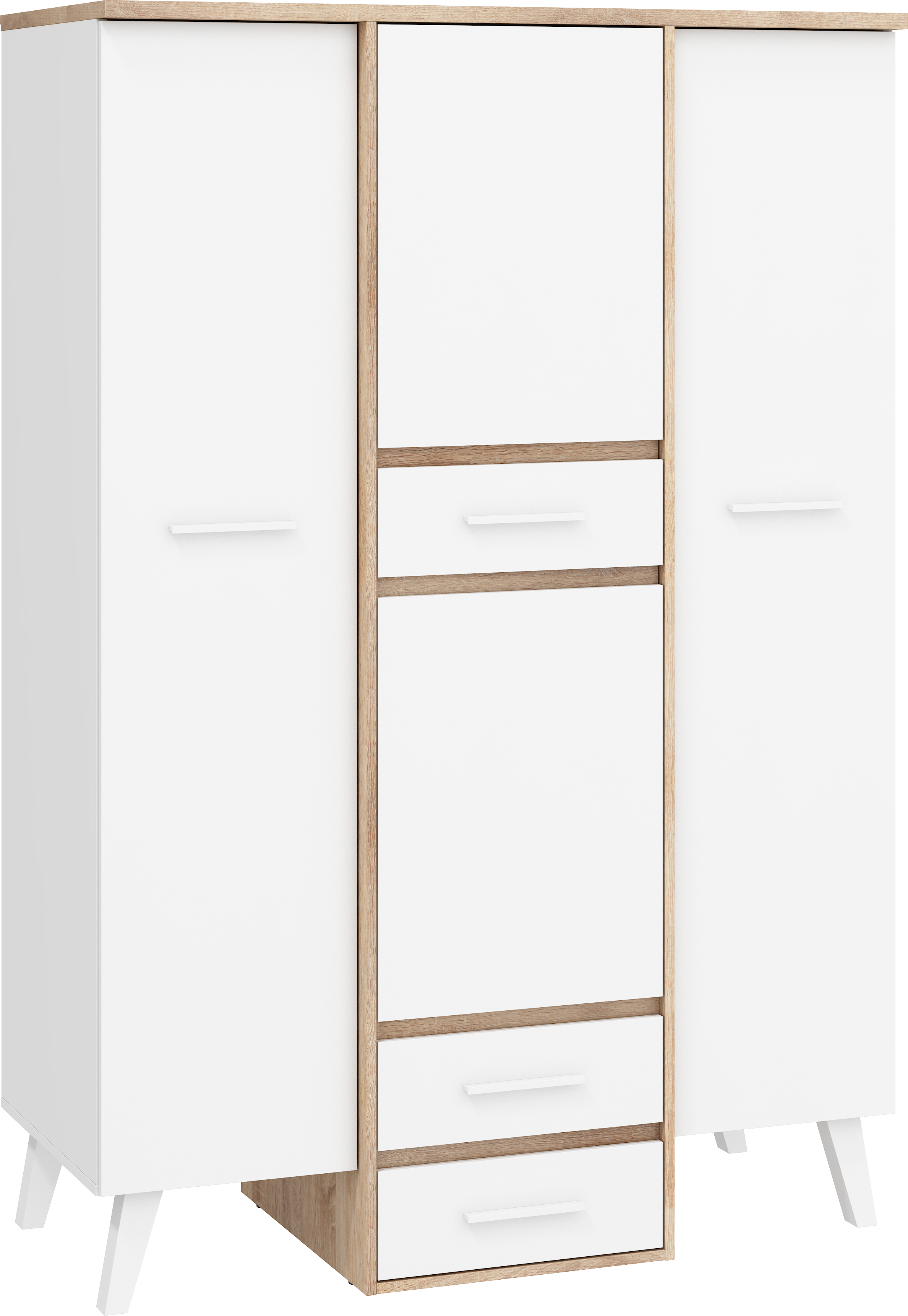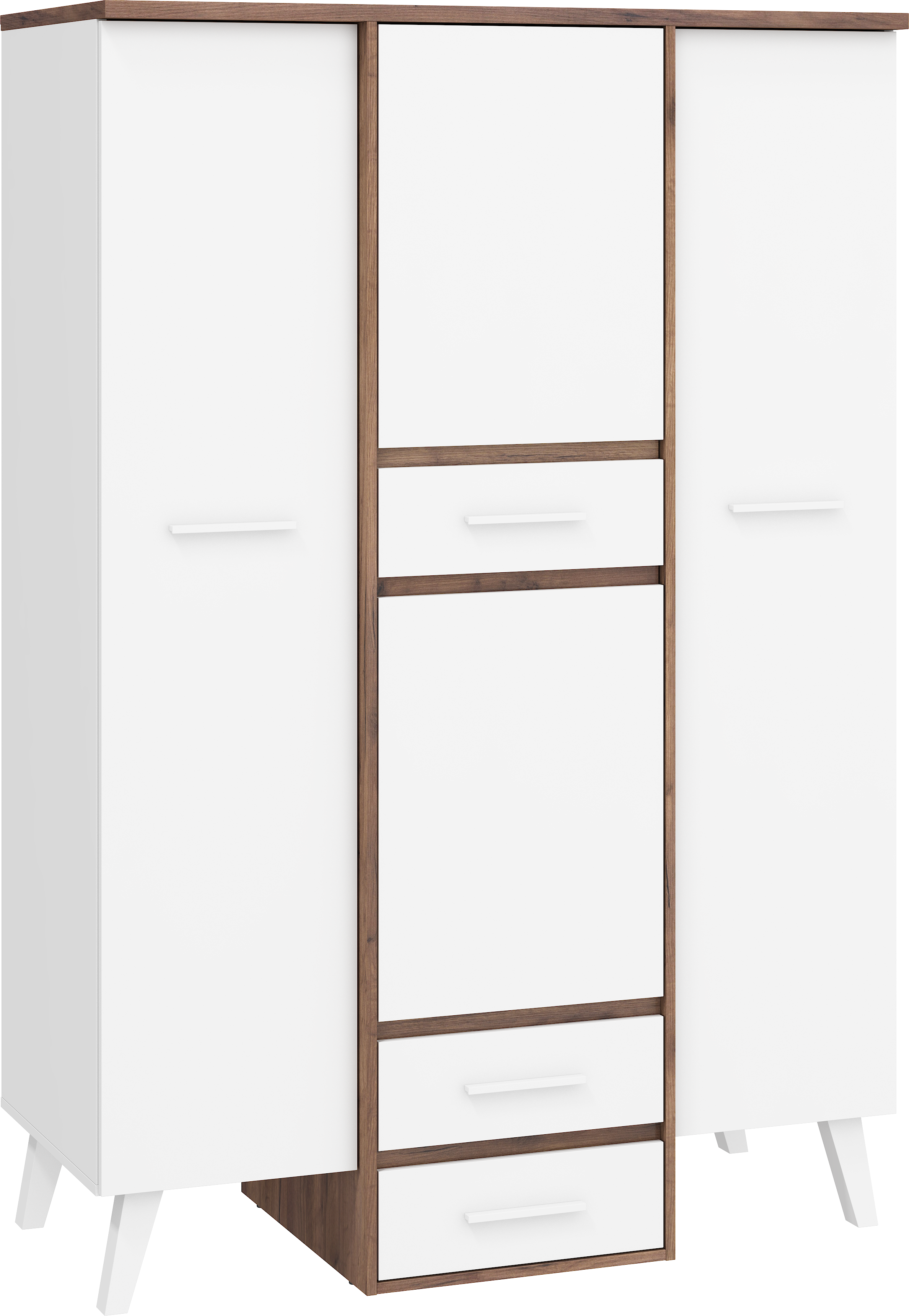 Skříň Nordis 16 stylově doplní vaši domácnost. Skříň je vybavená 2 zásuvkami, 4 policemi ve střední části a šatní tyčí s policí v částech krajních.