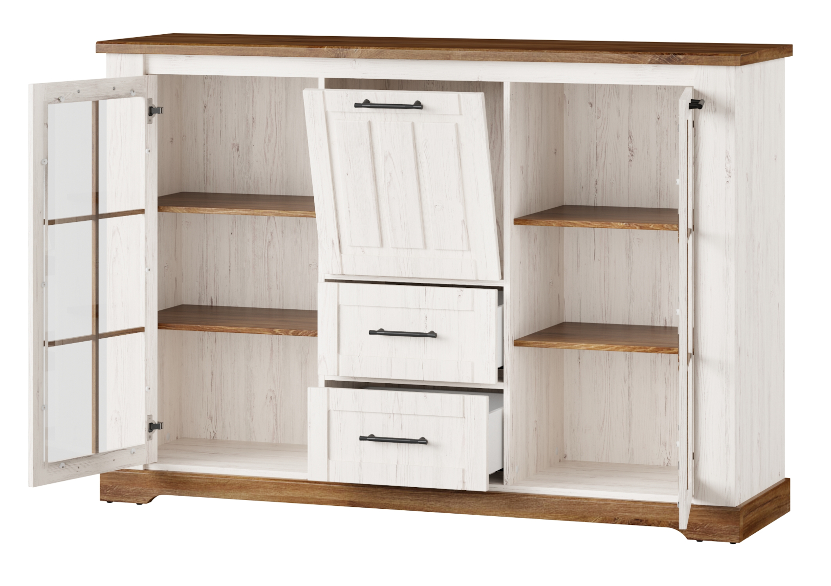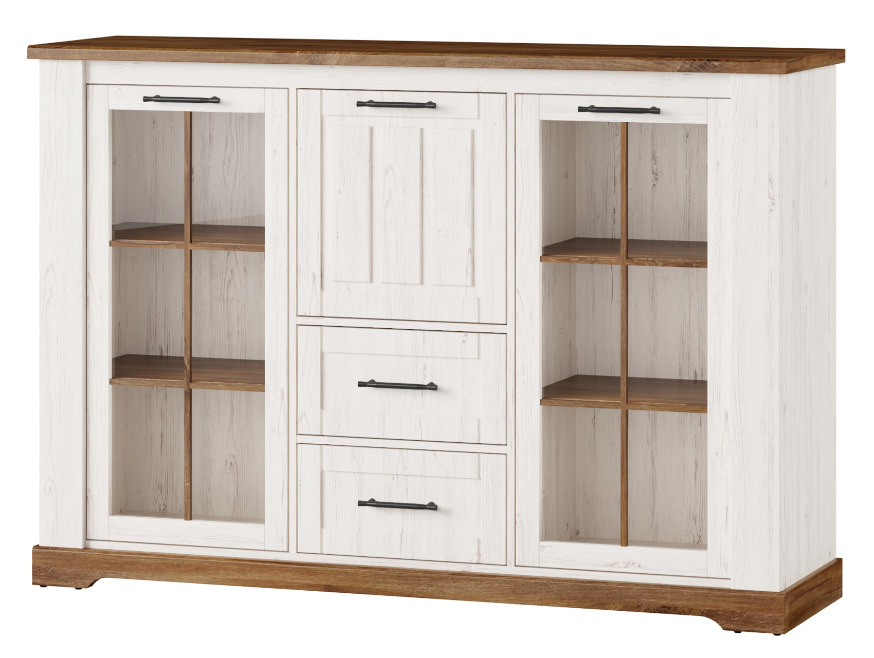 Jídelna Country vás zaujme svým jedinečným designem ve stylu francouzského Provence. Veškeré produkty jsou vyrobené z lamina a MDF dřevotřísky s tenkou vrstvou masivního dřeva, která je potažena fólii s přírodní dřevěným dekorem. Dvířka mají systém tichého dovírání a kovové úchyty.