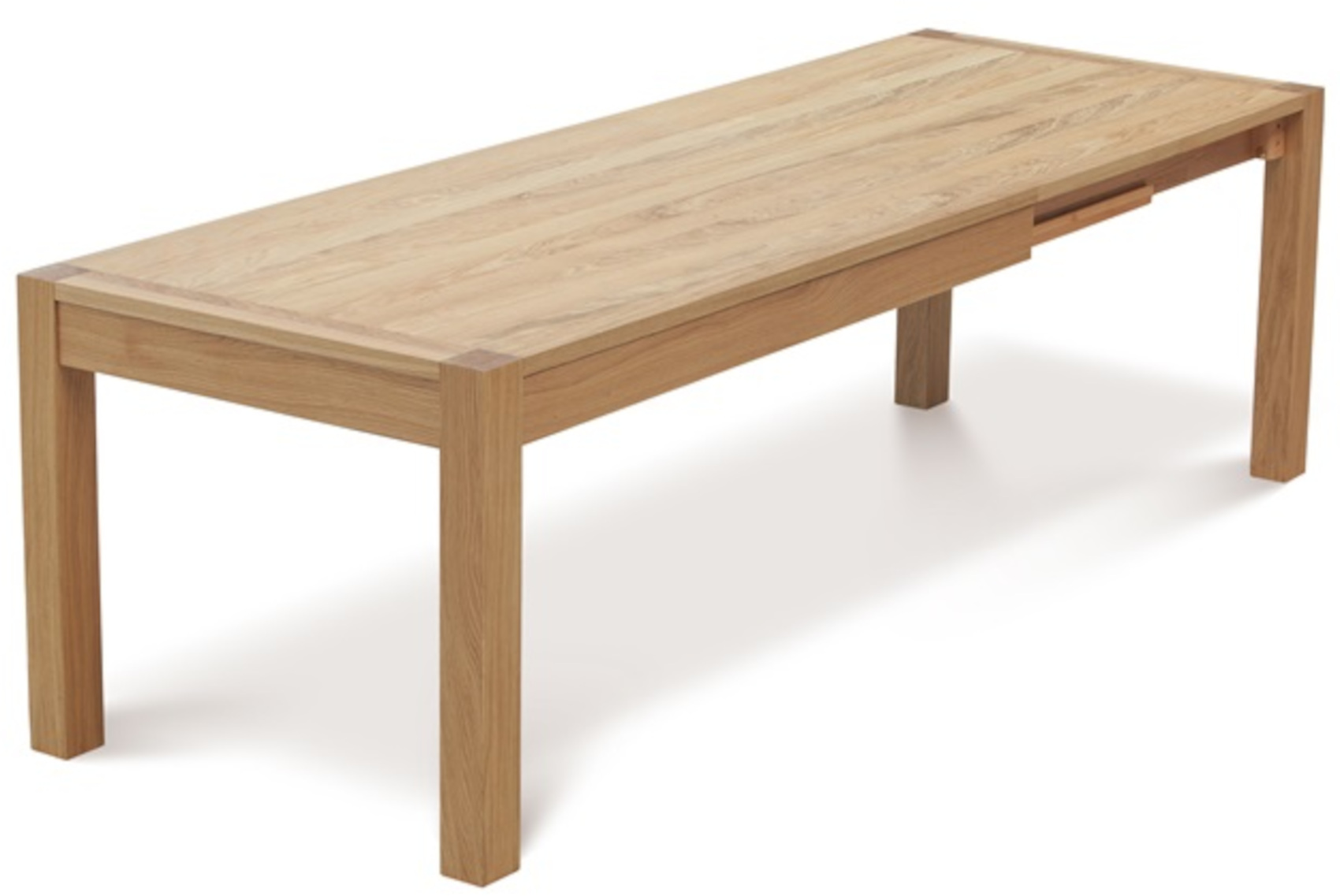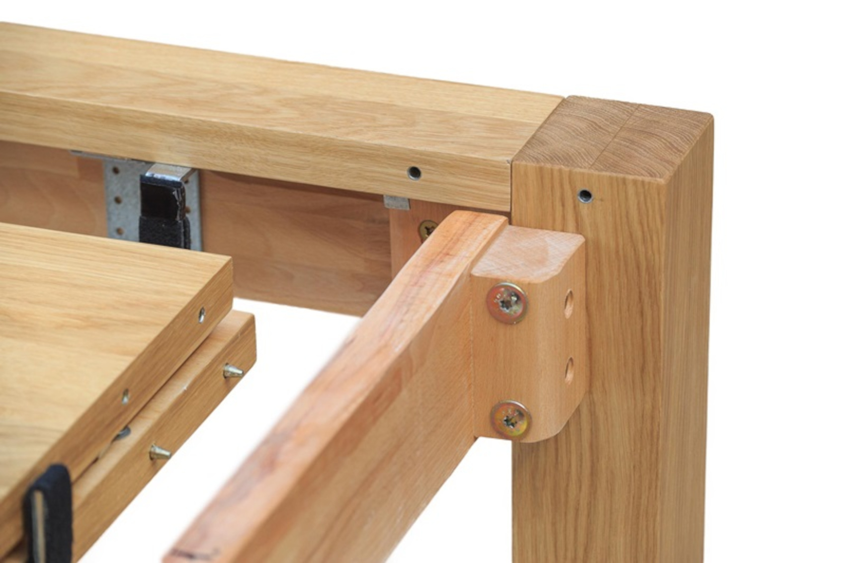 Díky kovovému kolejnicovému systému můžete stůl rozložit až do šířek od 140 cm do 240 cm nebo od 160 cm do 260 cm. Dřevěné vklady jsou vloženy pod horní deskou.