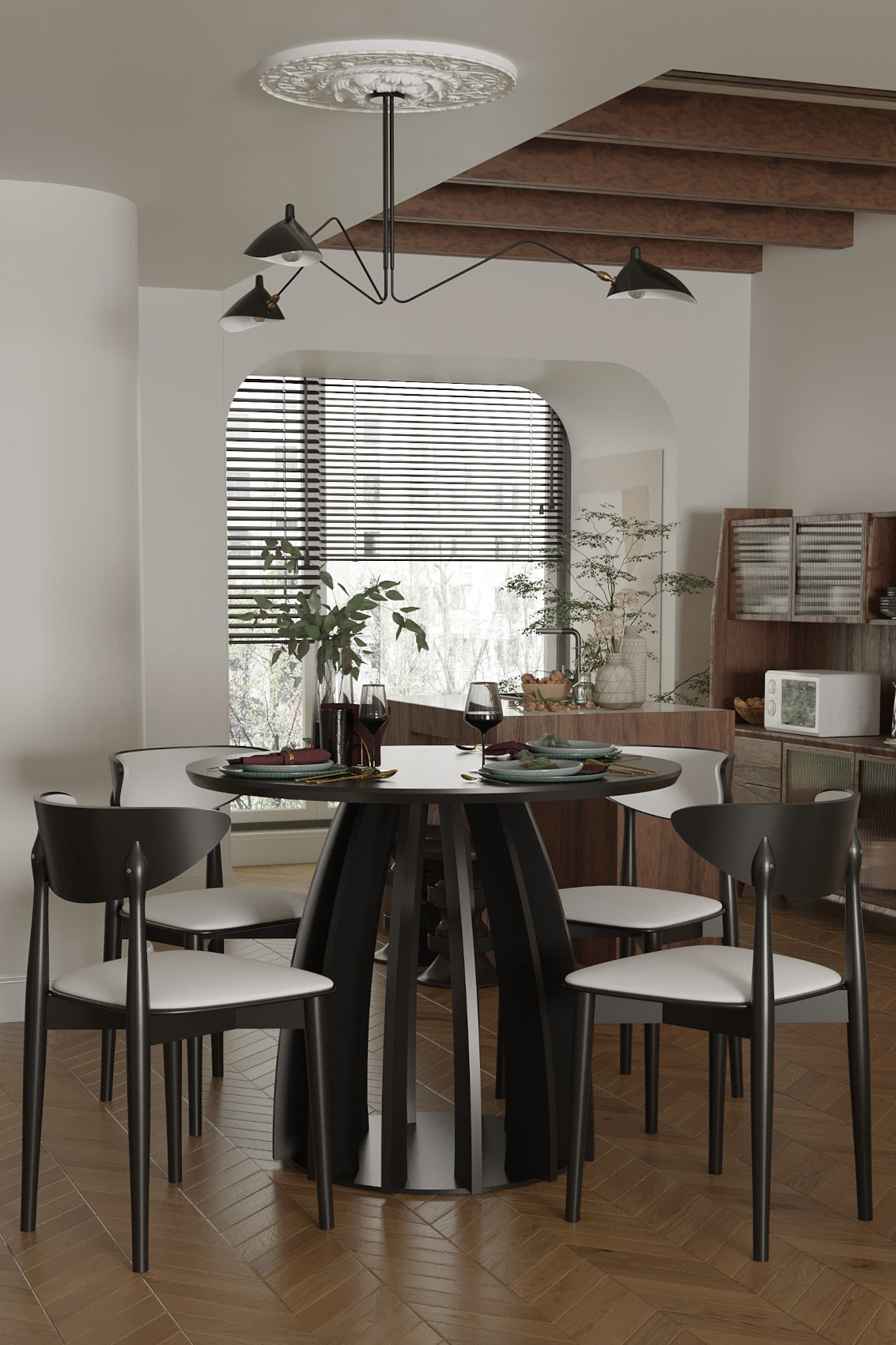 Kulatý jídelní stůl STF 220 má horní dýhovanou desku i moderní podnož vyrobenou z masivního bukového dřeva.