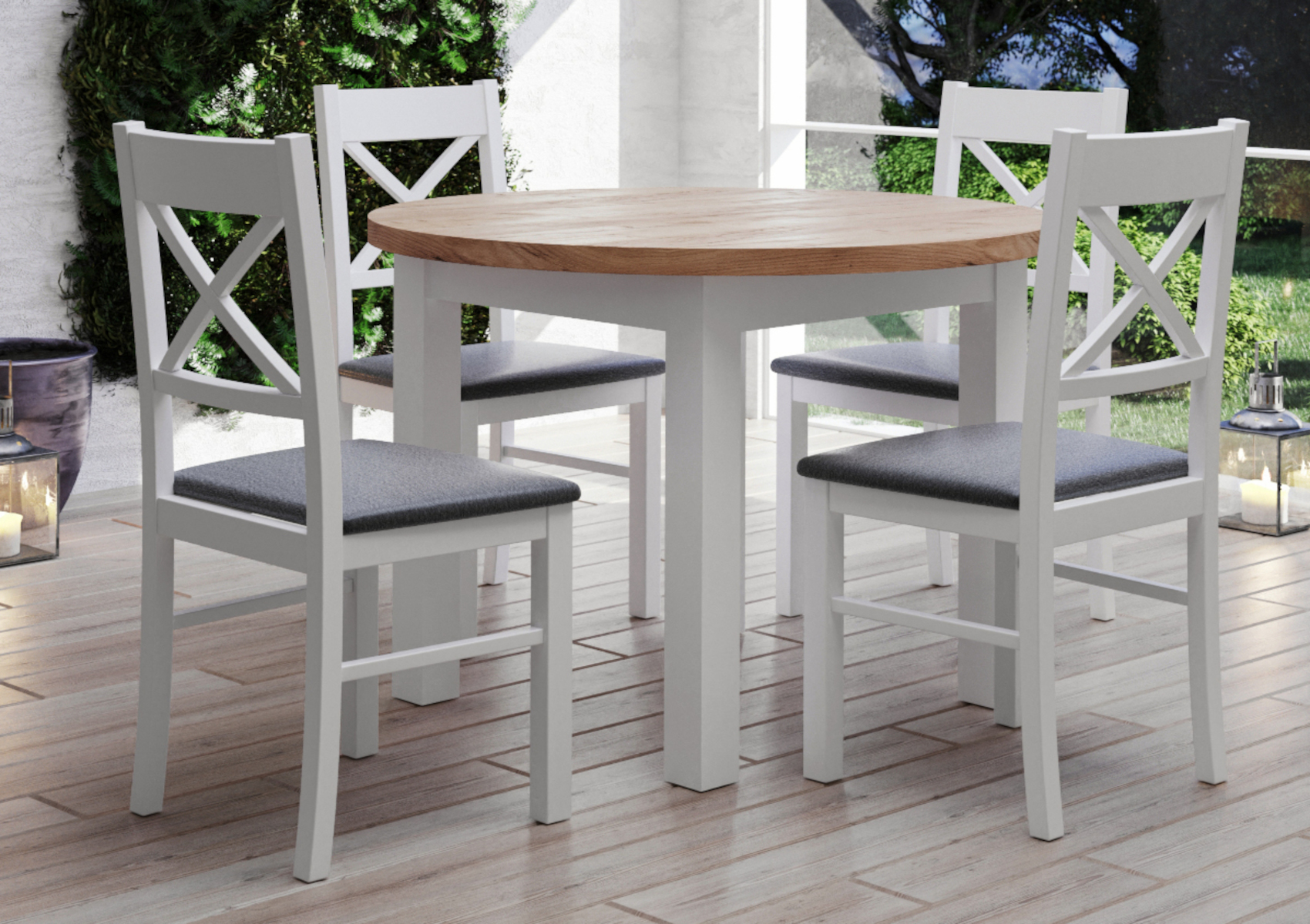 Jídelní sestava vás zaujme svým jednoduchým designem ve stylu francouzské Provence. Horní deska stolu je vyrobena z kvalitního lamina a podnož má z masivního bukového dřeva. Židle jsou také vyrobeny z masivního bukového dřeva a navíc očalouněny potahovou látkou.