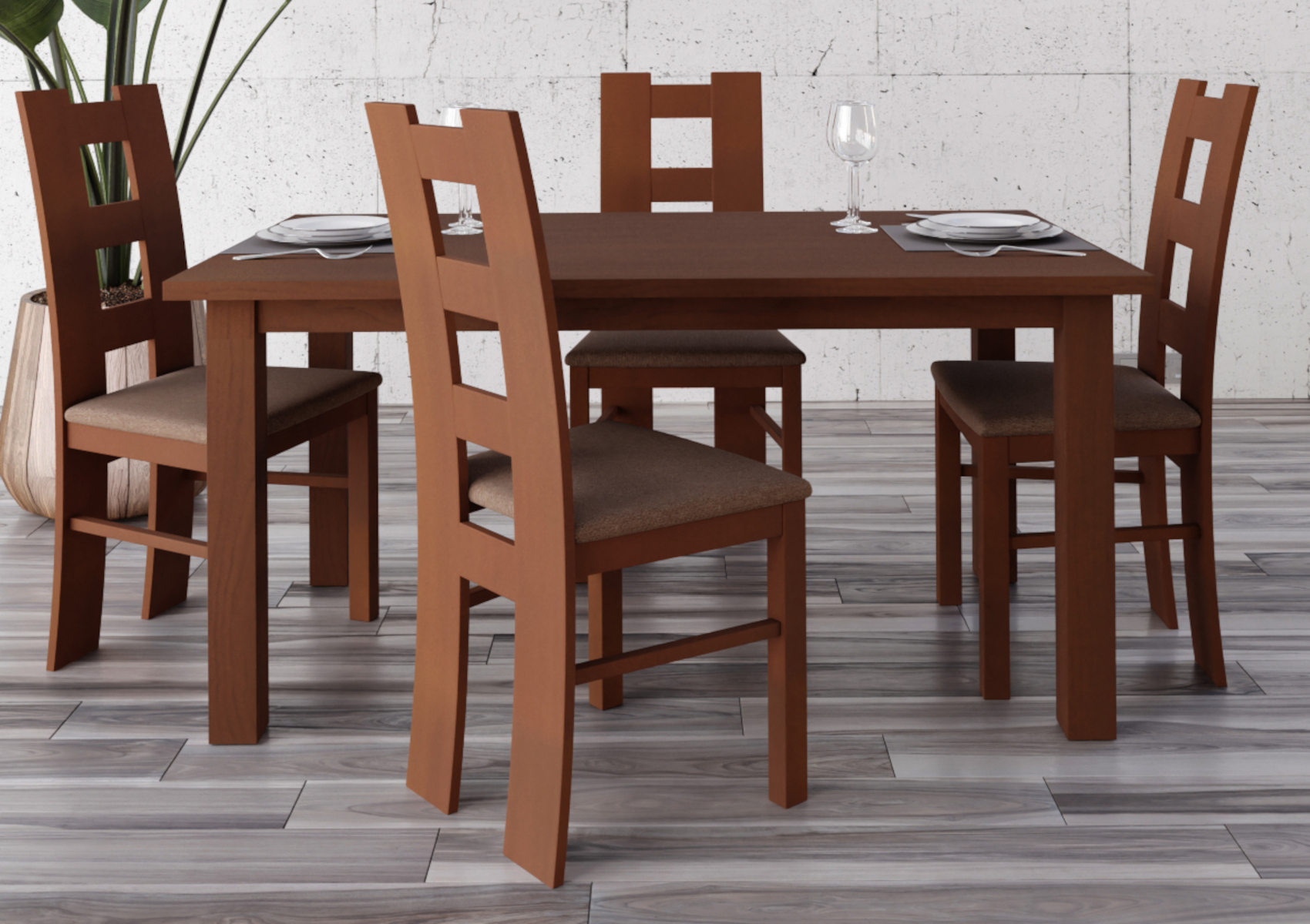 Jídelní sestava vás zaujme svým moderním designem. Horní deska stolu je vyrobena z kvalitního lamina a podnož má z masivního bukového dřeva. Židle jsou také vyrobeny z masivního bukového dřeva a navíc očalouněny potahovou látkou.