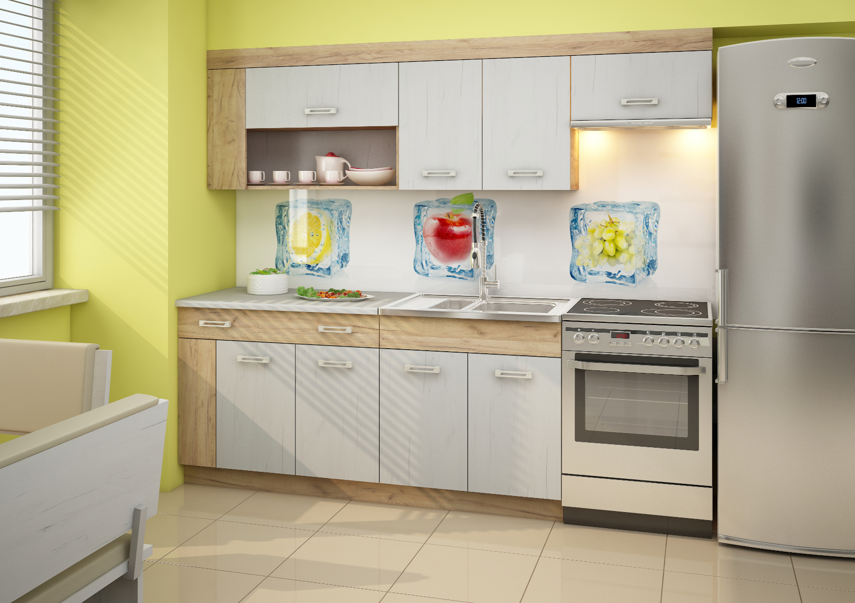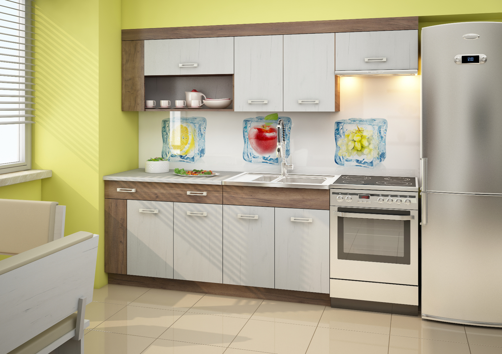 Součástí linky jsou 2 spodní skříňky a 3 horní skříňky. Zásuvky mají kovové pojezdy, úchytky jsou z tvrzeného plastu.