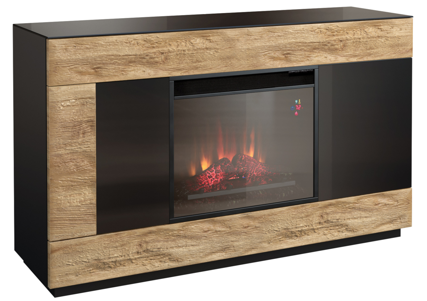 Elektrický krb je vyroben z přírodní dubové dýhy s černými lakovanými prvky. Horní deska je vyrobena z lakovaného černého skla Lacobel. Čtyřvrstvá technologie povrchového moření a lakování dává nábytku jedinečný design s výraznou strukturou lét masivního přírodního dřeva.