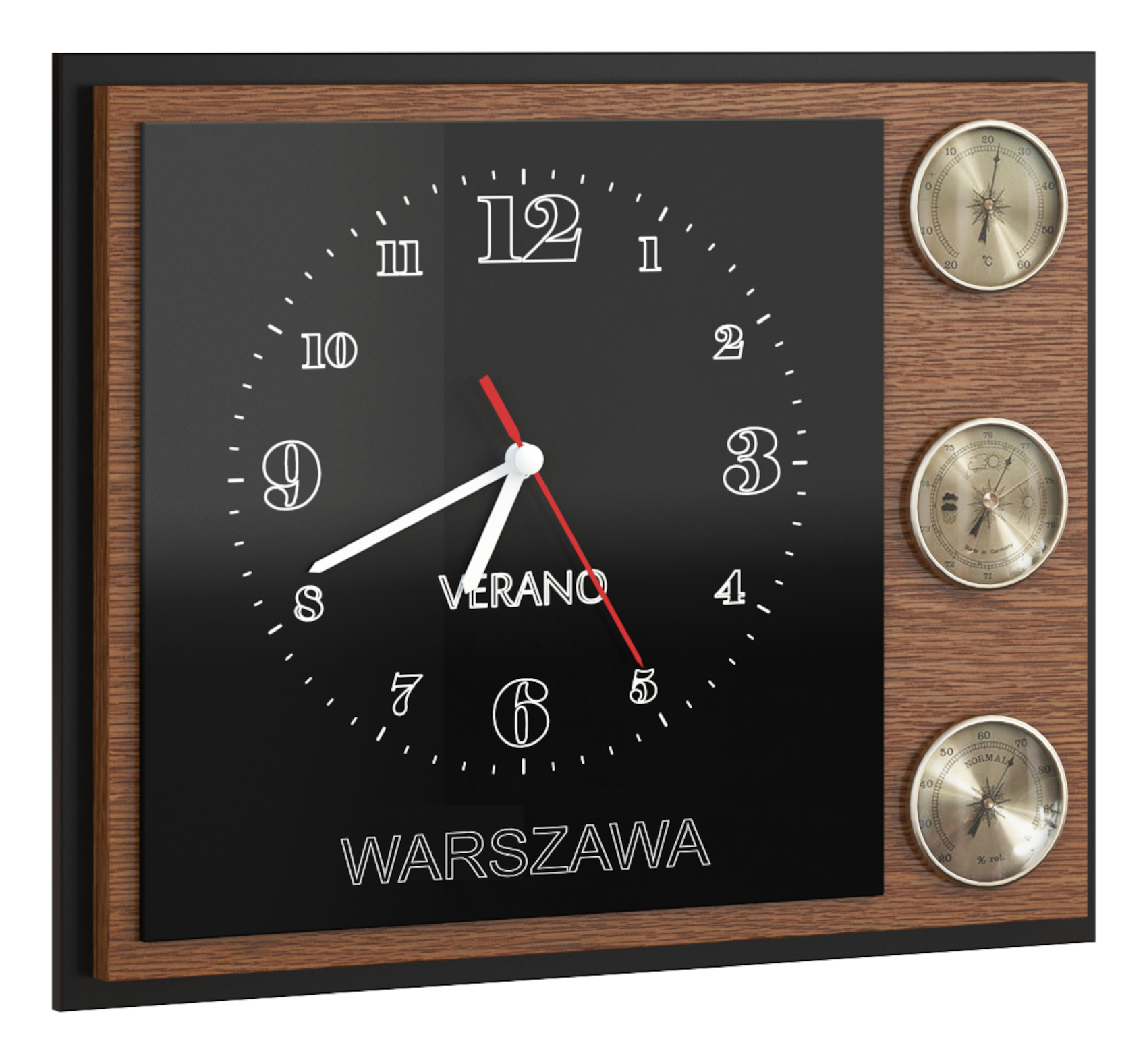 Meteorologická stanice Verano je vyrobena z přírodní dubové dýhy s černými lakovanými prvky a skla Lacobel. Čtyřvrstvá technologie povrchového moření a lakování dává nábytku jedinečný design s výraznou strukturou lét masivního přírodního dřeva.