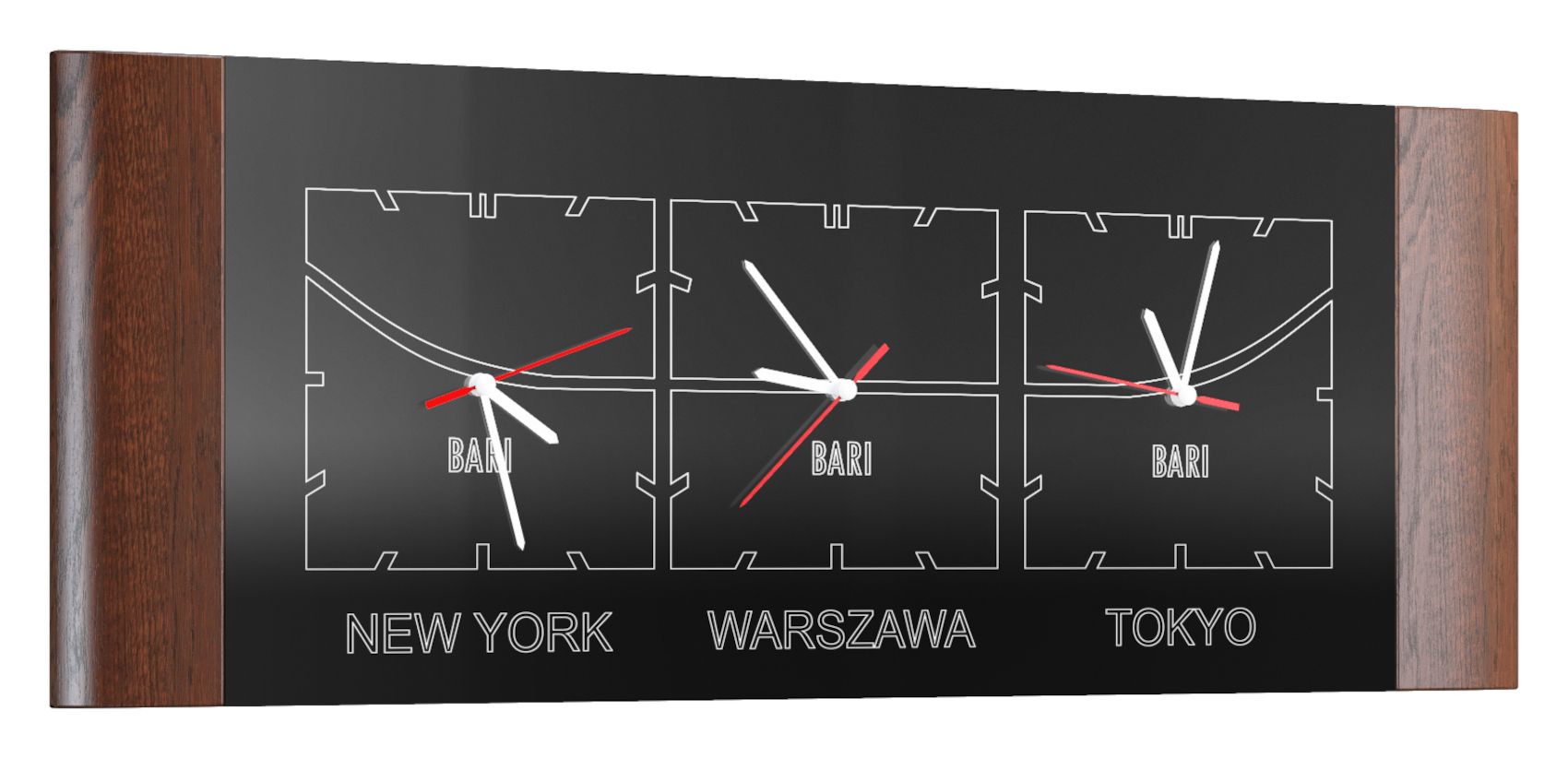 Hodiny mají 3 ciferníky, tudíž můžete sledovat čas až ve 3 světových městech. Nápisy pod nimi si můžete libovolně změnit - váš výběr nám prosím napište do poznámky.