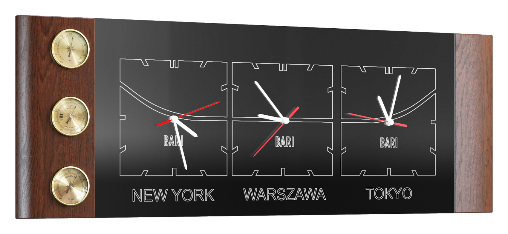 Hodiny mají 3 ciferníky, tudíž můžete sledovat čas až ve 3 světových městech, teploměr, barometr a hygrometr. Nápisy pod ciferníky lze libovolně změnit - váš výběr nám prosím napište do poznámky.