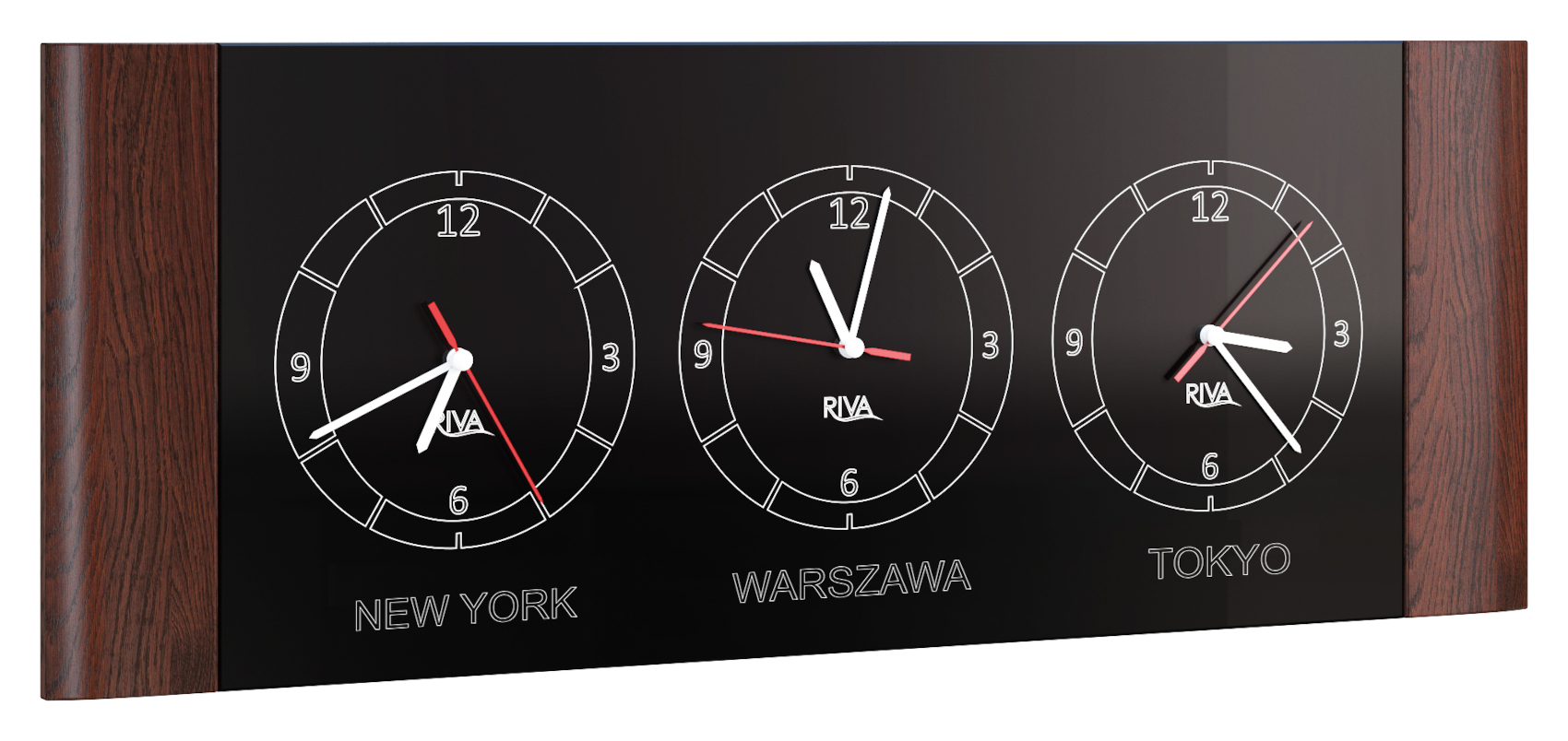 Luxusní trojité hodiny Riva jsou vyrobeny z přírodní dubové dýhy a skla Lacobel. Čtyřvrstvá technologie povrchového moření a lakování dává nábytku jedinečný design s výraznou strukturou lét masivního přírodního dřeva.