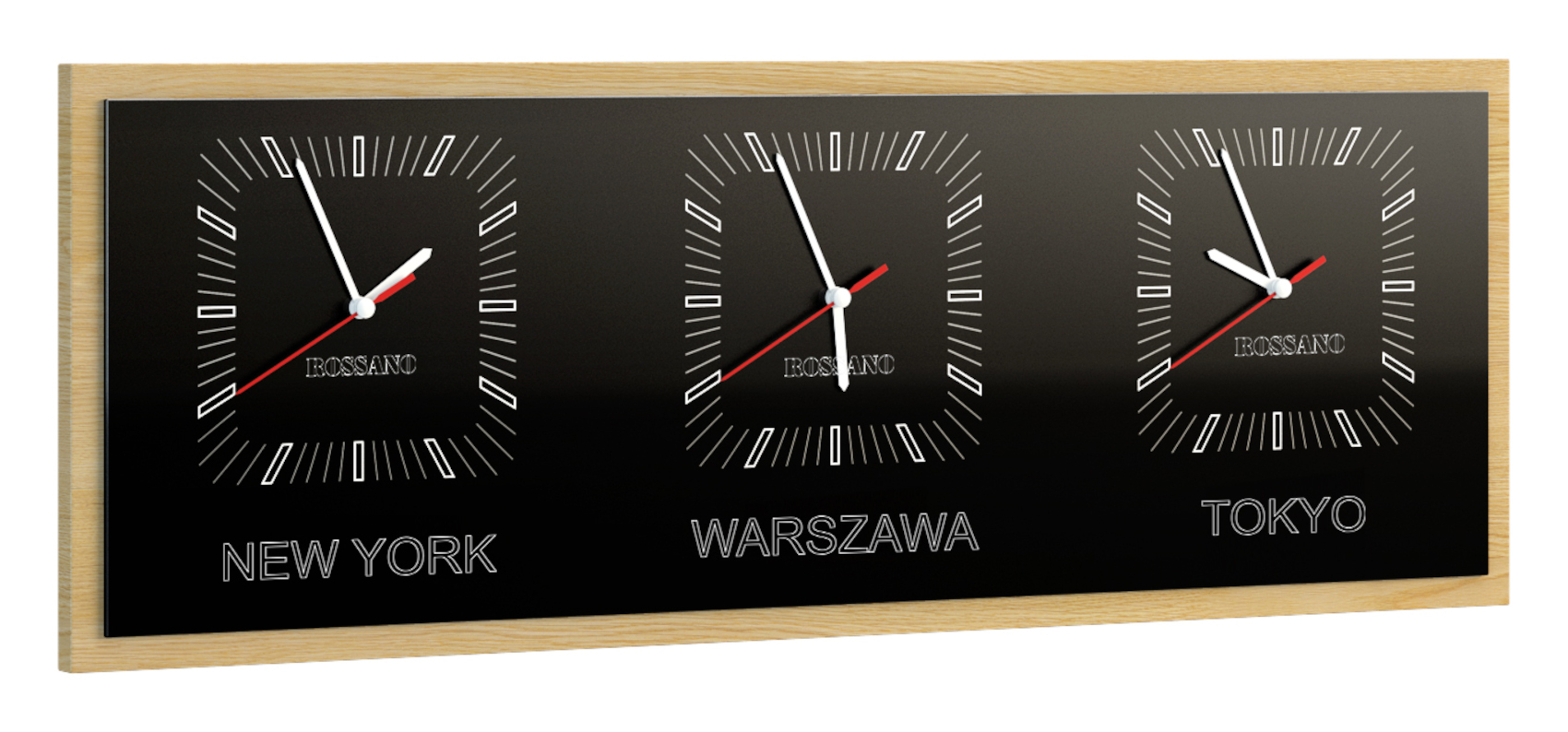 Závěsné hodiny mají 3 ciferníky, tudíž můžete pozorovat čas až ve třech světových městech. Nápisy lze libovolně změnit - váš výběr nám napište do poznámky.
