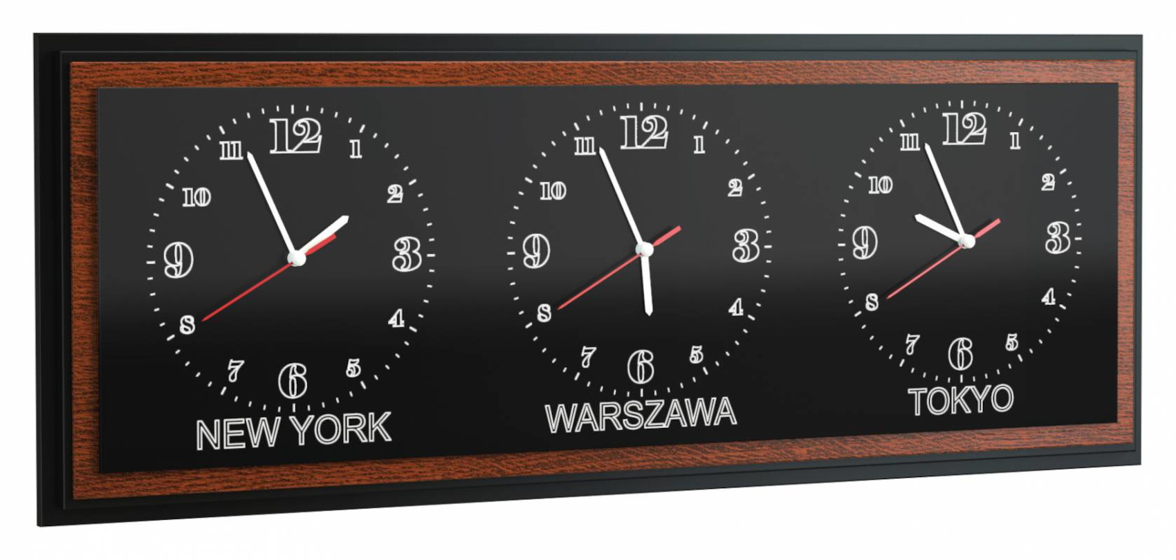 Součástí hodiny jsou 3 různé ciferníky, díky kterým můžete sledovat čas až na 3 různých místech. Pod ciferníky jsou nápisy, které lze libovolně změnit - vás výběr nám prosím napište do poznámky.